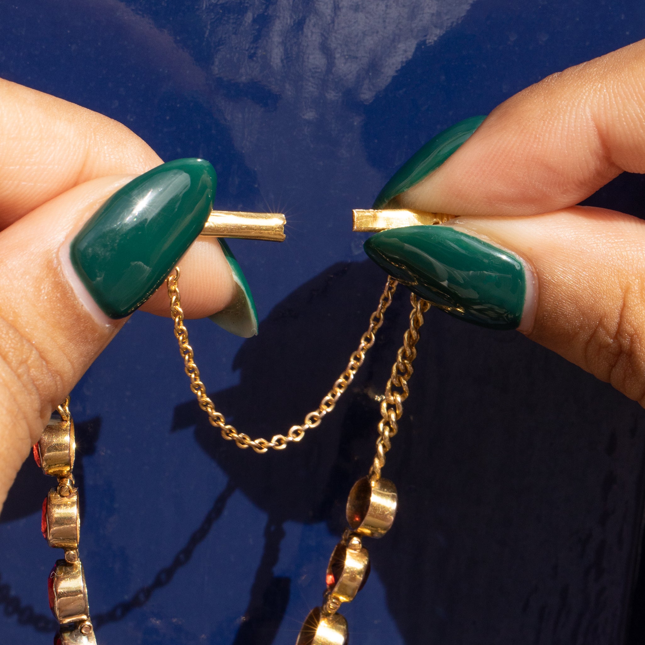 This antique Garnet bracelet is a classy piece, with graduating Garnets that will drape flatteringly as she adorns your wrist. Complete with robust curb links oozing honey hues and an antique barrel clasp to finish, this exquisite piece exemplifies the craftsmanship of the Victorian era!