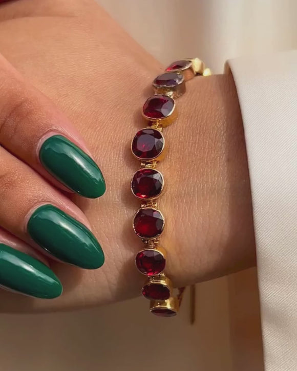 VERY GOOD! This is a divine antique 9ct Gold Garnet graduating bracelet! Each chery-red Garnet is bursting with colour and securely set, free from chips, and with facets that twinkle in the light. There is some age-related wear to one of two of the Garnets, but they are each secure and fit in well with the rest of the gems. The 9ct Gold links are secure, and the clasp allows you to wear this piece with confidence.