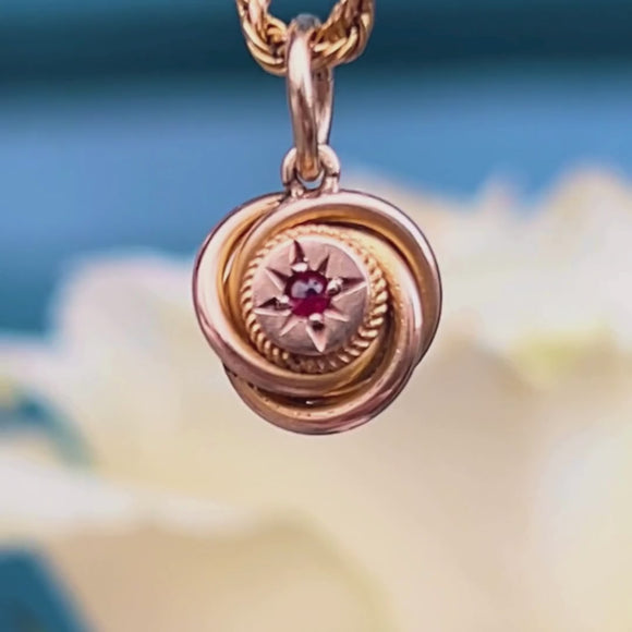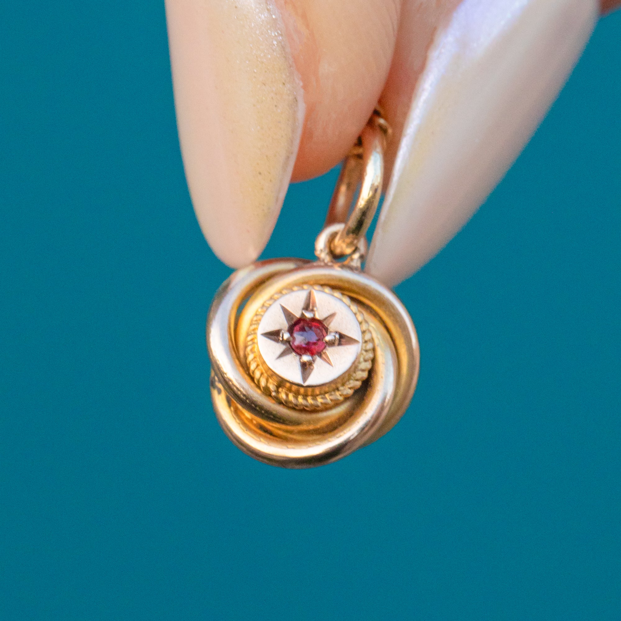 Symbolising everlasting love, this antique 9ct Gold Garnet knot charm is steeped in romantic sentiment! The elegant knot design is crafted entirely from solid 9ct Gold and is studded with a Garnet displayed within a star setting adding a celestial touch.