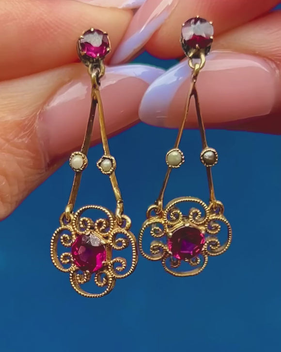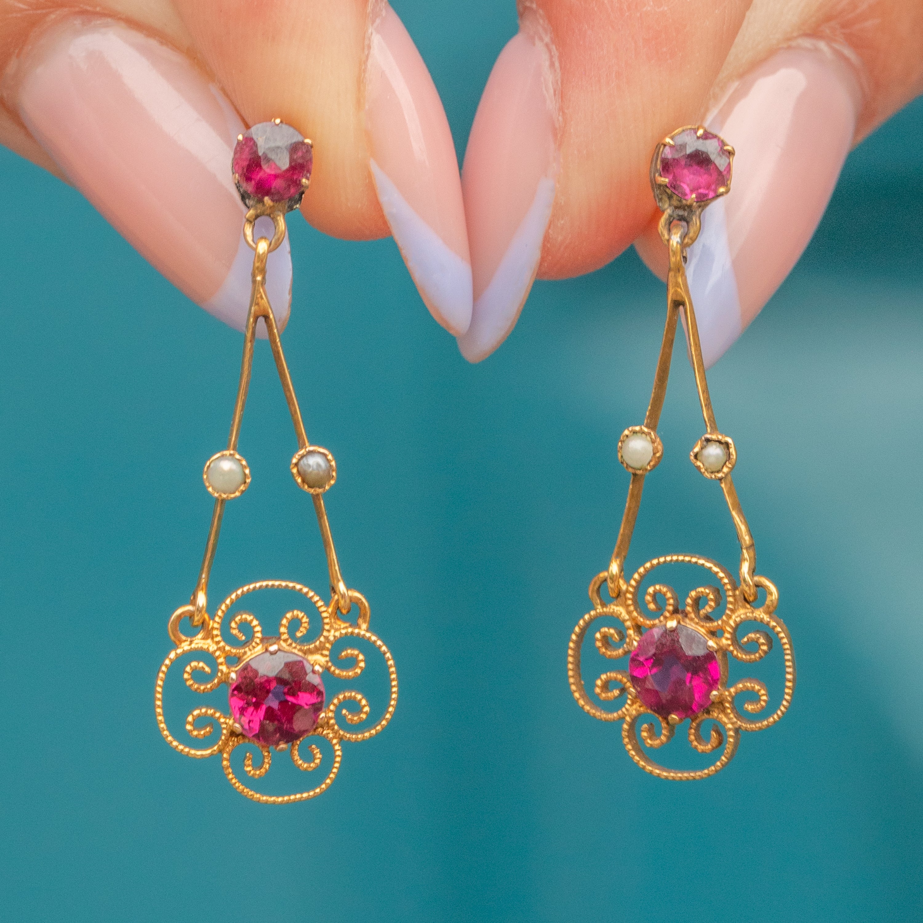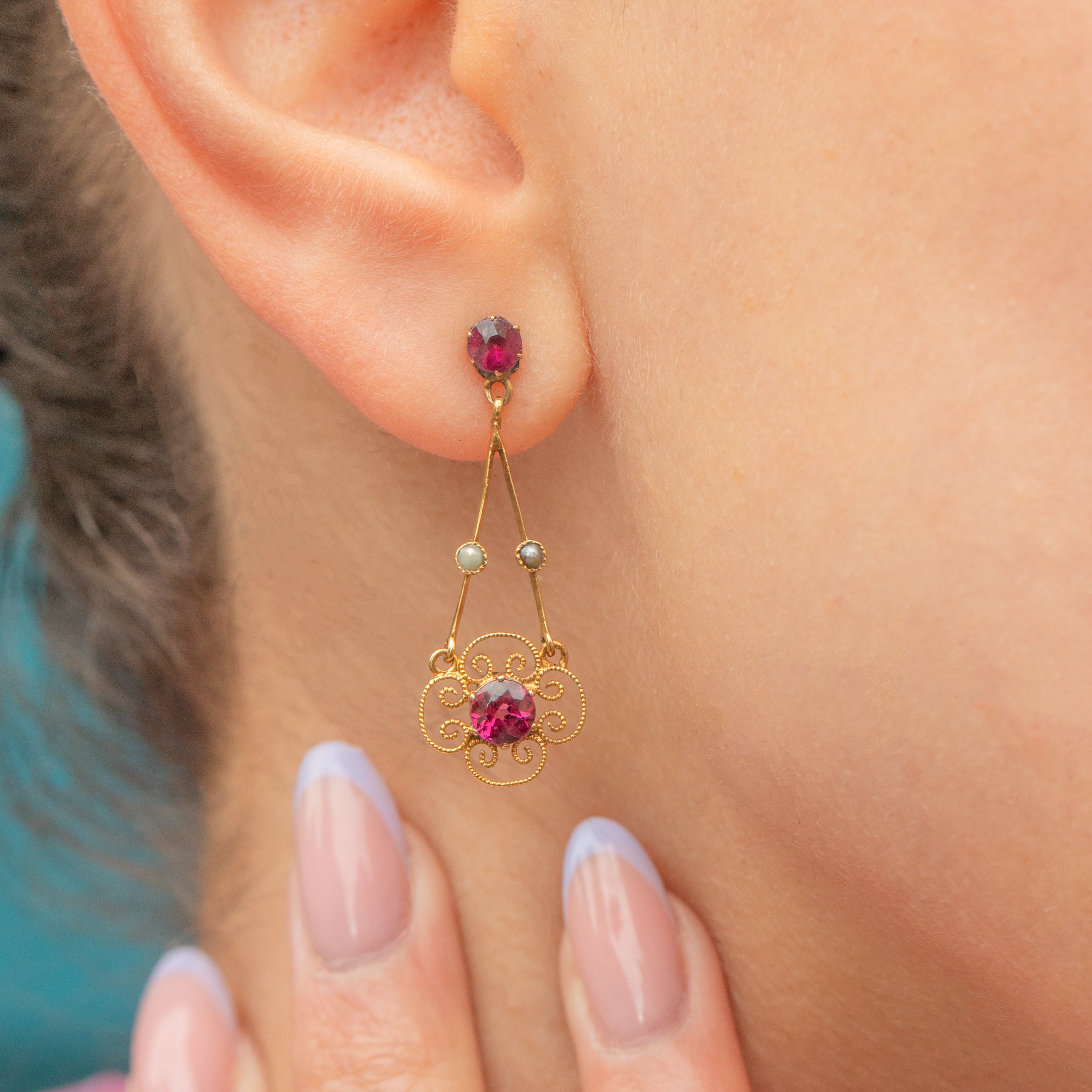 These stunning antique 9ct Gold Garnet Pearl floral drop earrings feature rich and bright berry-toned  Garnets surrounded by delicate Seed Pearls in a charming floral cluster design. Edwardian era and crafted in 9ct Gold, their elegant drop style adds graceful movement and timeless appeal.