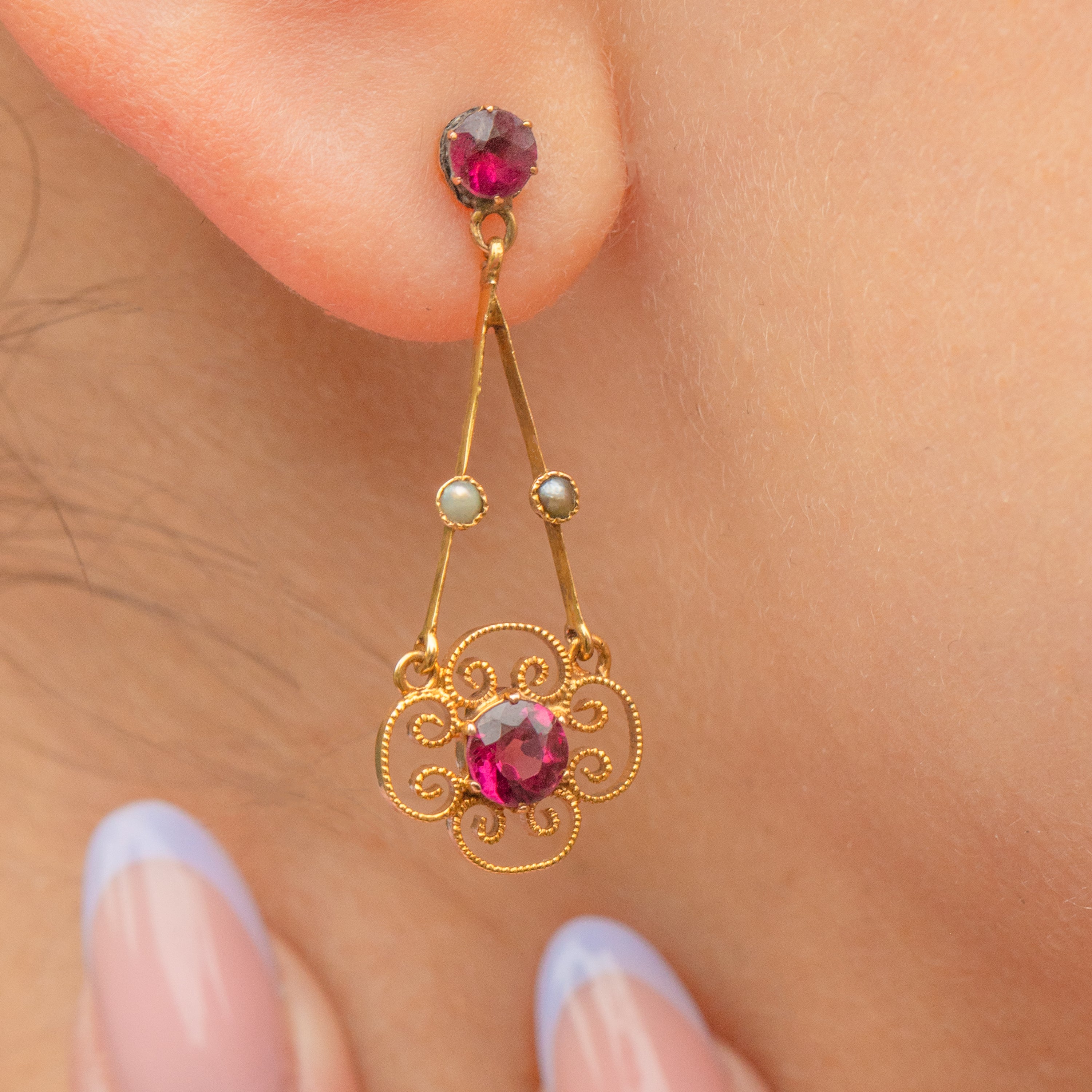 Overall, the earrings retain their enchanting beauty and period charm. The Garnets still glow with rich warmth, and the delicate Pearls lend a soft, romantic elegance. A graceful and wearable piece of history, perfect for lovers of antique treasures.