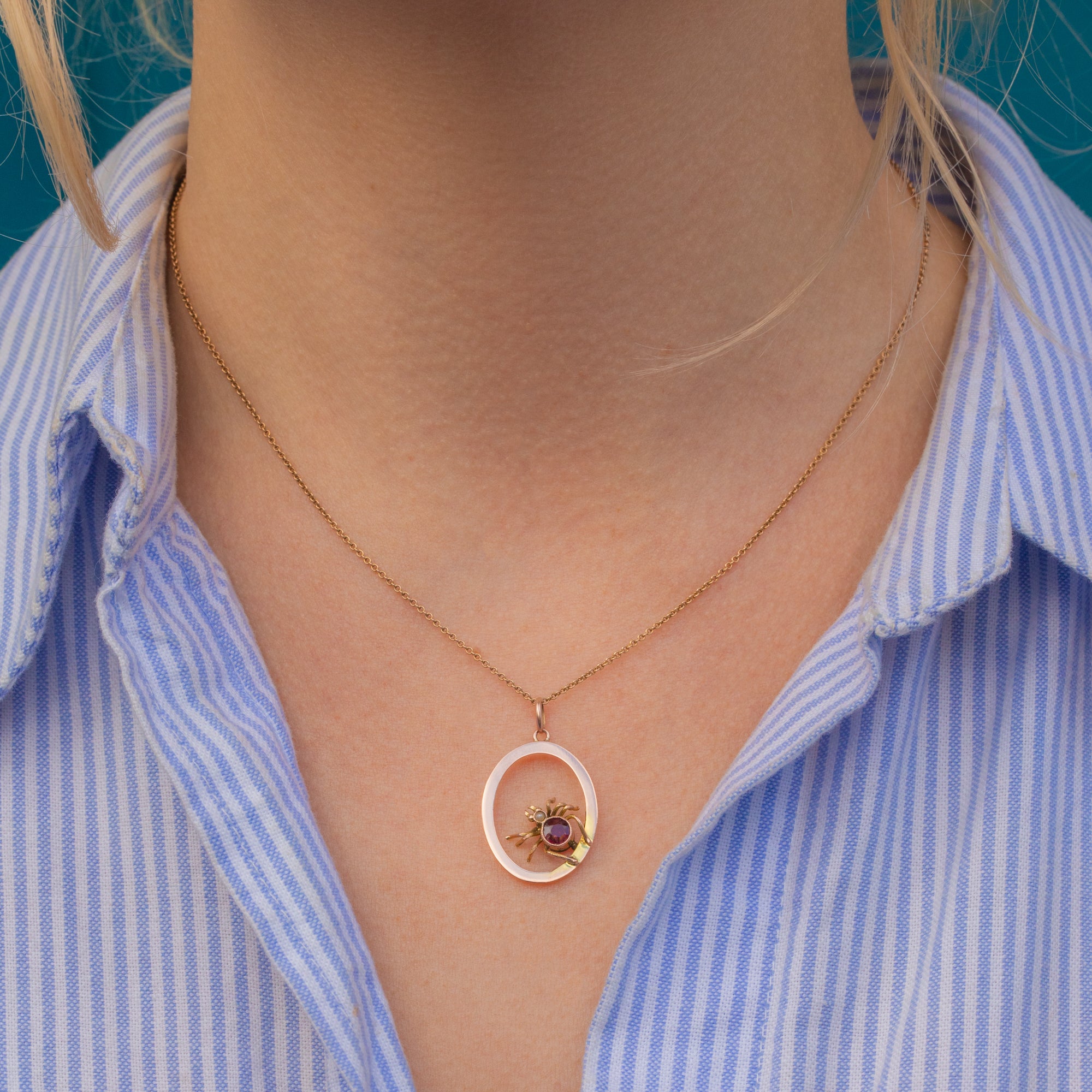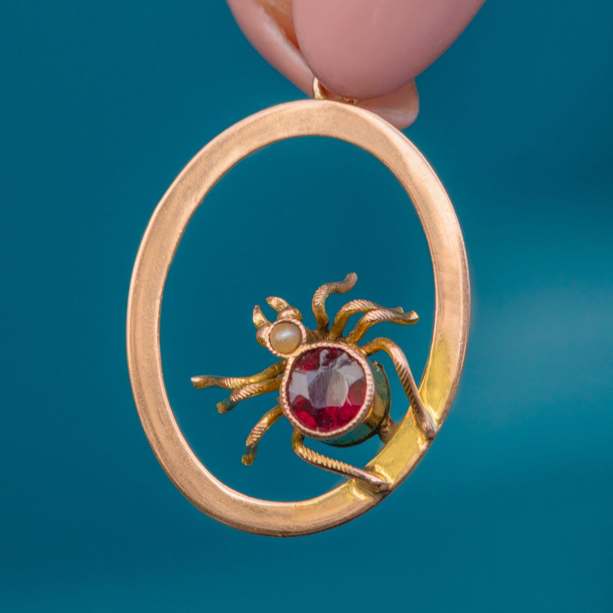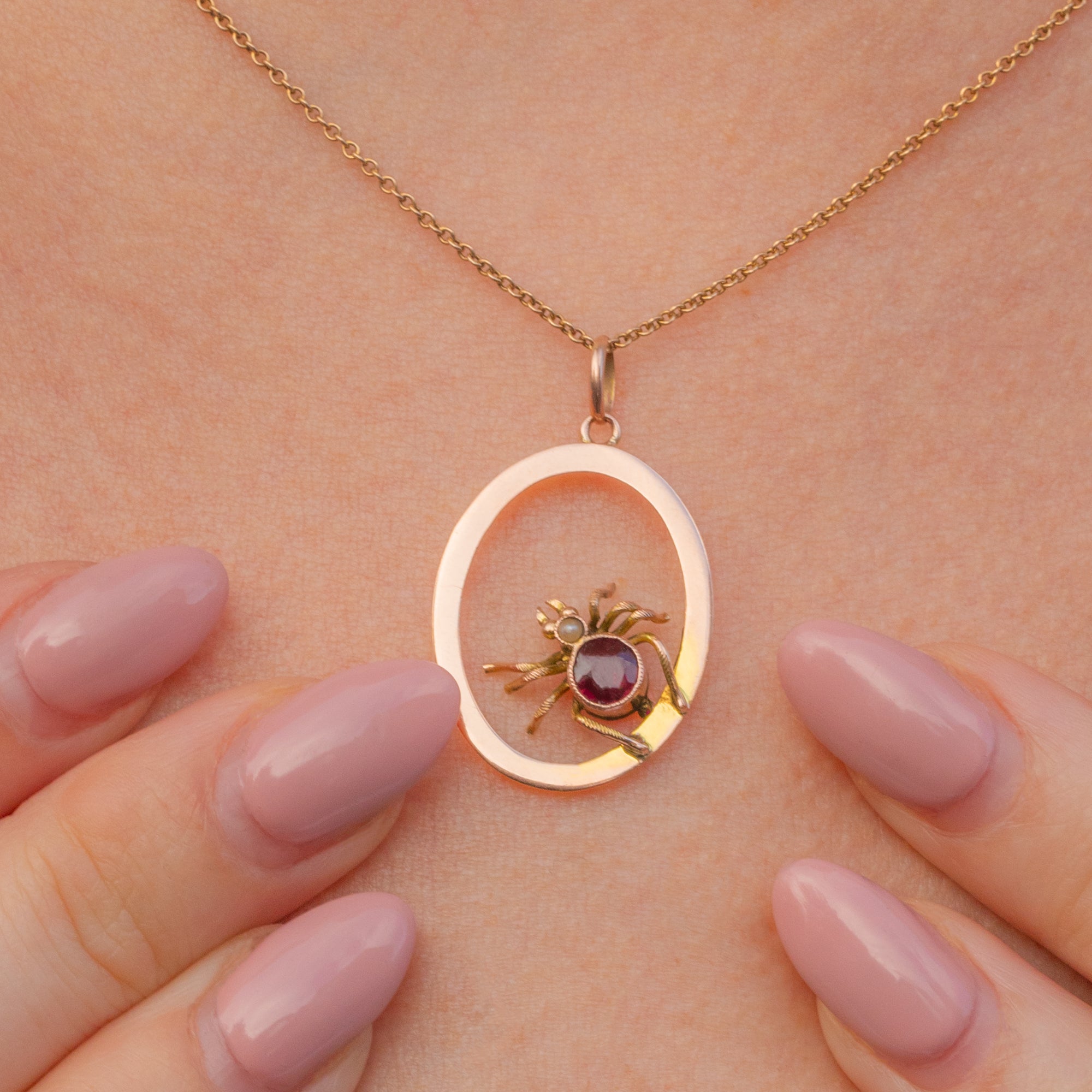 Exuding sangria red hues, her Garnet magically twinkles in the light. Such a wearable size, this Edwardian spider pendant will charm its way into becoming your new favourite piece. Who knew that spiders could look so desirable?!