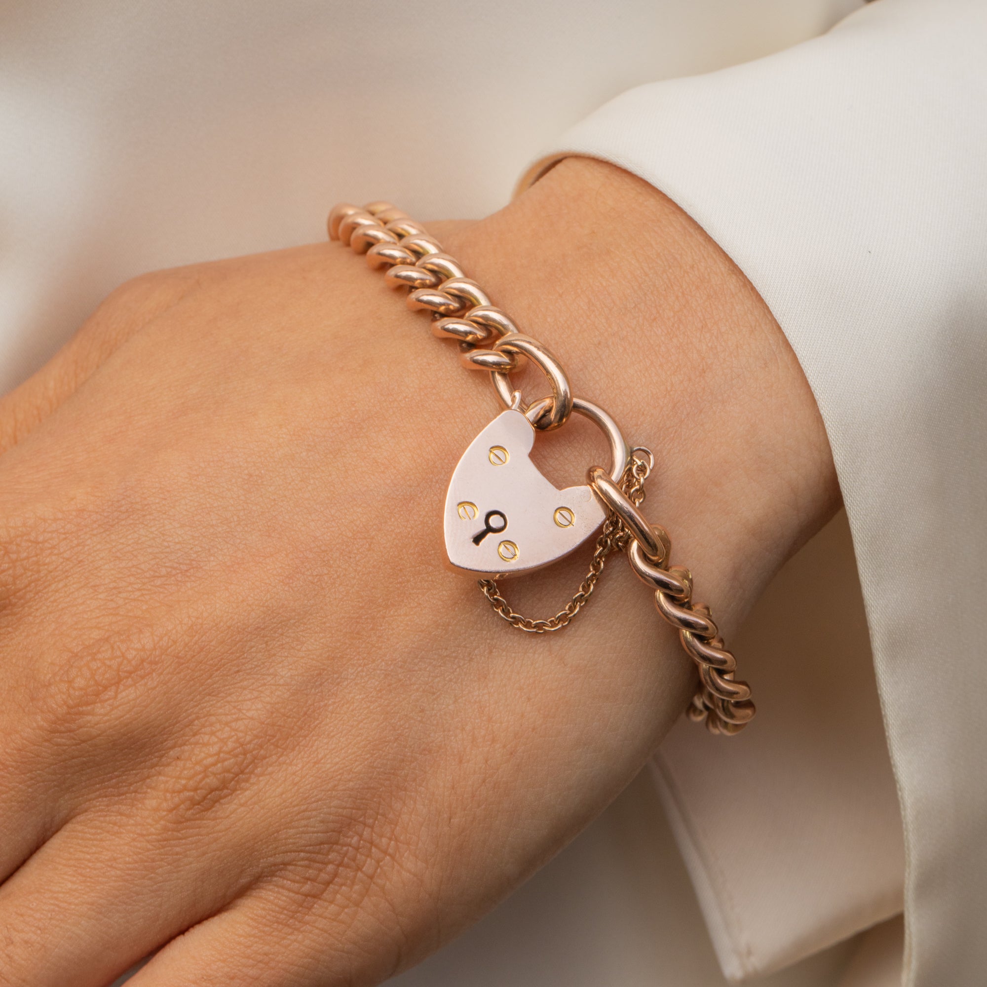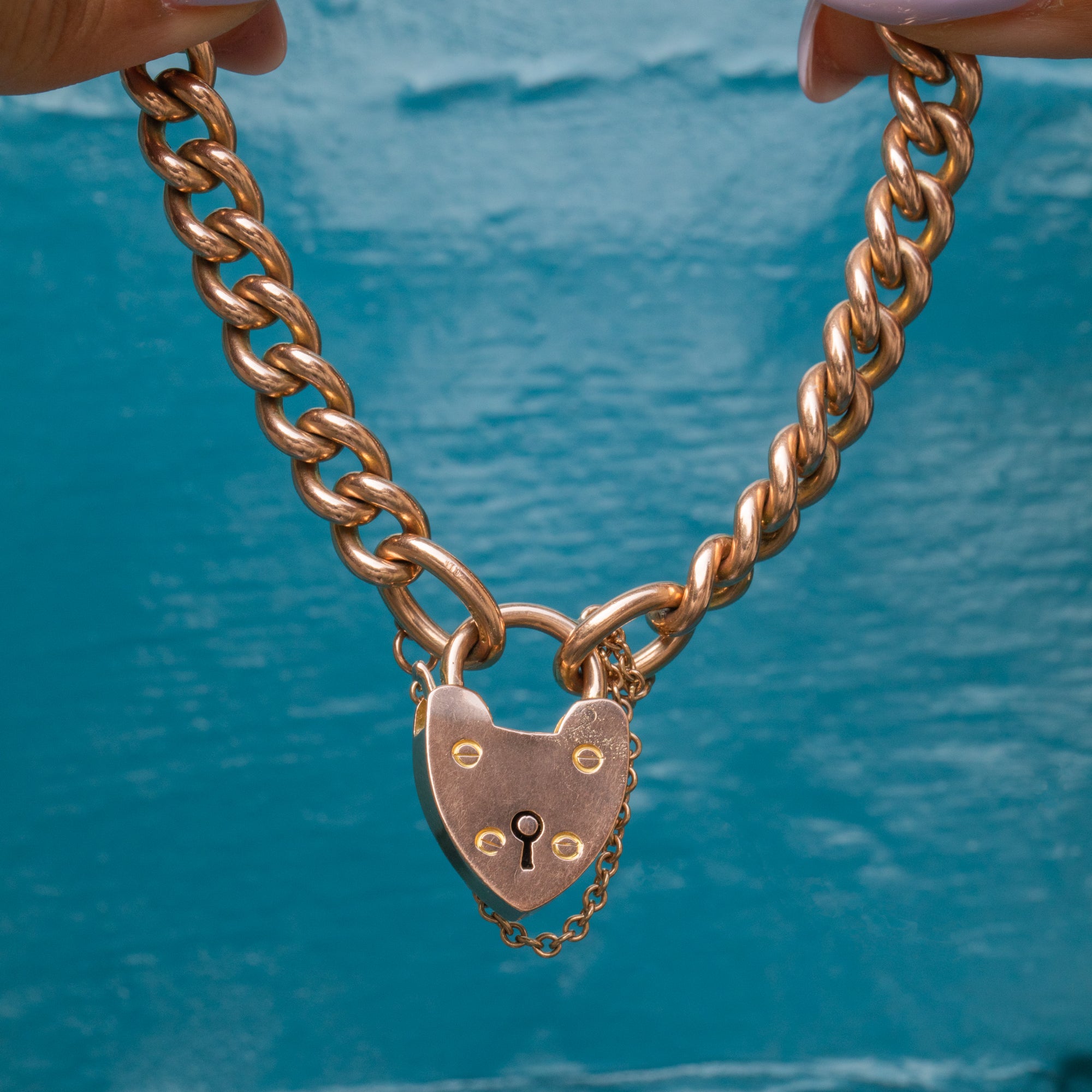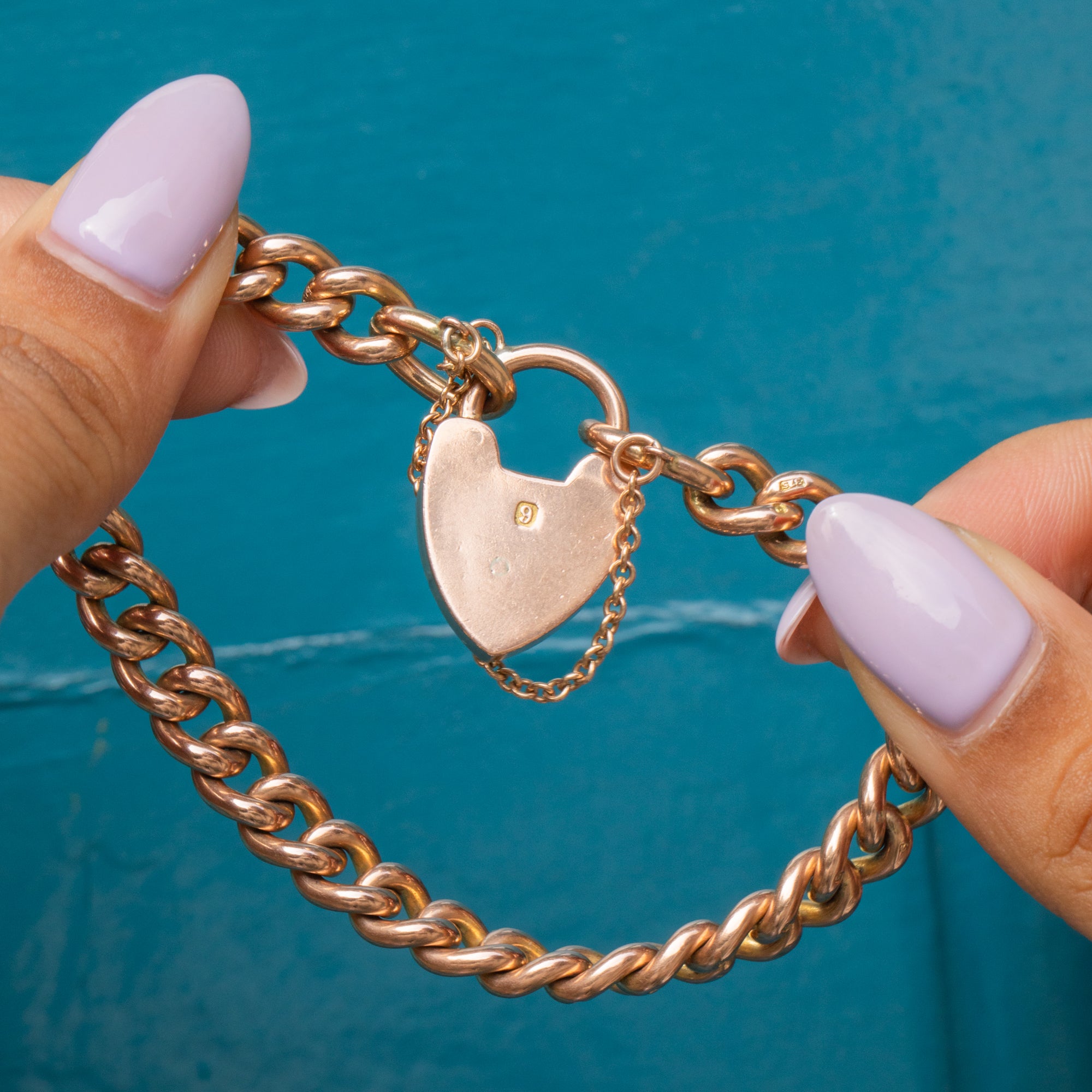 EXCELLENT. This antique 9ct Gold gate bracelet is in fabulous condition. The links are uniform with wonderful reflective qualities! There is a small circular solder mark on the back of the heart padlock, but this can only be seen under close inspection. With a padlock that shuts with a click and a safety chain, you will have no concerns as this antique Gold bracelet adorns your wrist!