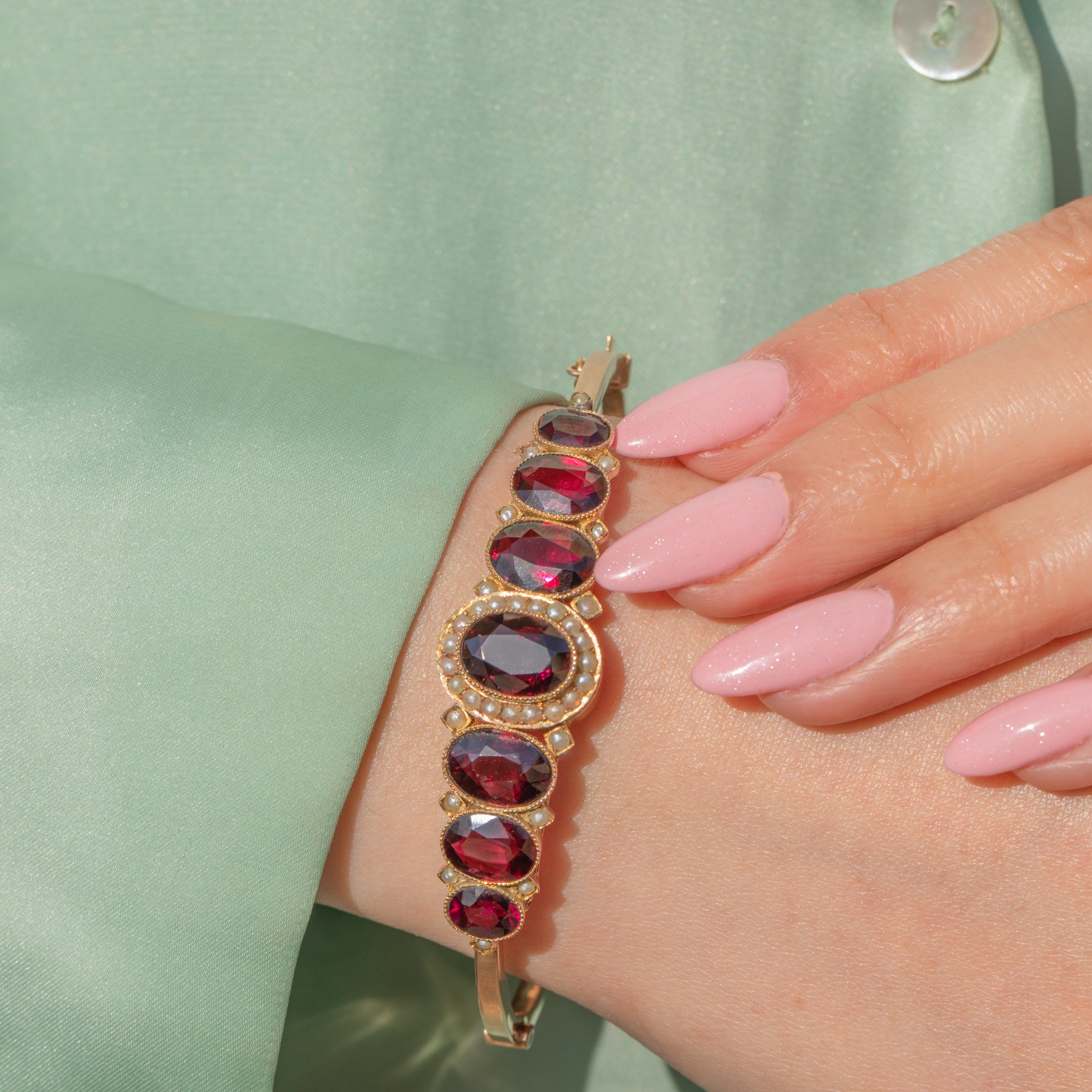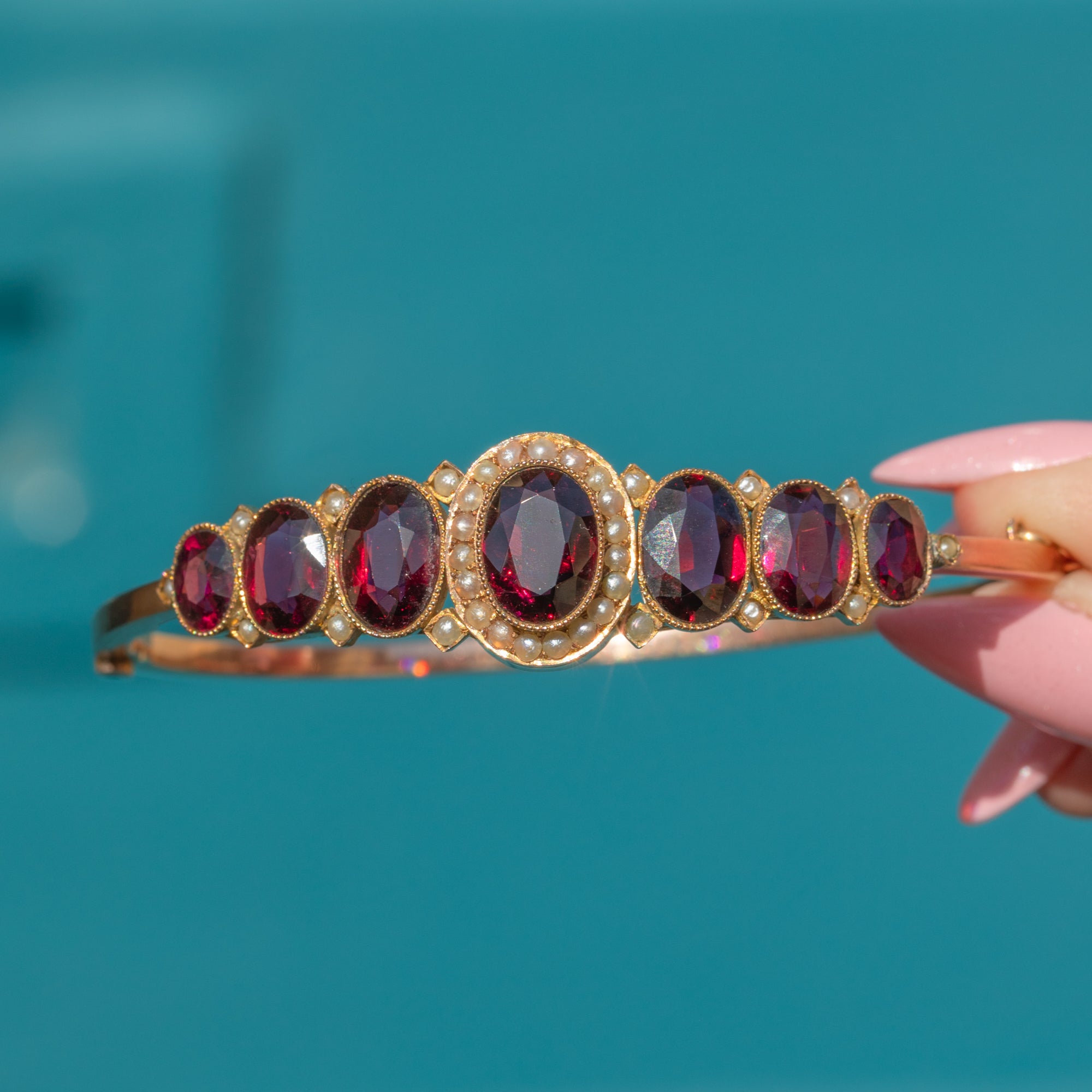 VERY GOOD: This antique 9ct Gold graduating Garnet and Pearl bangle is presented in very good condition. The Gold is bright and buttery and rhe Garnets are in wonderful condition, displaying a rich colour and vibrant sparkle. There is some light wear around the edges of the Garnets and the Gold, with a few minor cracks to the settings, though all stones remain secure. The Seed Pearls are all present with only some wear to their lustre, but they still retain a beautiful, subtle sheen. The bangle shuts securely and also includes a chic safety chain for reliable, secure wear. She is ready to be worn and enjoyed for years to come!