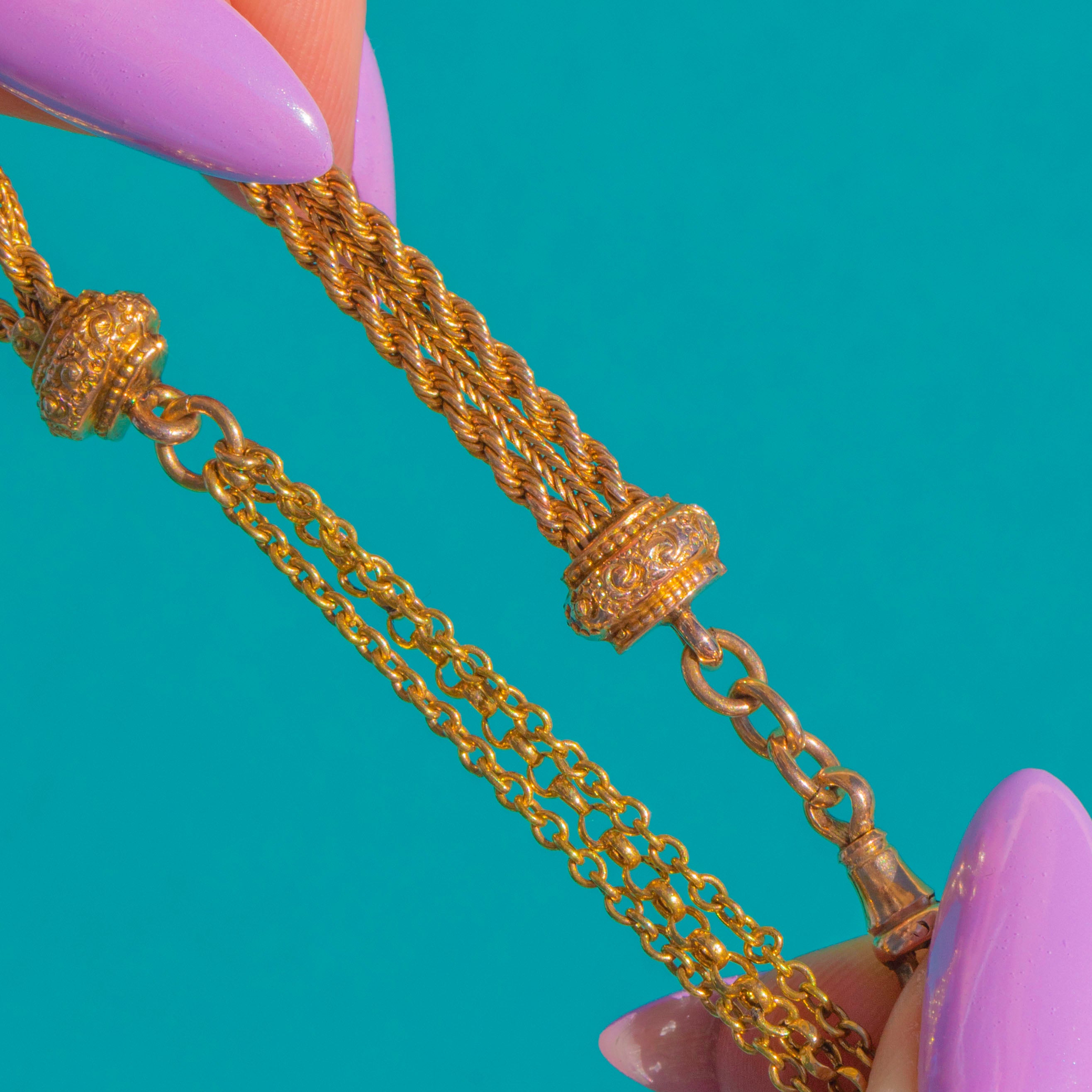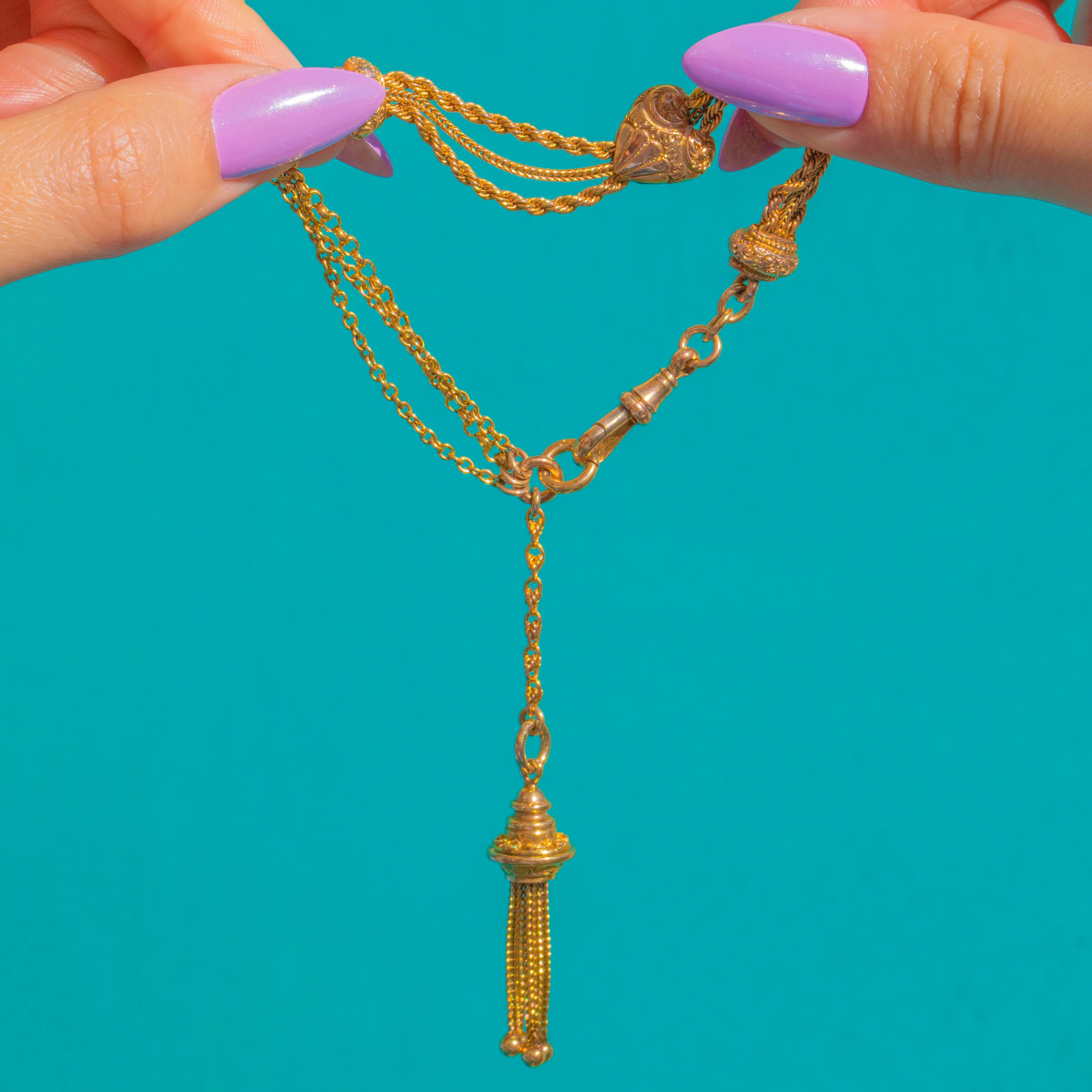 A quintessential Victorian treasure, this 9ct Gold Albertina bracelet pairs delicate intricacy with romantic charm. Multiple fine chains are gathered into ornate chased terminals, culminating in a lively tassel that sways with every movement. The warm, buttery hue of the Gold enhances the sculpted foliate details and beaded accents throughout.