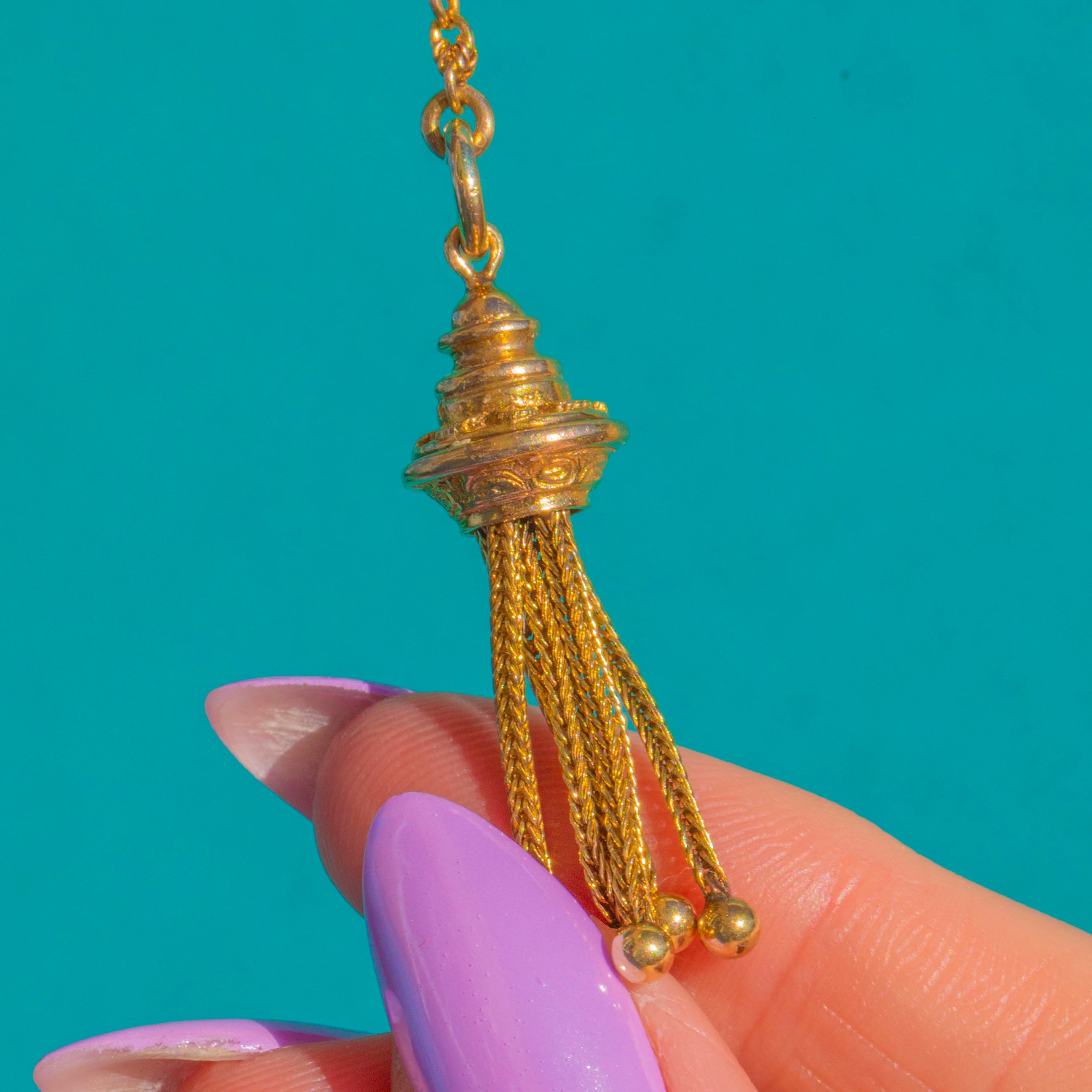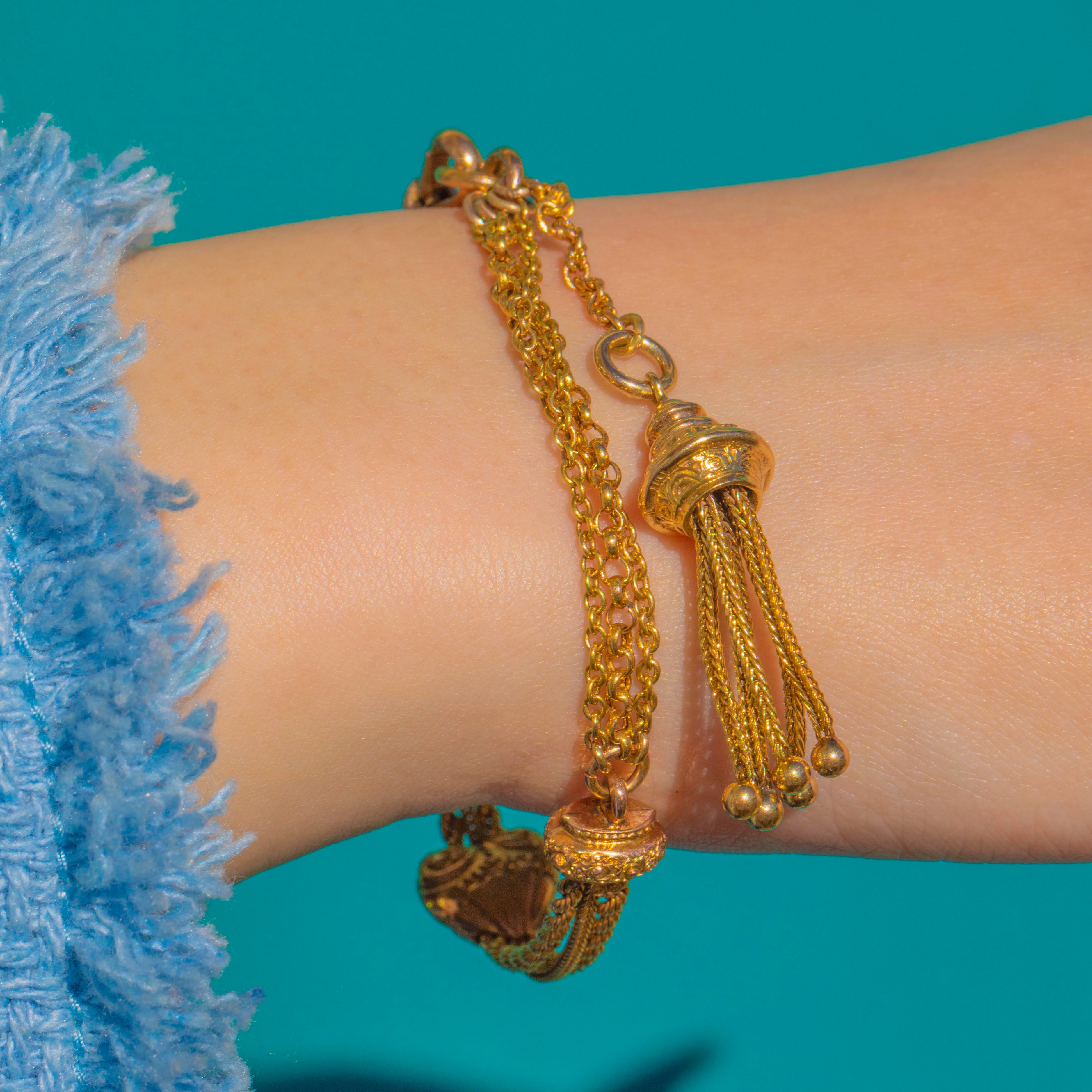 EXCELLENT: The Gold surfaces are bright with only light surface wear and a gentle patina in the recesses. All chains, slider, dog clip and tassel strands are secure and function smoothly, with no visible repairs. Overall, the bracelet has been very well cared for and is ready to wear and enjoy.