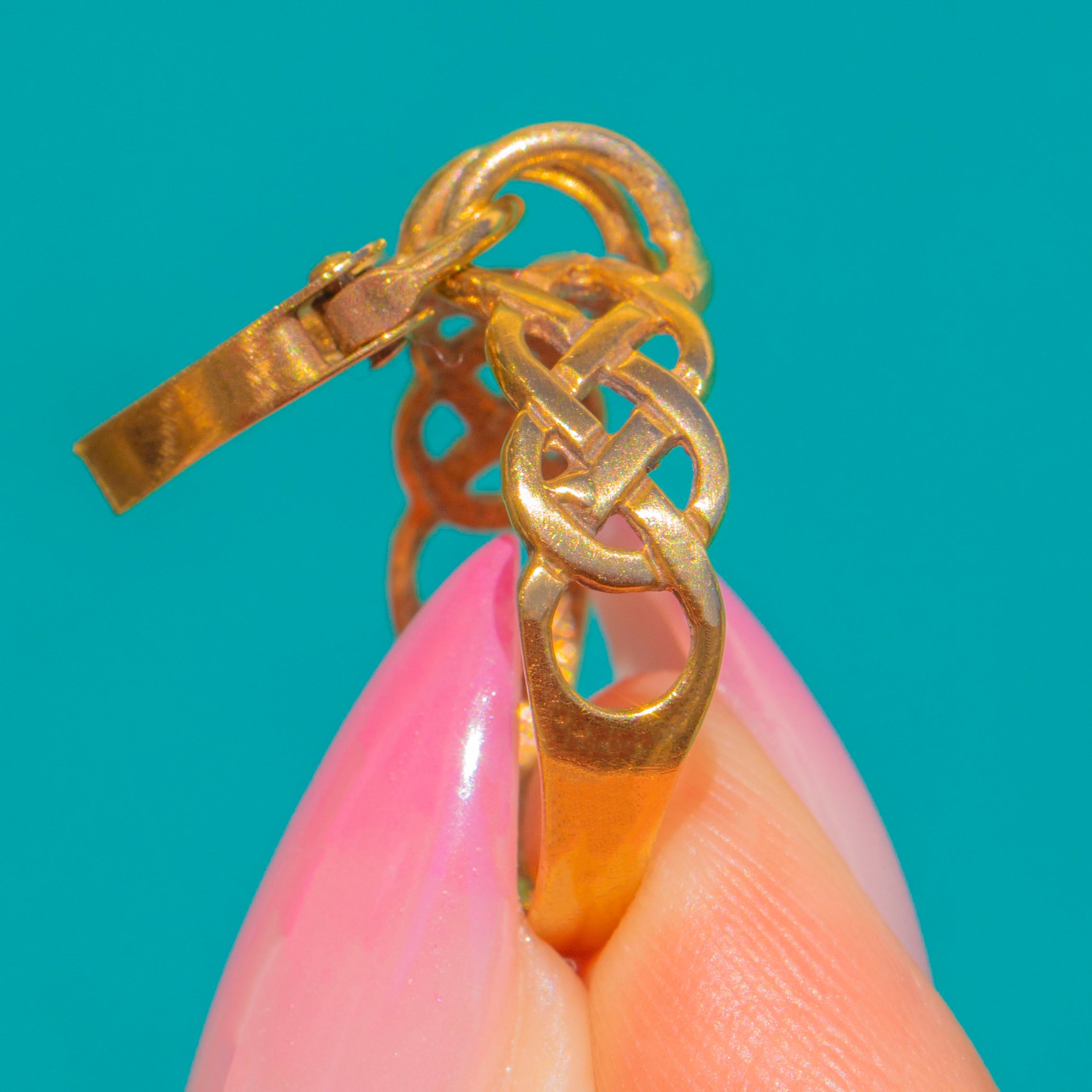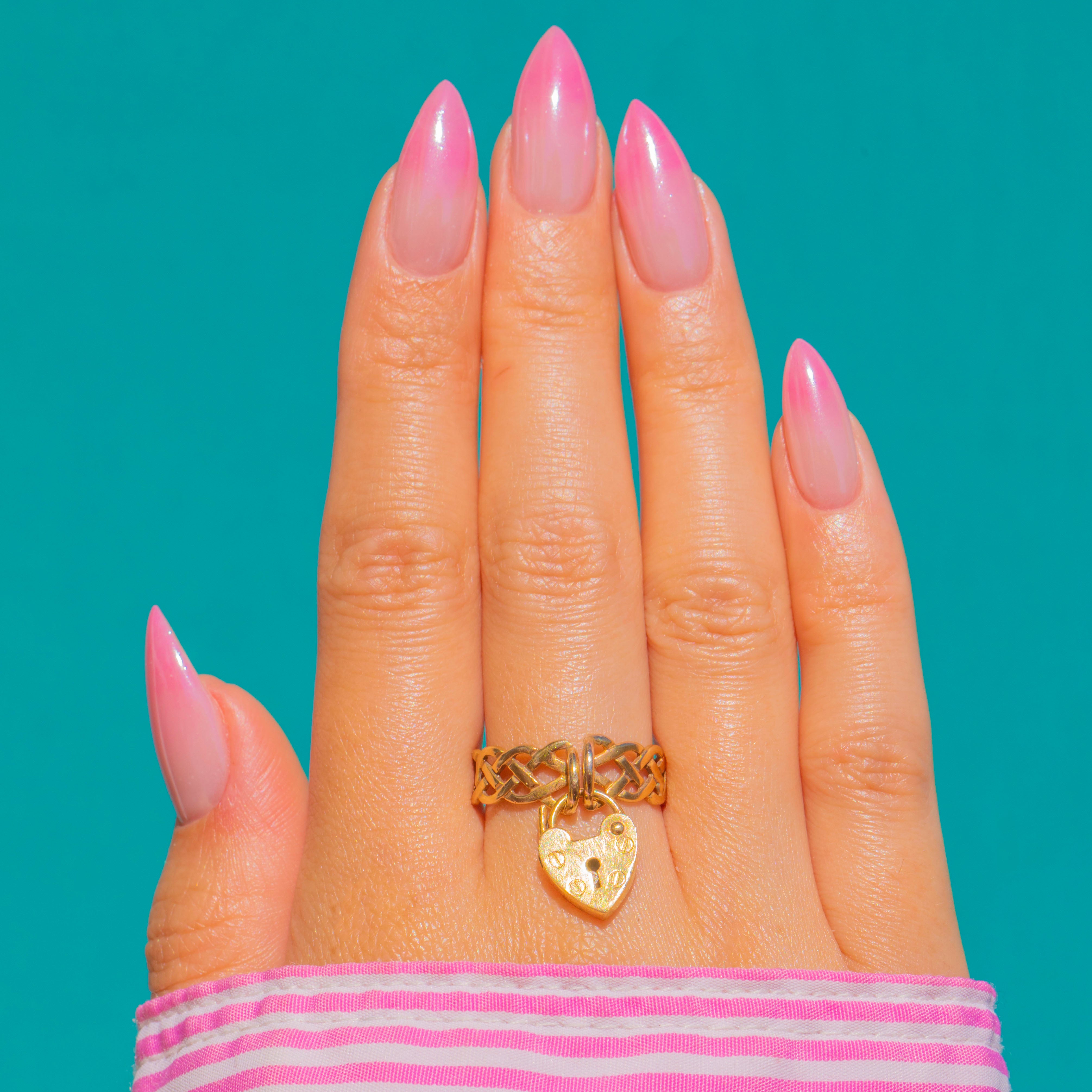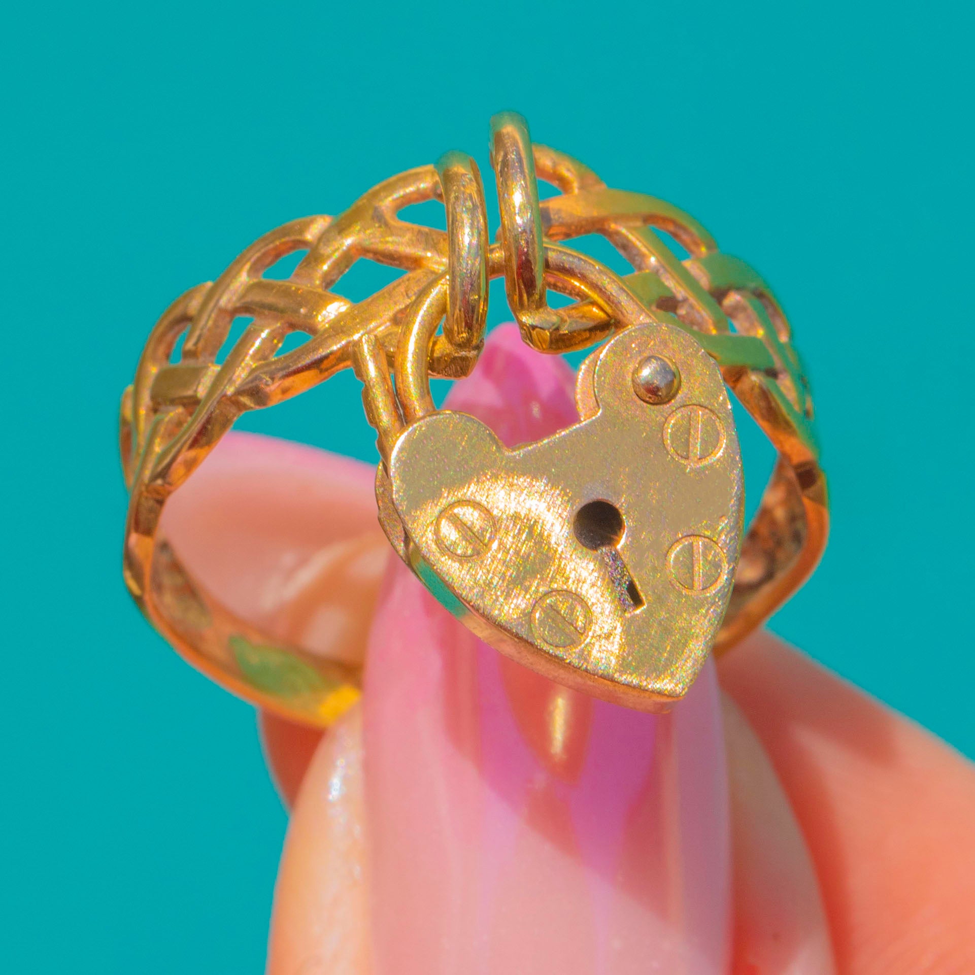 Romance captured in Gold, this Victorian Lover’s Knot ring is a poetic union of symbolism and style. Crafted in 9ct Gold, the interlaced openwork band evokes the eternal “lover’s knot”, while a petite heart padlock charm dances at the front, echoing themes of devotion and fidelity. Airy yet striking, the design balances graceful negative space with a beautifully detailed padlock face.