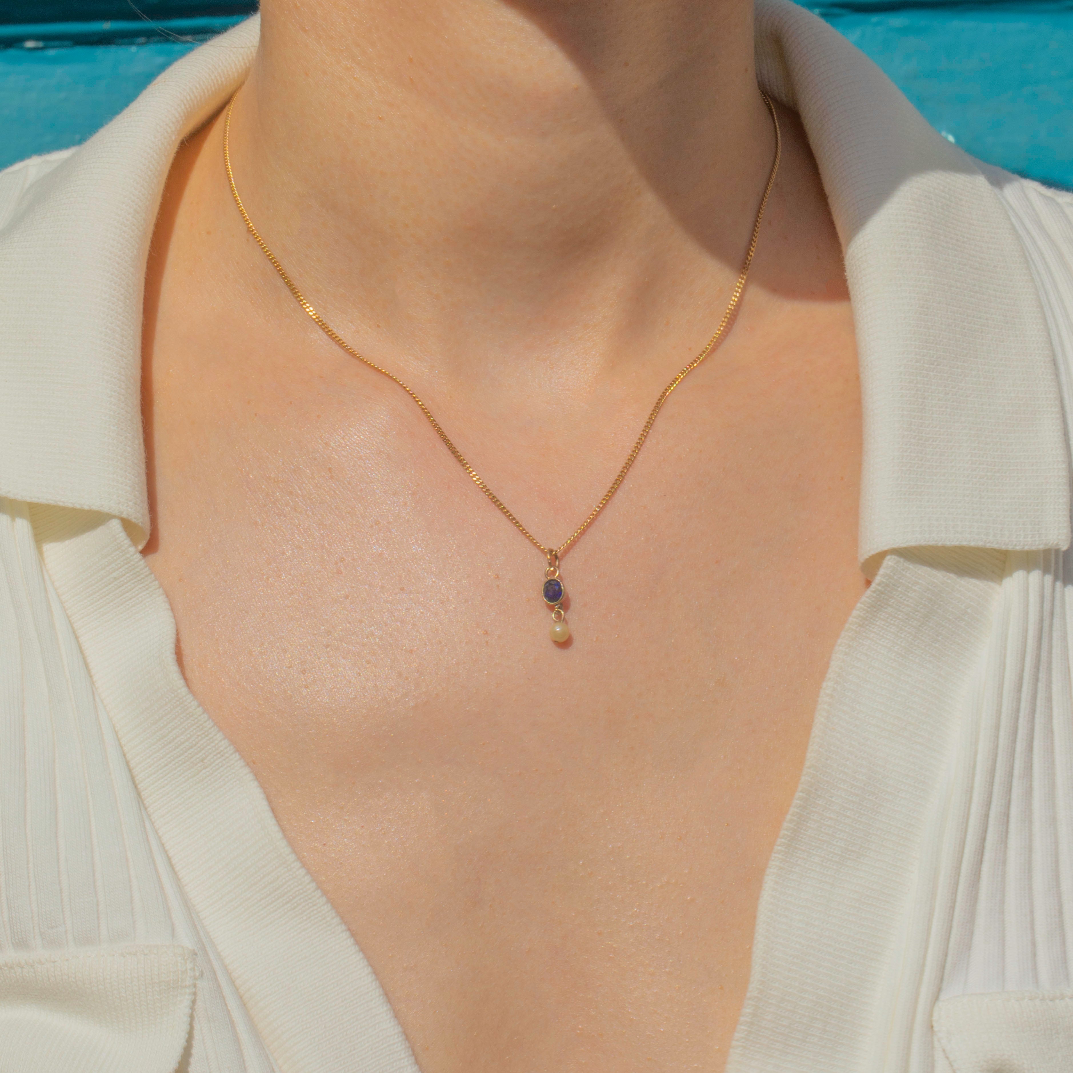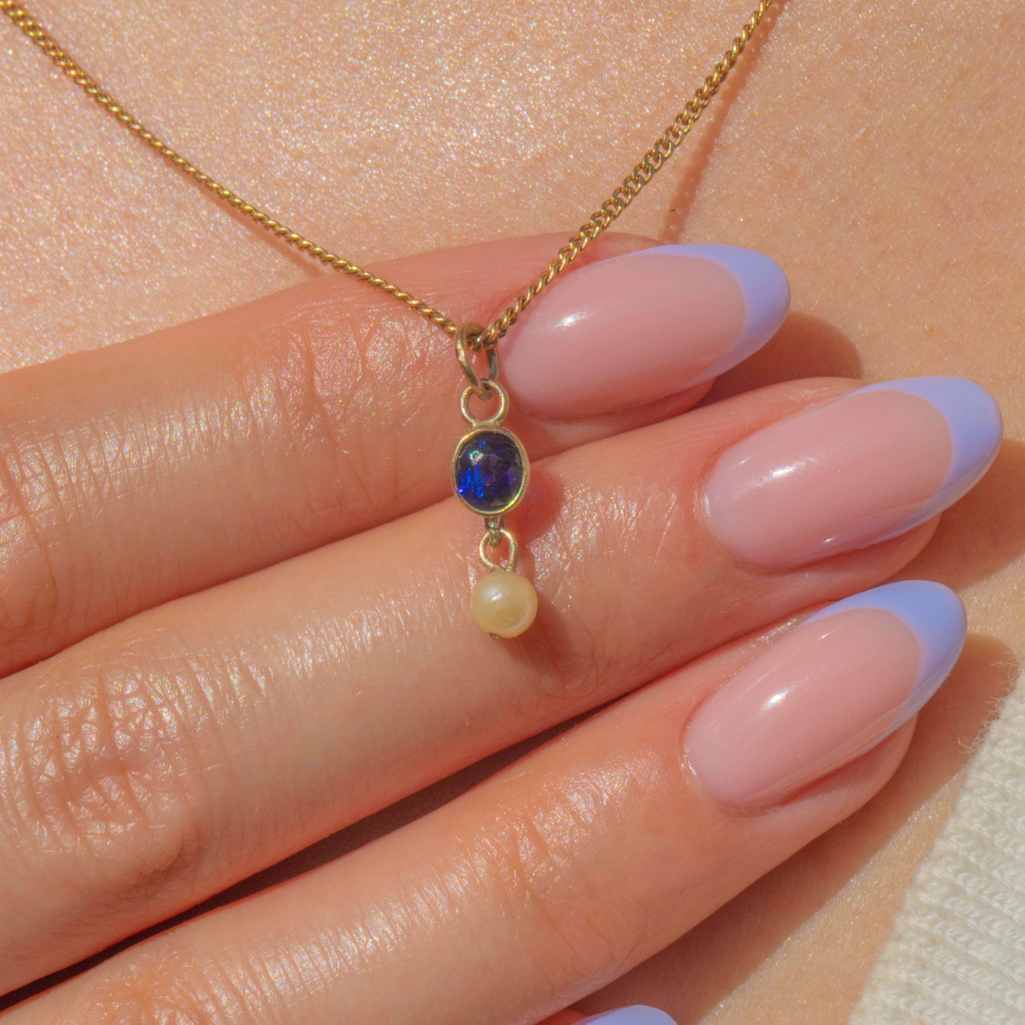 EXCELLENT: This antique 9ct Gold Natural Sapphire Pearl charm is in excellent antique condition with all components intact. The Sapphire and Pearl are securely set, showing only mild signs of their age. The Gold is bright and buttery with no visible damage or repairs.