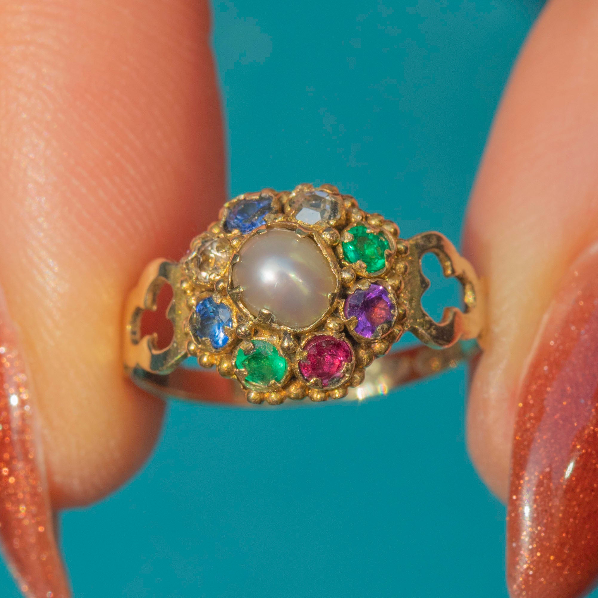 The Victorians were renowned for their use of symbolism in their jewellery, and it was likely that this ring drew inspiration from the Indian Navaratna ring. The ring is home to the following gemstones: Ruby, symbolising the sun, Diamond - Venus, Emerald - Mercury, Garnet - Rahu, Pearl - the moon and blue Sapphire - Saturn.