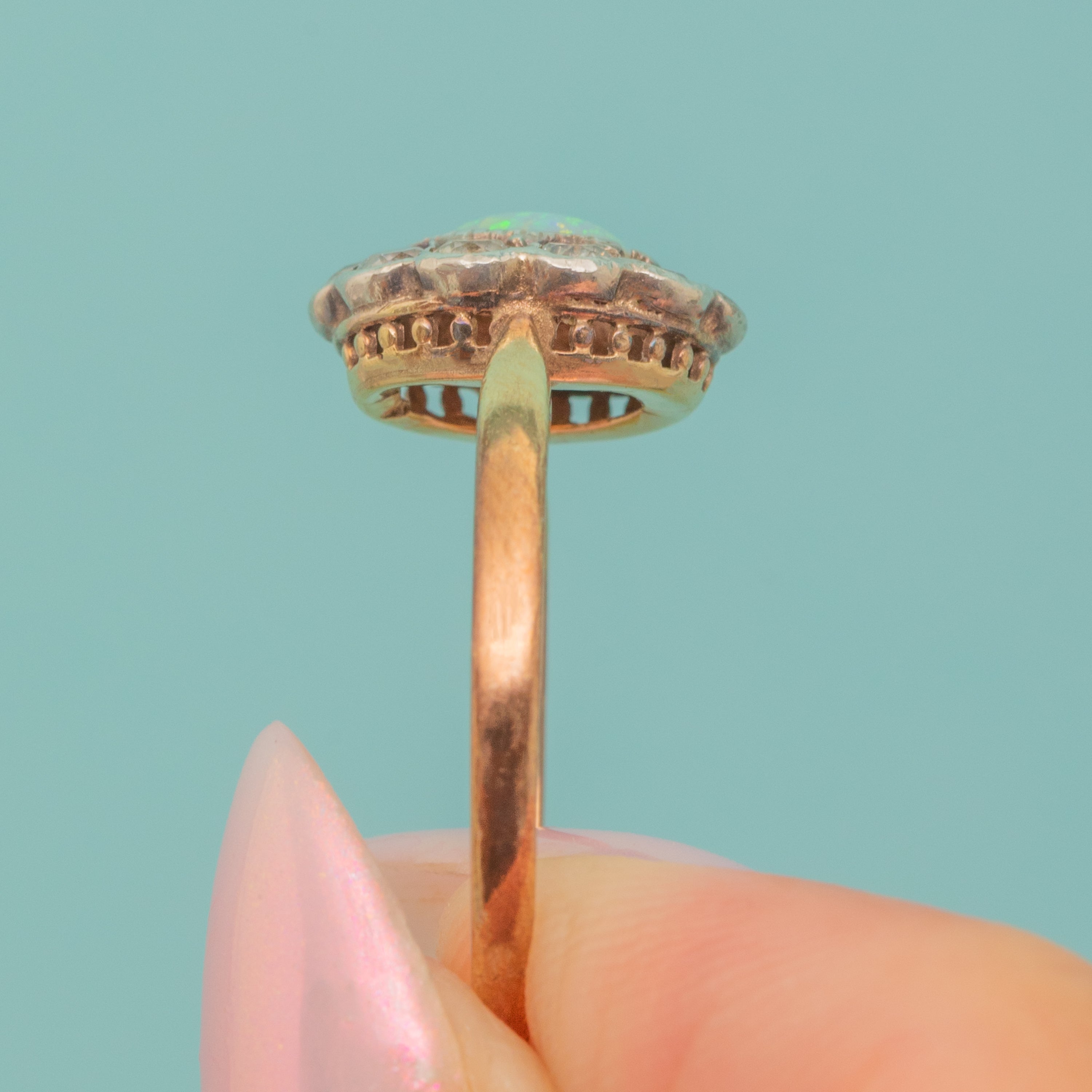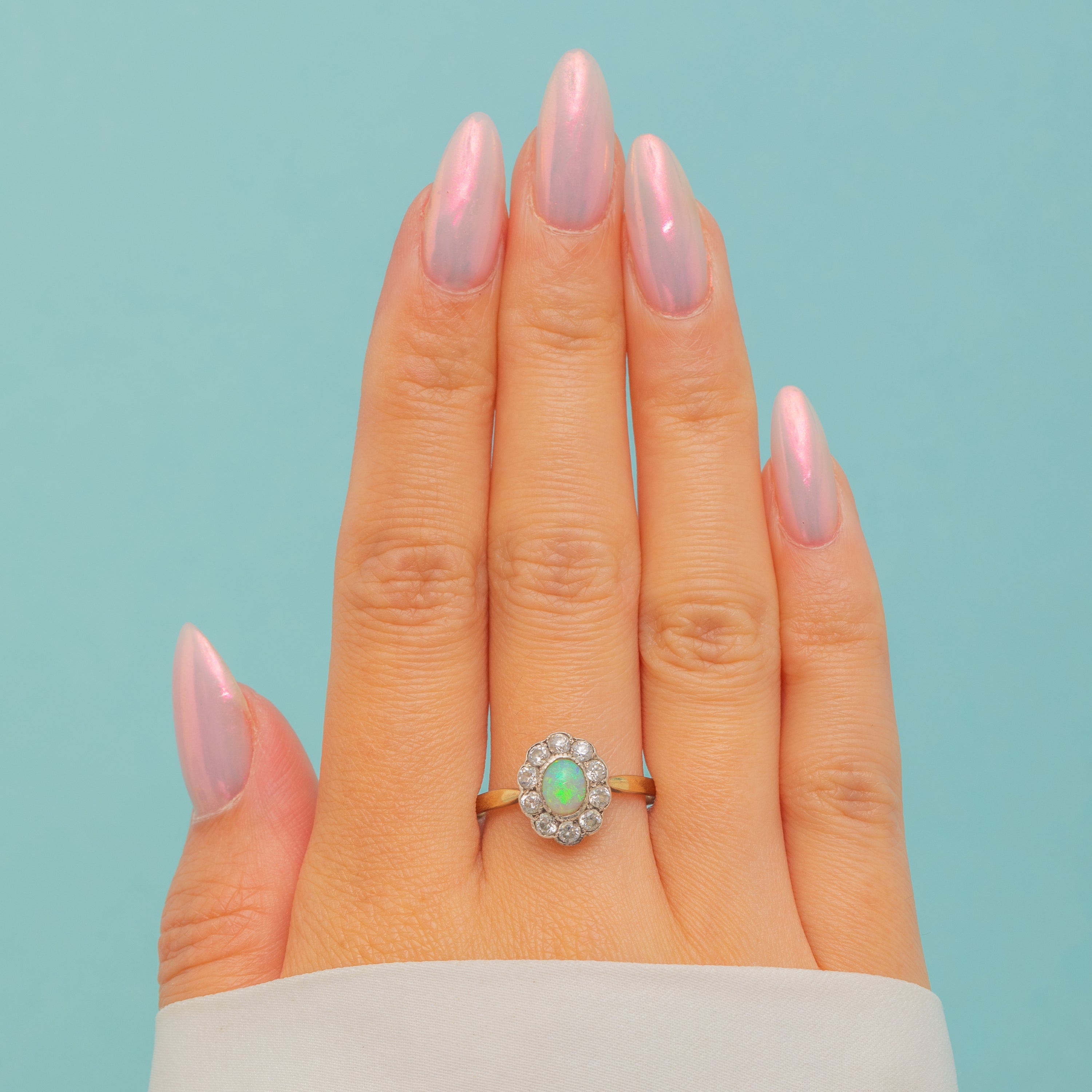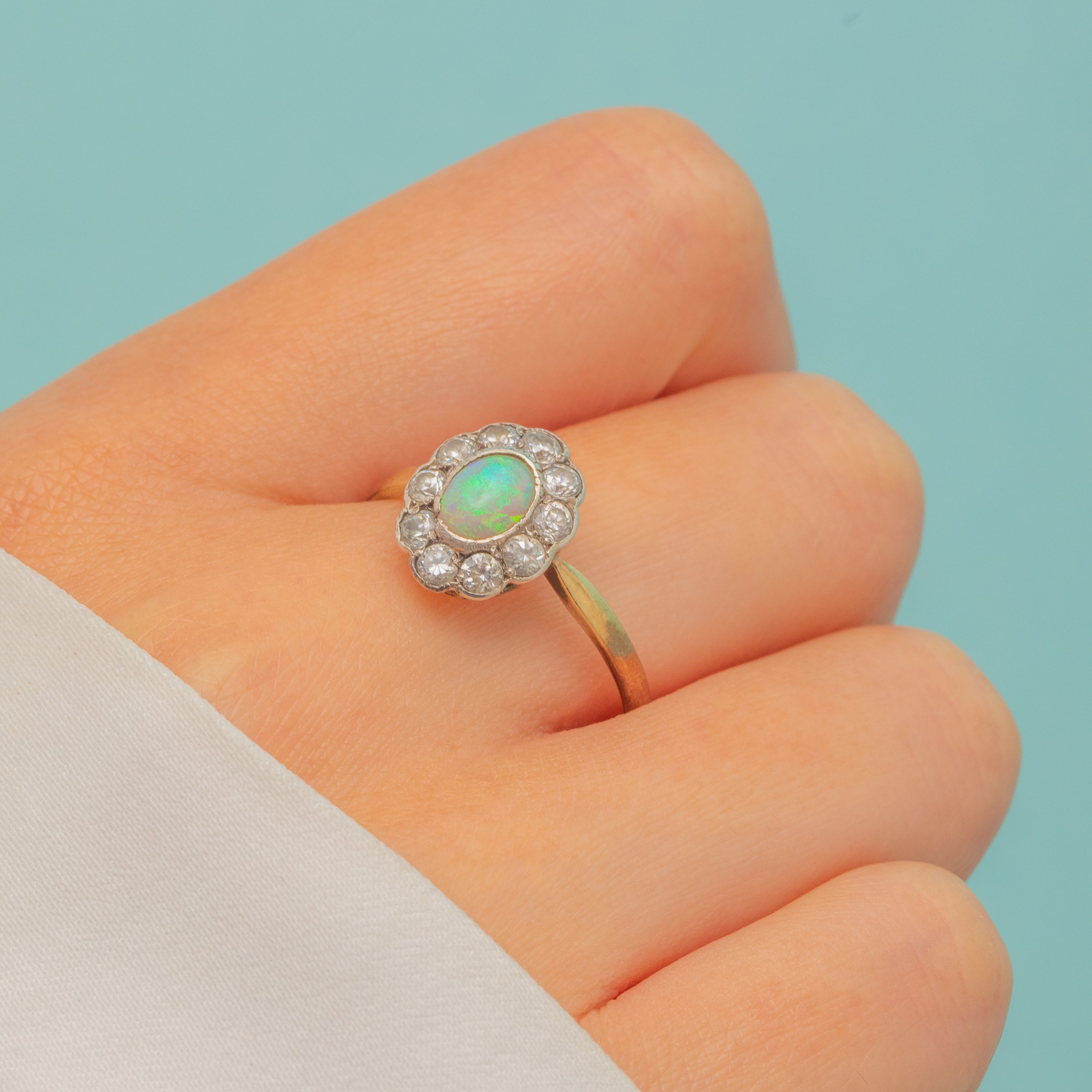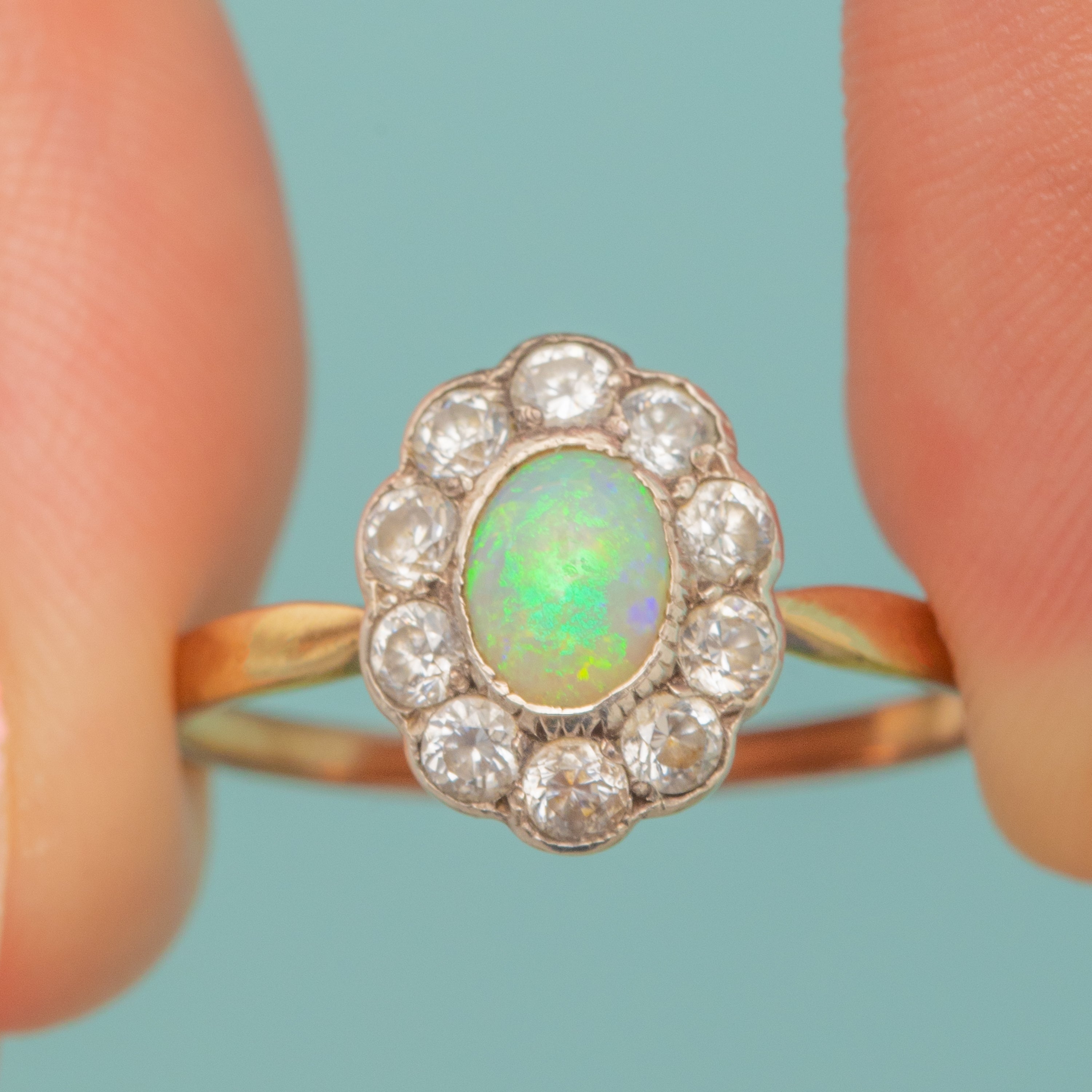This antique 9ct Gold Opal & Paste cluster ring is simply superb! Inlaid with a  natural Opal with a halo of bright white Paste gems, this antique ring will make a gorgeous addition to your collection, just imagine her with a coupé of champagne accompanying your favourite dress!
