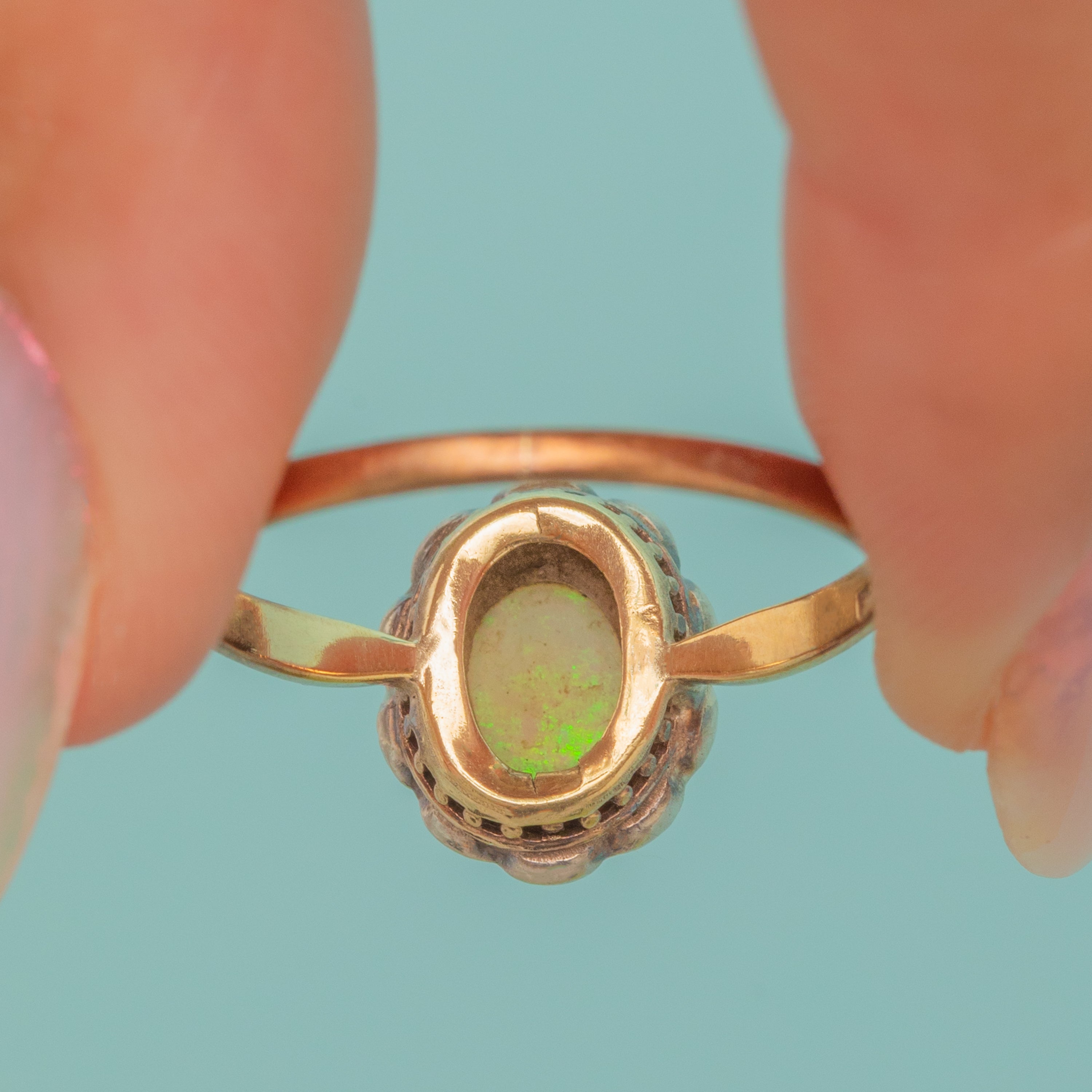 VERY GOOD: This antique 9ct Gold Opal & Paste cluster ring is in very good condition throughout. The Opal itself is free from chips or nibbles, and while there is a little wear to the setting, she is set securely. There is also some discolouration and a resize mark to the ring band, which has accrued a satisfying rosy colour over time. She is a delightful little piece that will be worn and enjoyed for years to come!