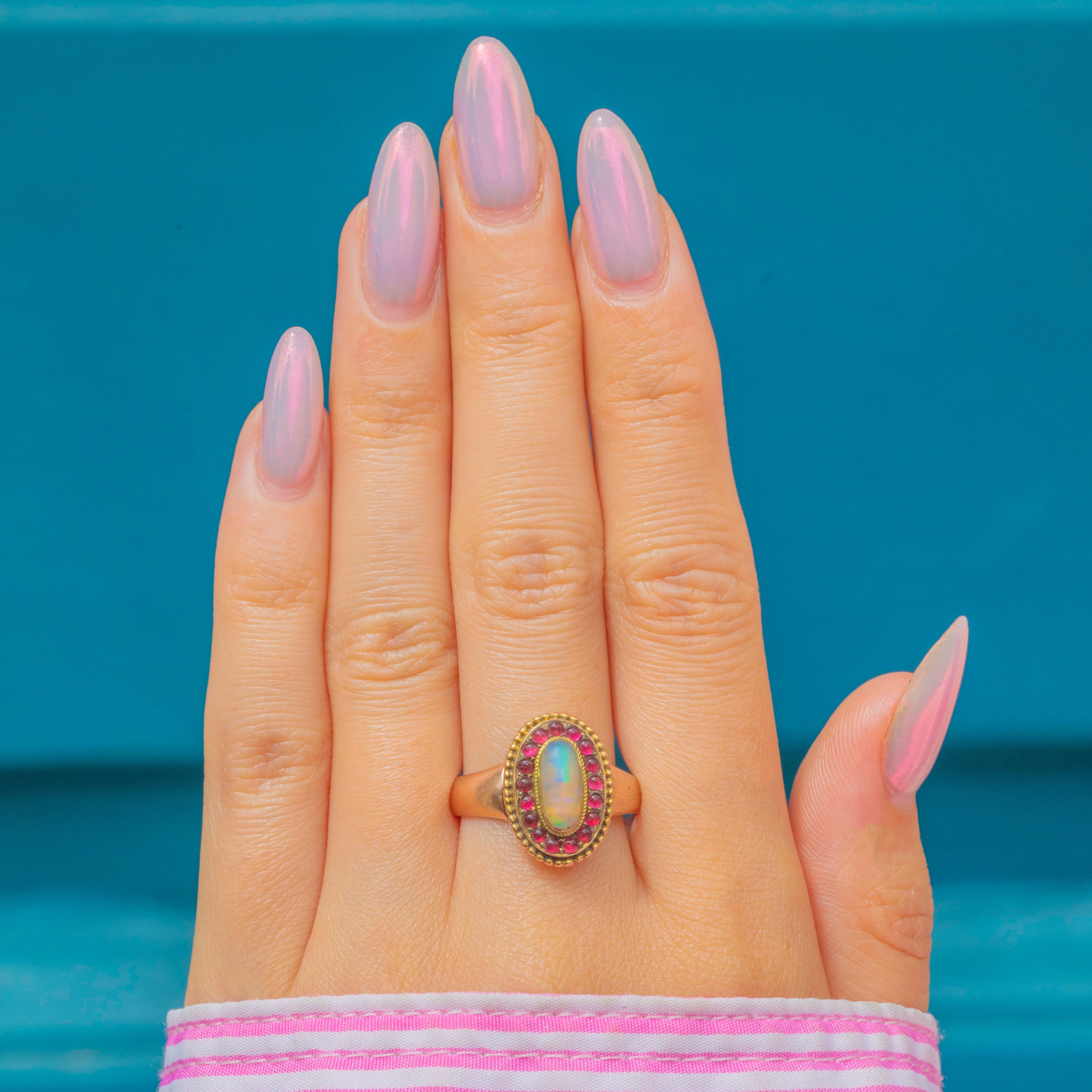 This striking and unusual Victorian ring is centred by a radiant Opal cabochon, projecting hypnotic blue, green, and lilac hues, and is encircled by a halo of vibrant pink Paste gems!
