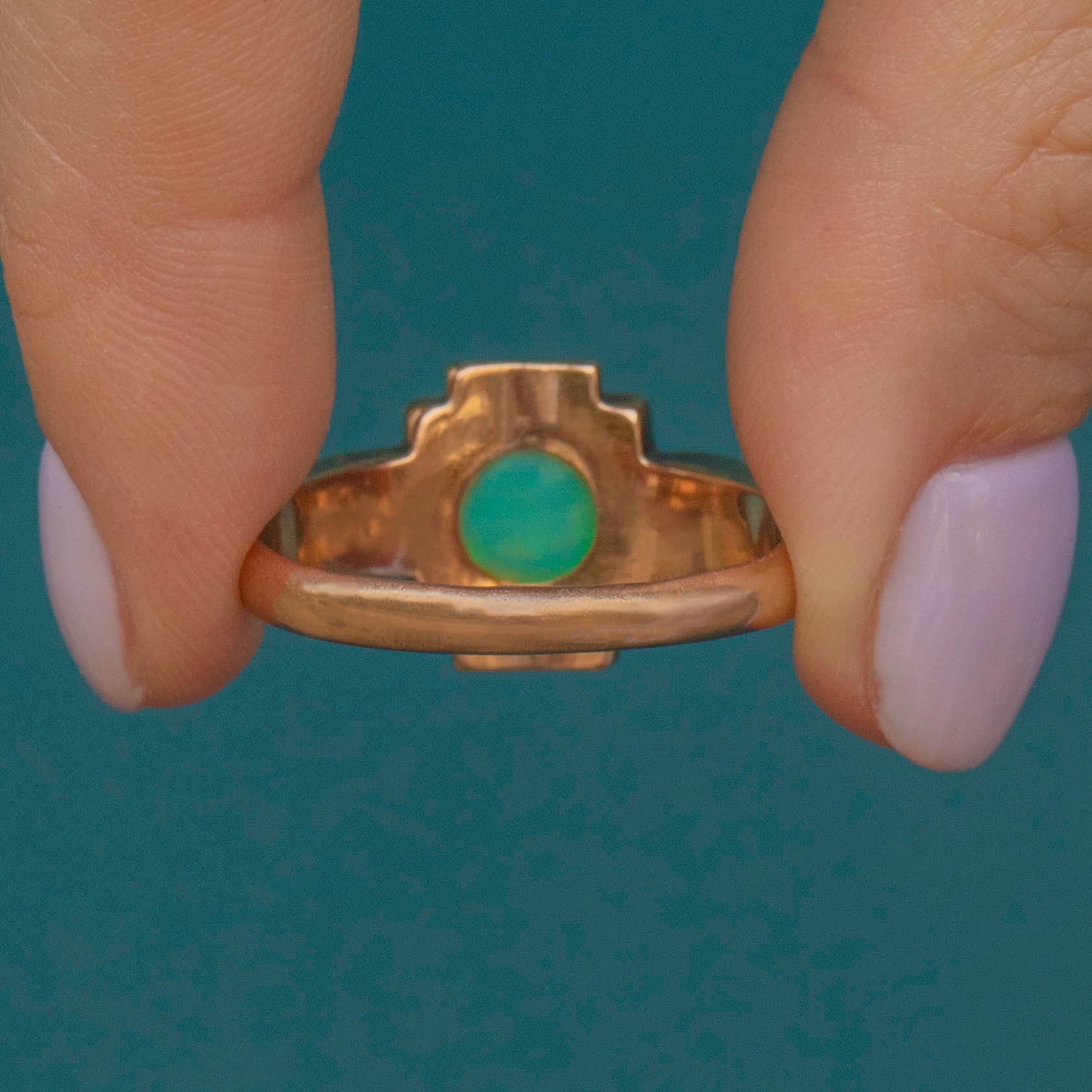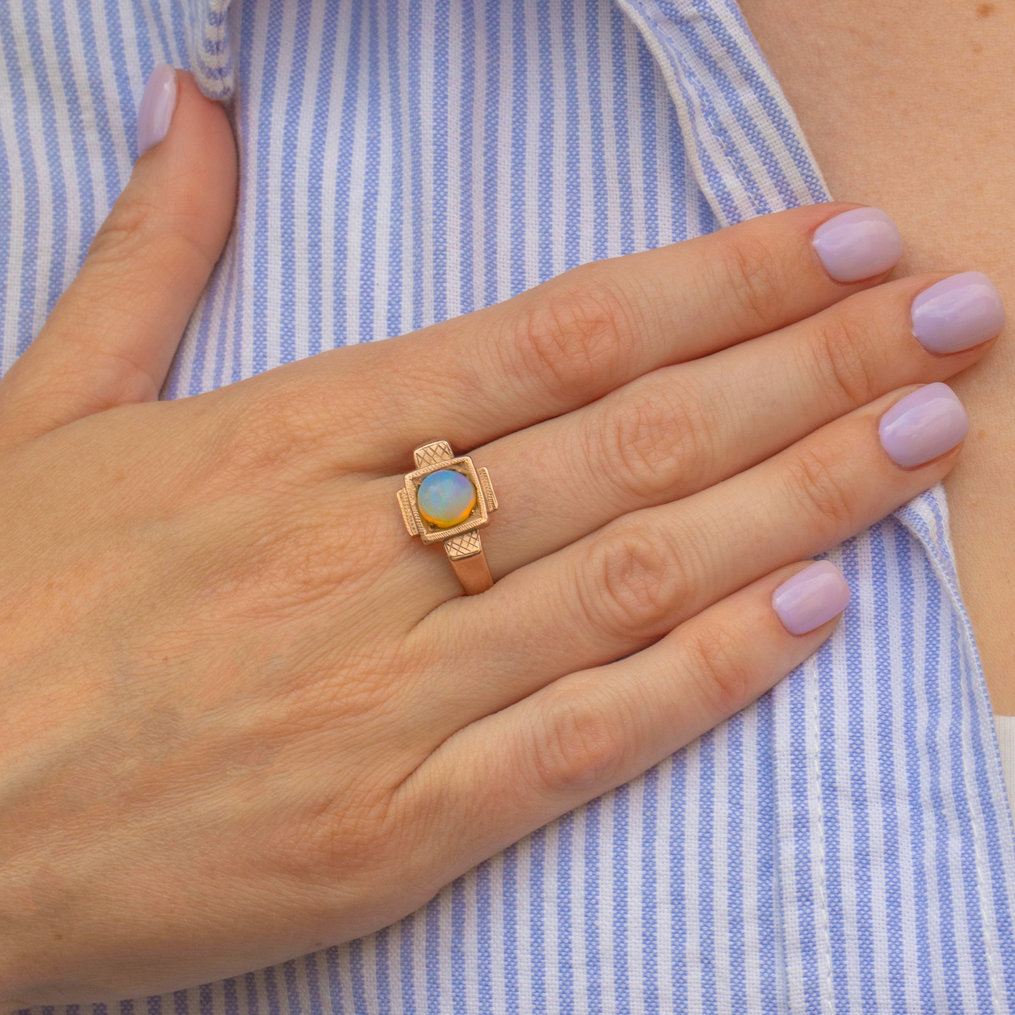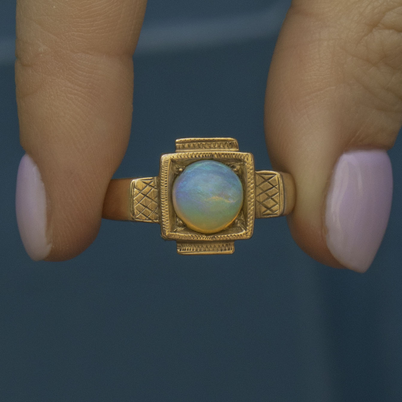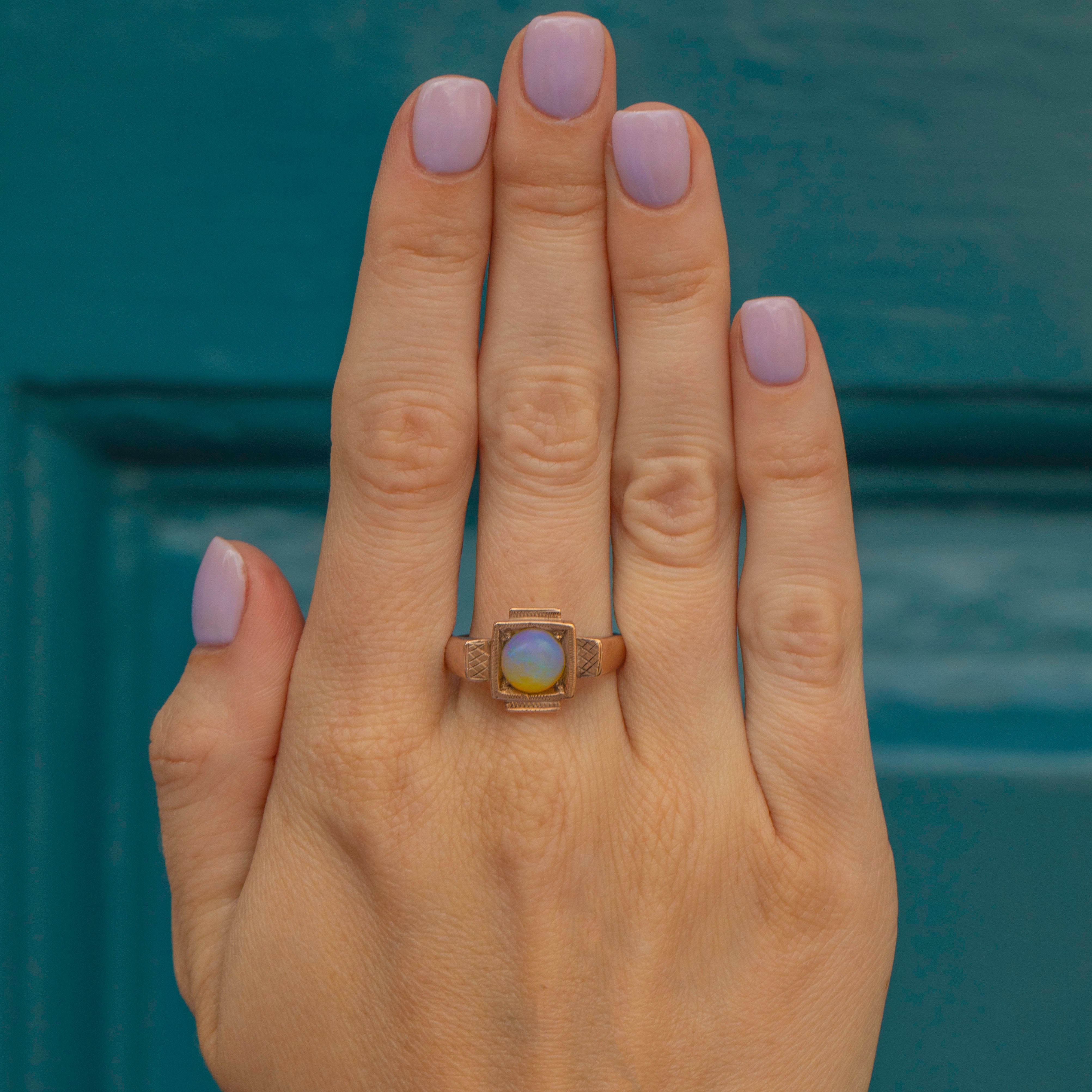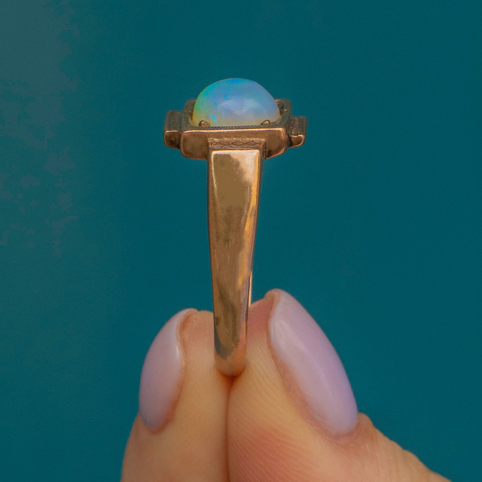 This antique 9ct Gold Opal ring will bring a unique flare to your jewellery collection! The 1.44ct Opal cabochon will instantly enchant you with its ethereal purple and blue hues, revealing hints of pink and orange as she moves in the light.