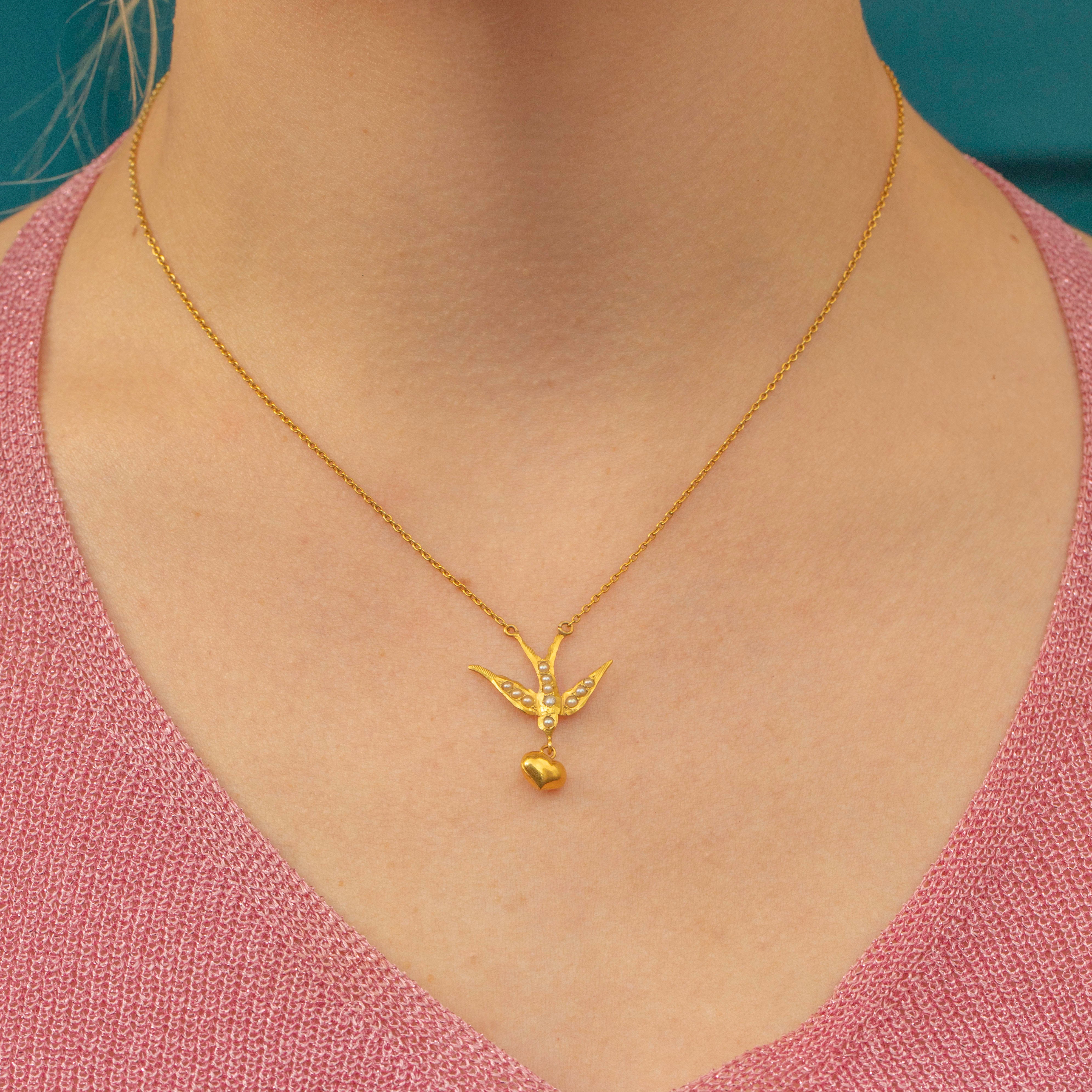 EXCELLENT This antique 9ct Gold Pearl swallow heart necklace is in excellent condition. Her swallow is perfectly formed and securely suspended from her well-preserved 9ct Gold chain. The glowing Pearls are all held securely in their settings, allowing for confident and dependable wear. You will want to take this sweeping swallow with you wherever you go!