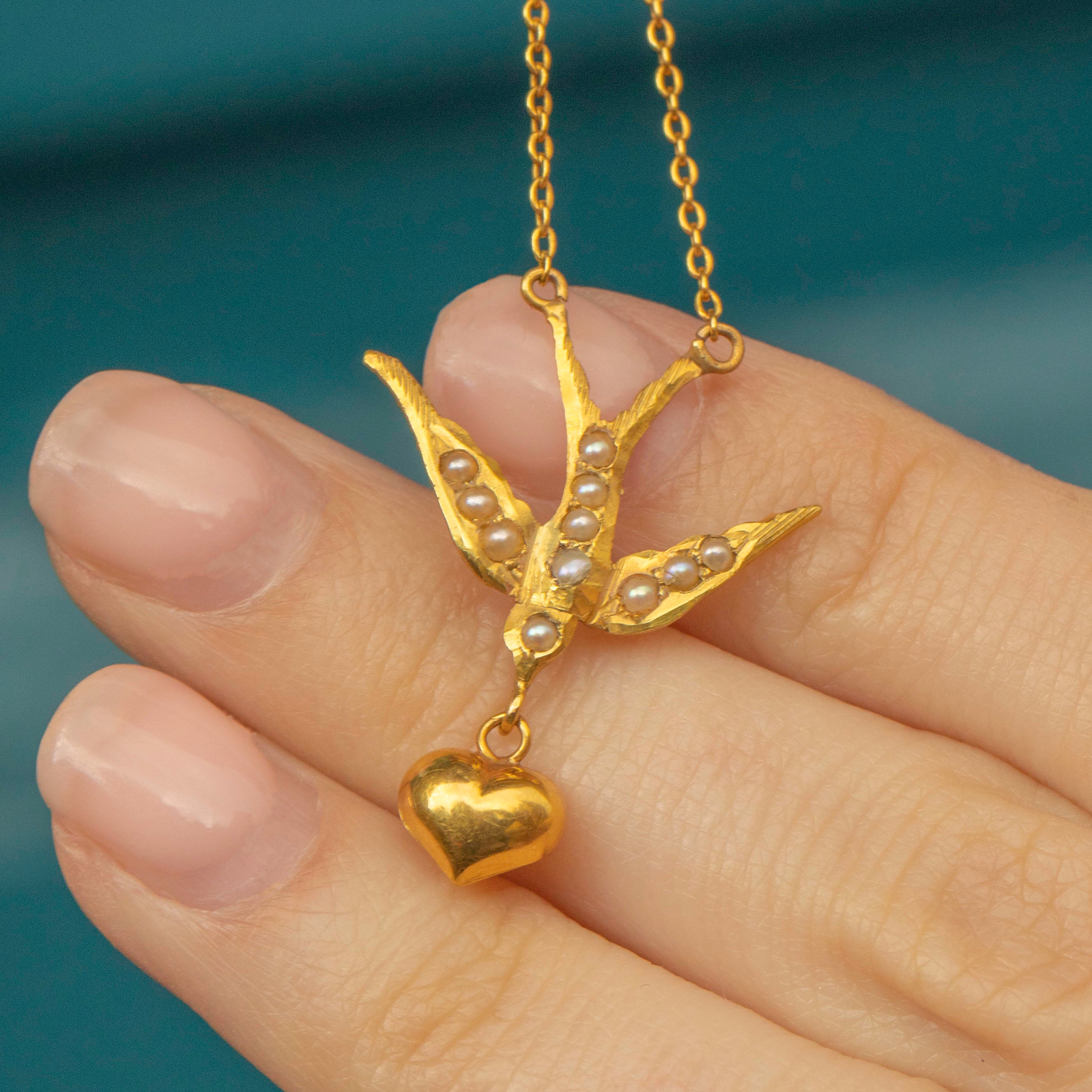 Add a touch of elegance to your jewellery collection with this exquisite antique 9ct Gold Pearl swallow heart necklace! This stunning piece features a graceful swallow crafted from lustrous 9ct Gold, adorned with shimmering Pearls across her heavenly wings.