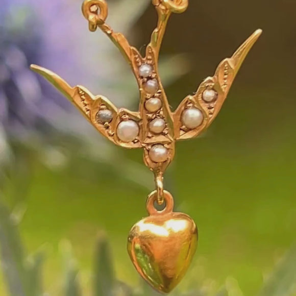 Antique 9ct Gold Pearl Swallow Heart Necklace