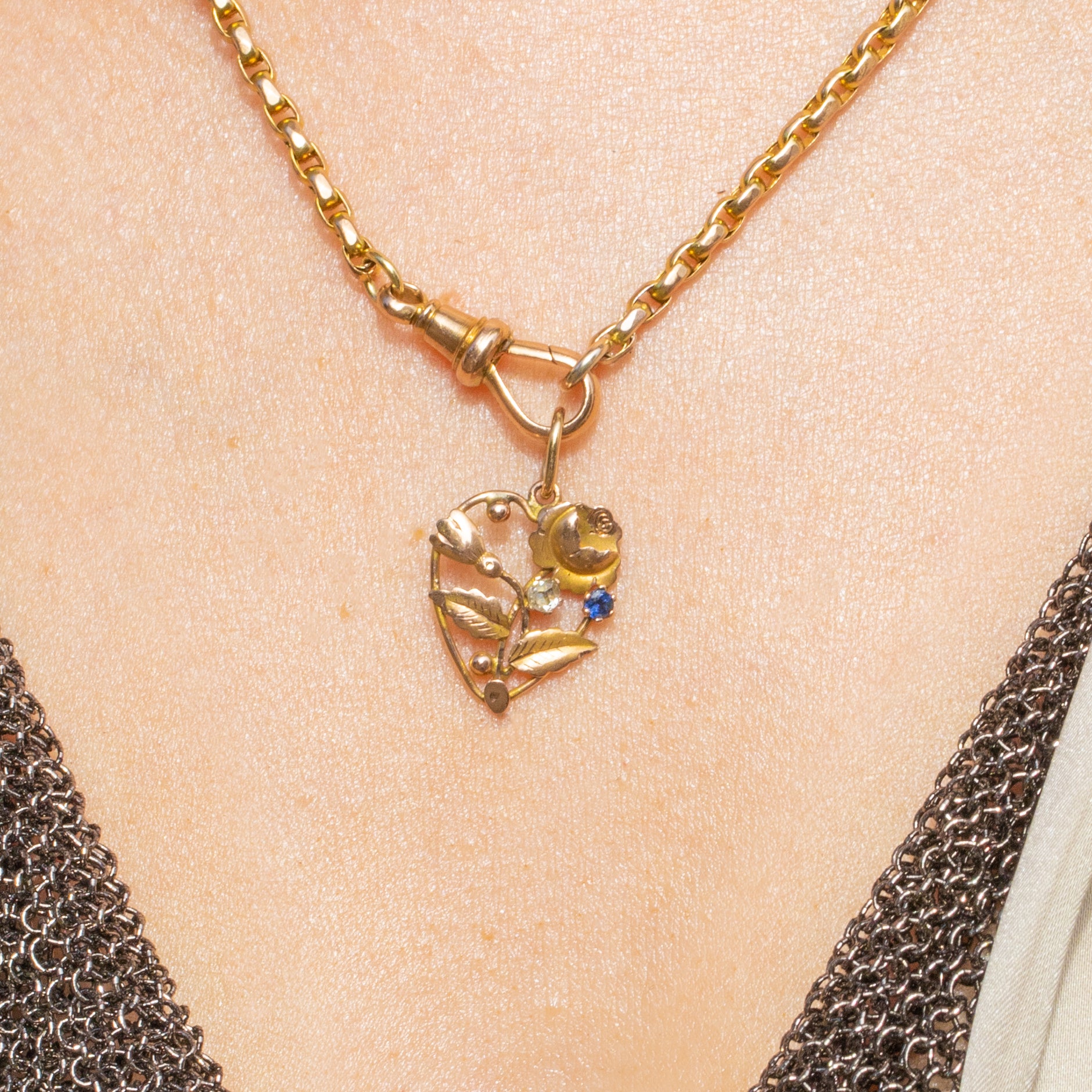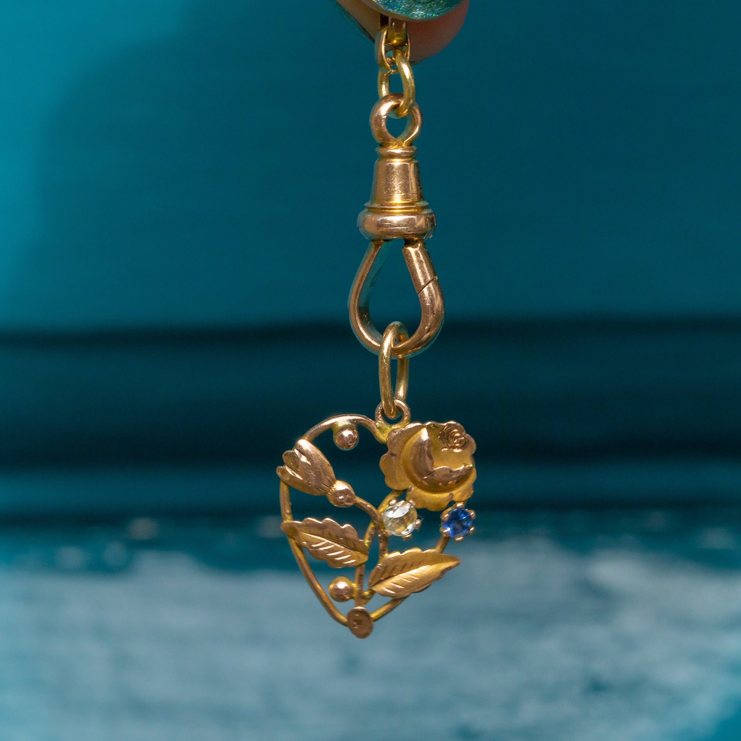 Whether a lover of flowers or an admirer of all things beautiful, this antique 9ct Gold peony heart pendant was made for you! Her whimsical peony design is encased in a heart border, studded by a single Diamond and blue Paste to finish; does it get more romantic than that?