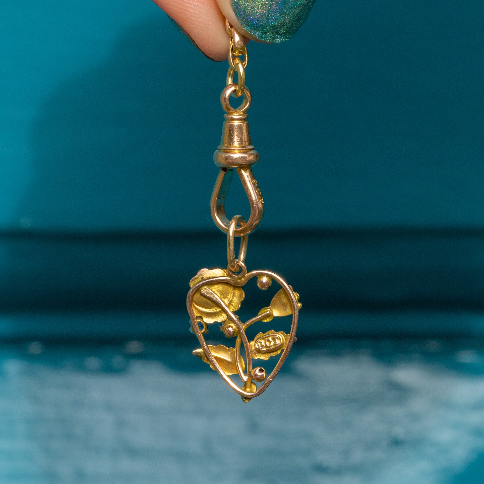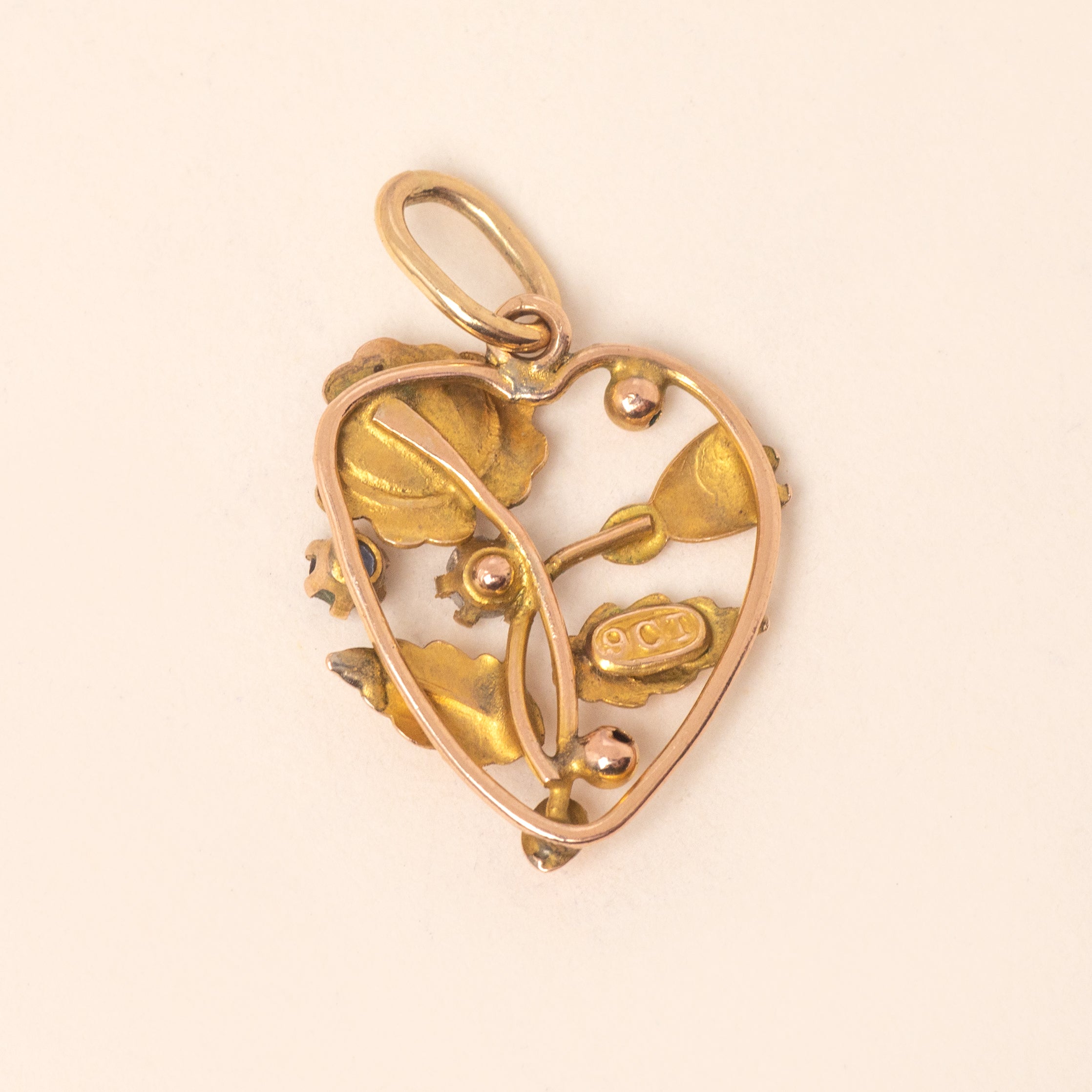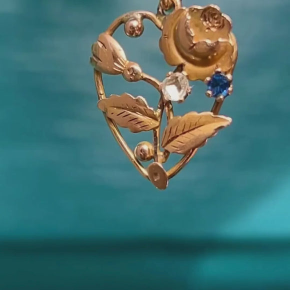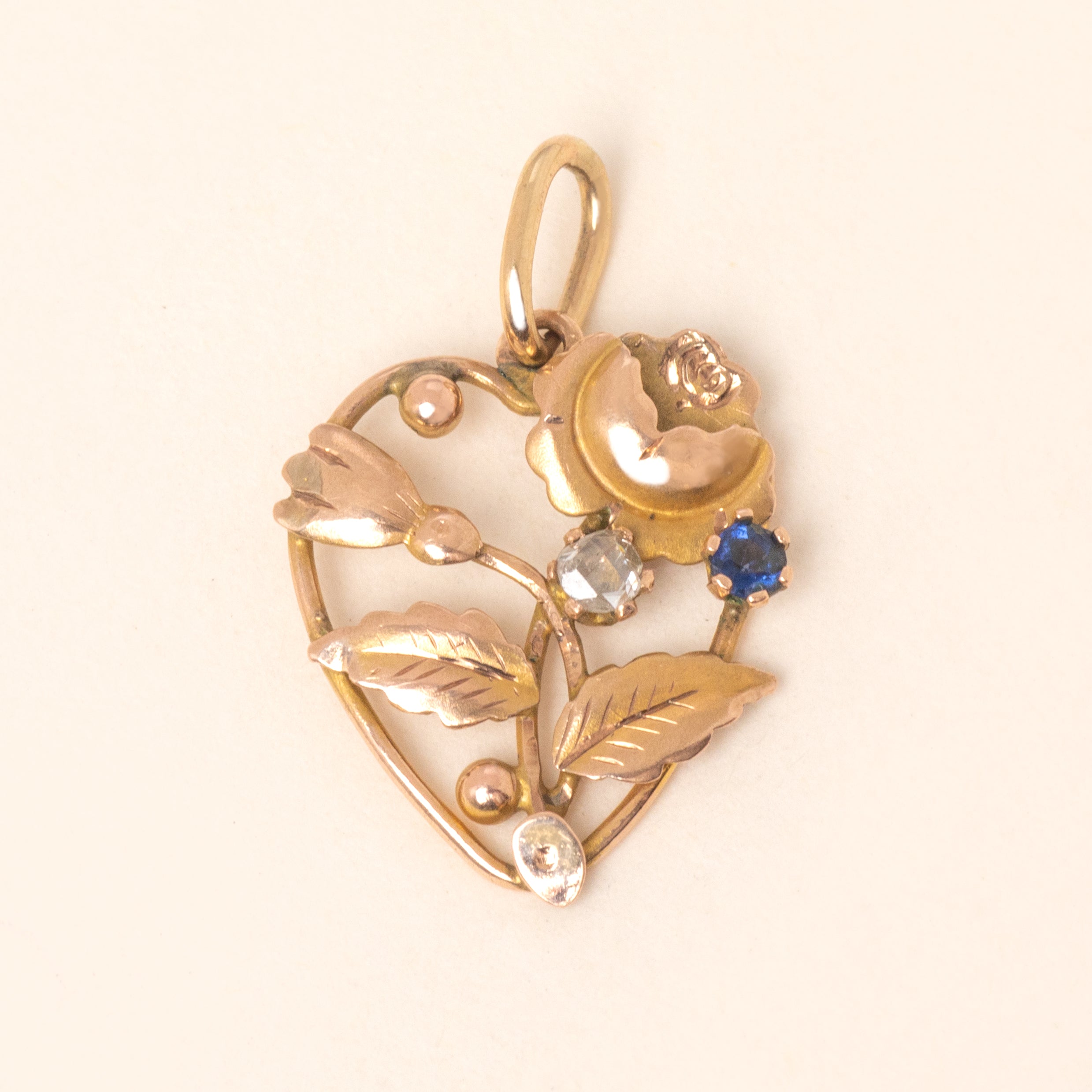 Antique 9ct Gold Peony Diamond Heart Pendant
