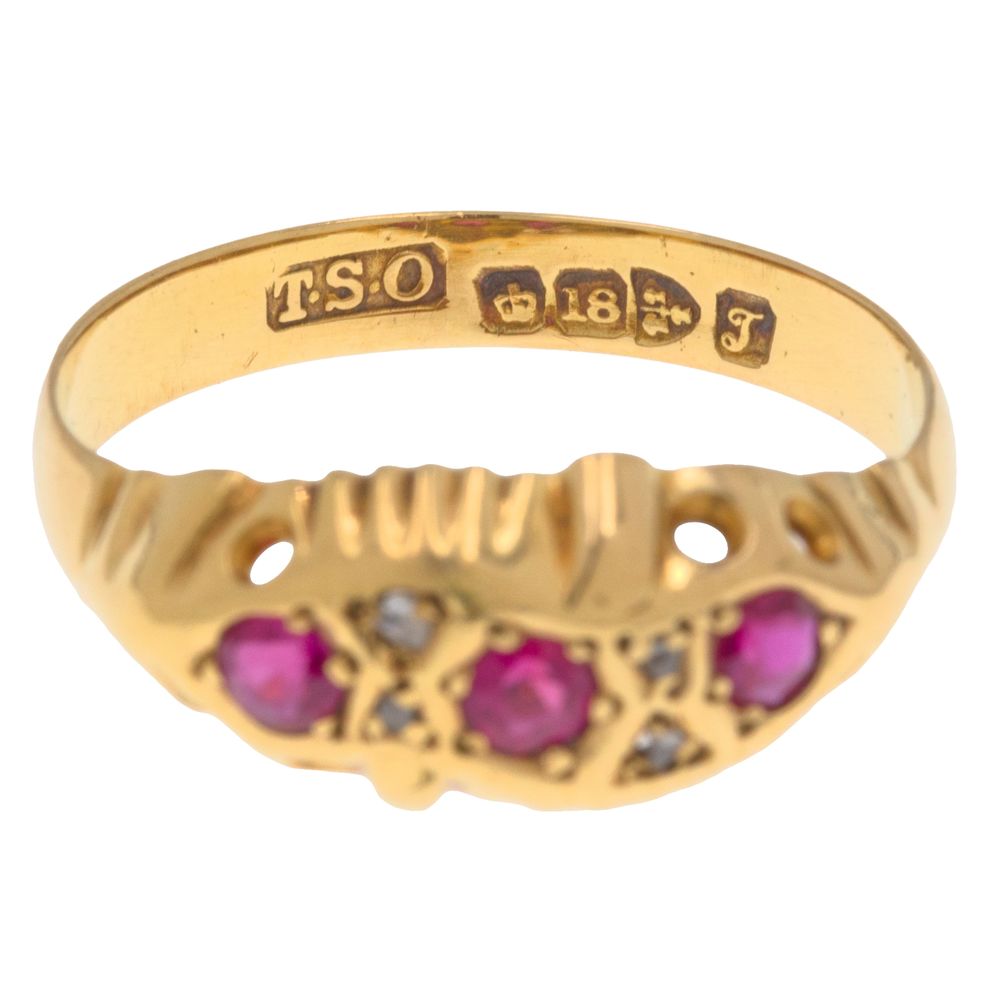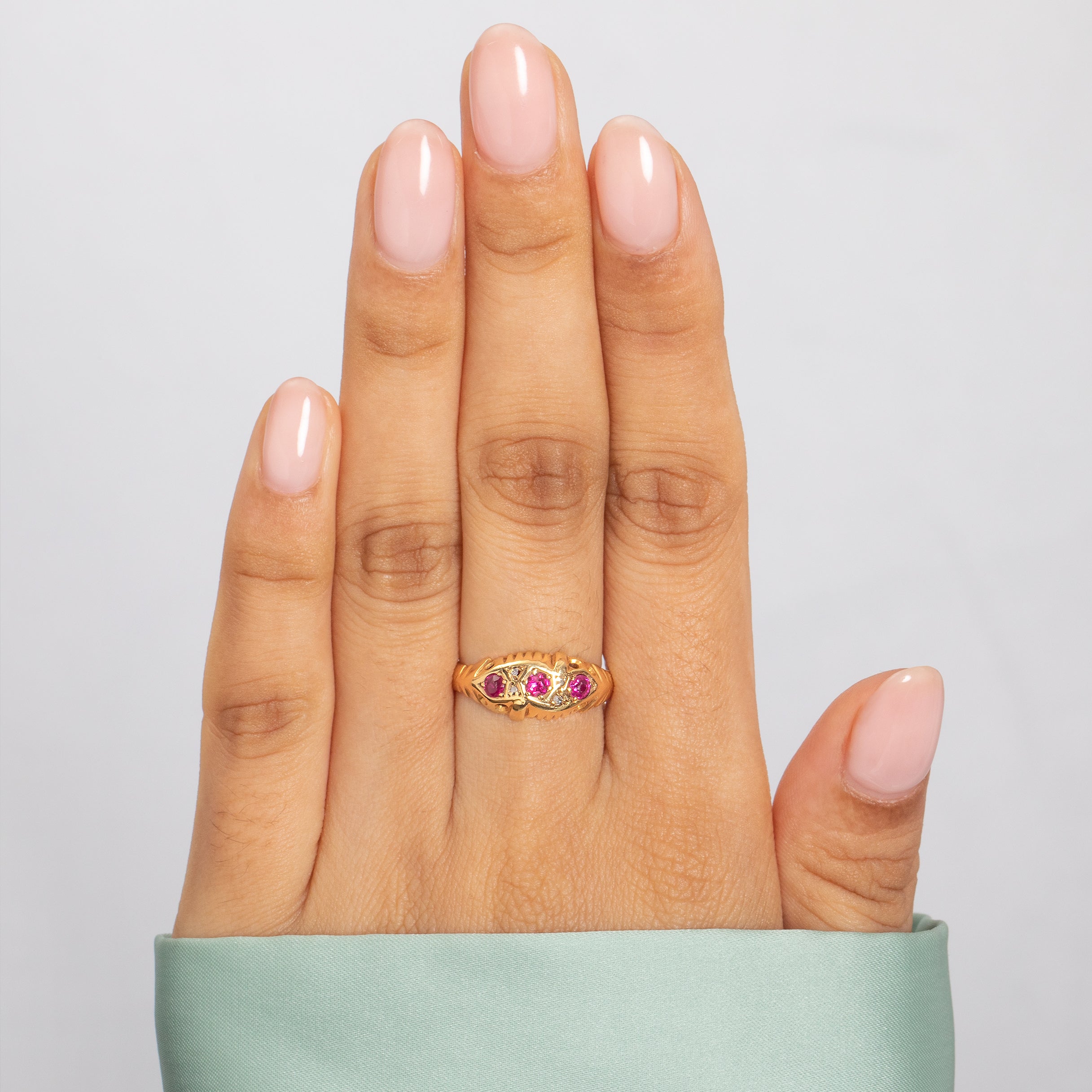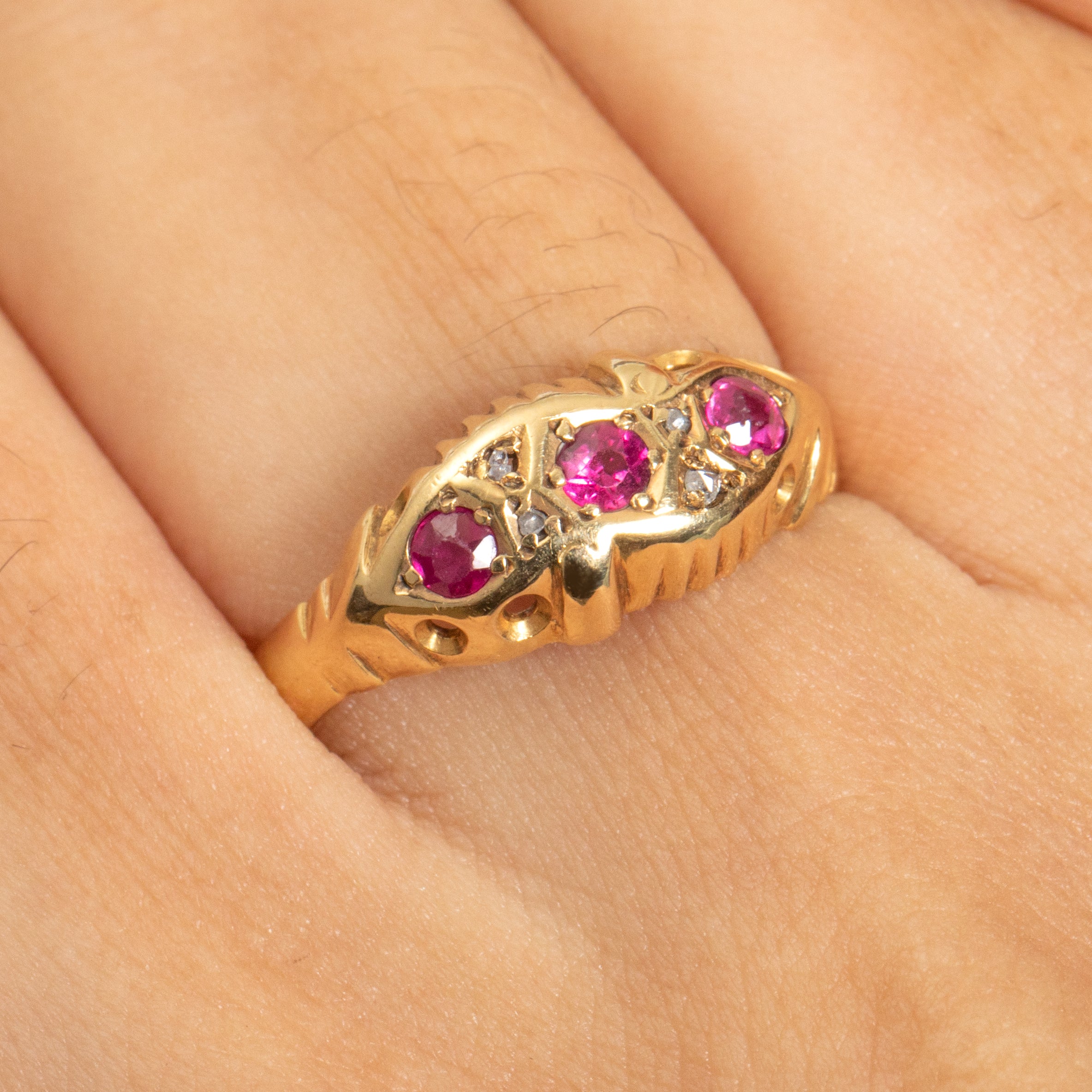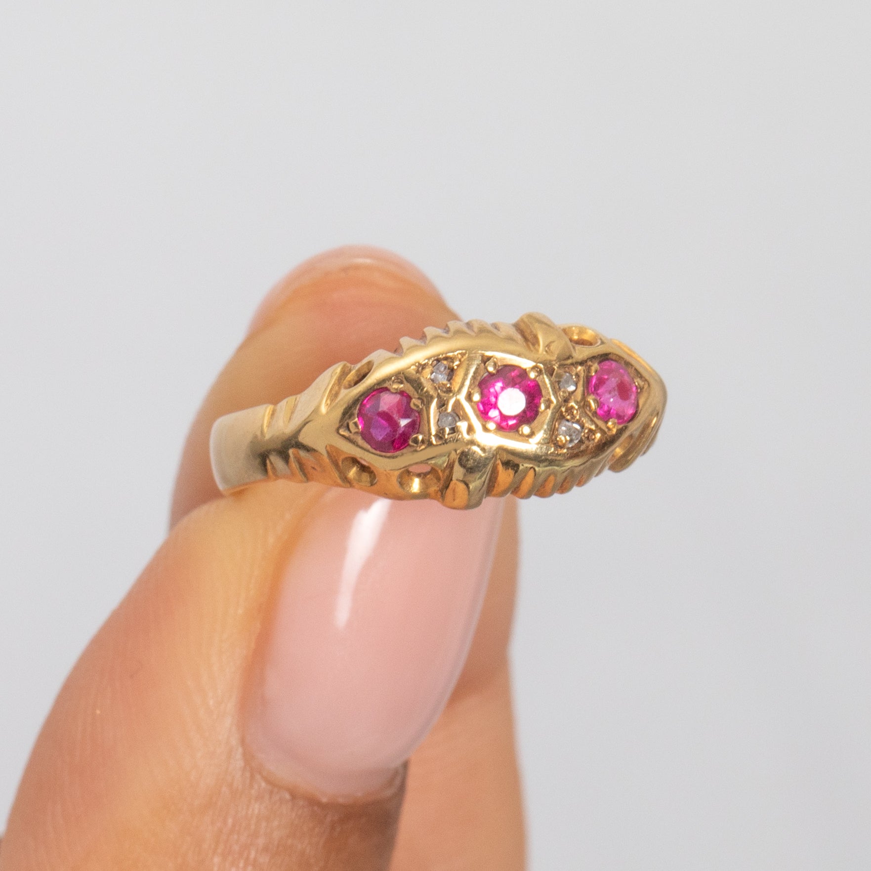 Exuding luxury from her every crevice, this antique 18ct Gold Ruby Diamond ring will make a delightful addition to your collection! Crafted from solid 18ct Gold, this ring boasts three fuschia-hued Rubies set across her centre accompanied by a sprinkling of dainty rose-cut Diamonds adding a subtle twinkle as they catch the light.