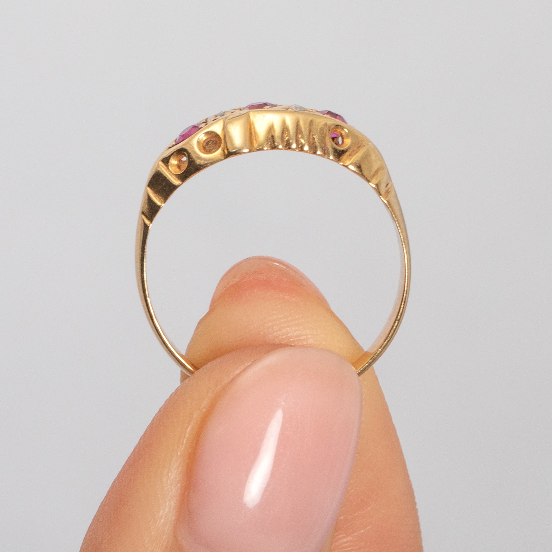 EXCELLENT. This antique 18ct Gold Ruby Diamond ring is in excellent condition throughout. The Gold is saturated and all of the details have remained crisp. The gemstones are all present and securely set, free from any chips or fleabites. With a full set of hallmarks on the inside of the band allowing us to accurately date her to 1919, this is a highly collectible ring ready to be adored for years to come!
