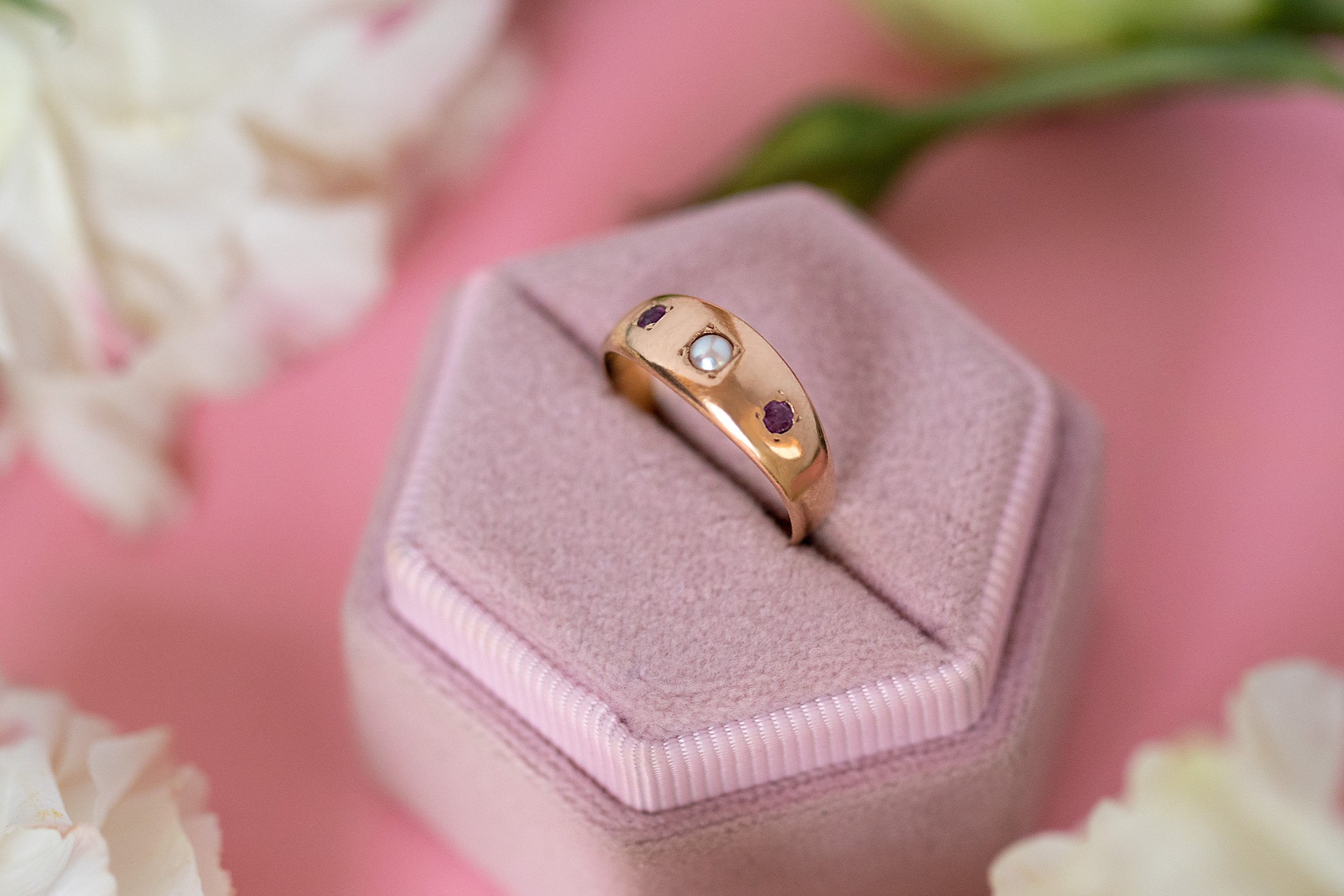 This antique 9ct Gold Ruby Pearl Gypsy ring is a dream! Her buttery 15ct Gold homes a wondrous Pearl flanked by two fuchsia Rubies. A versatile piece, this Victorian trilogy ring is super stackable.