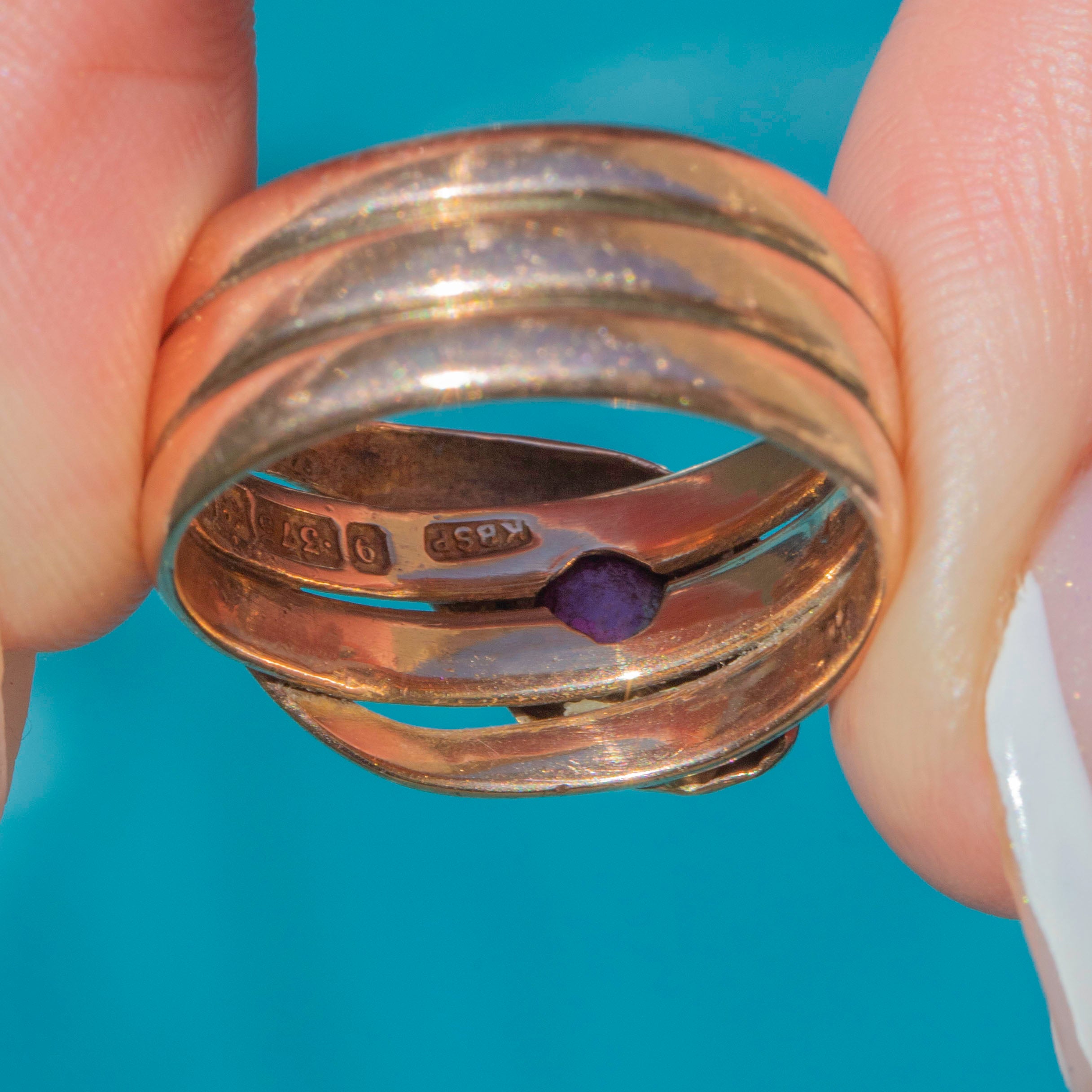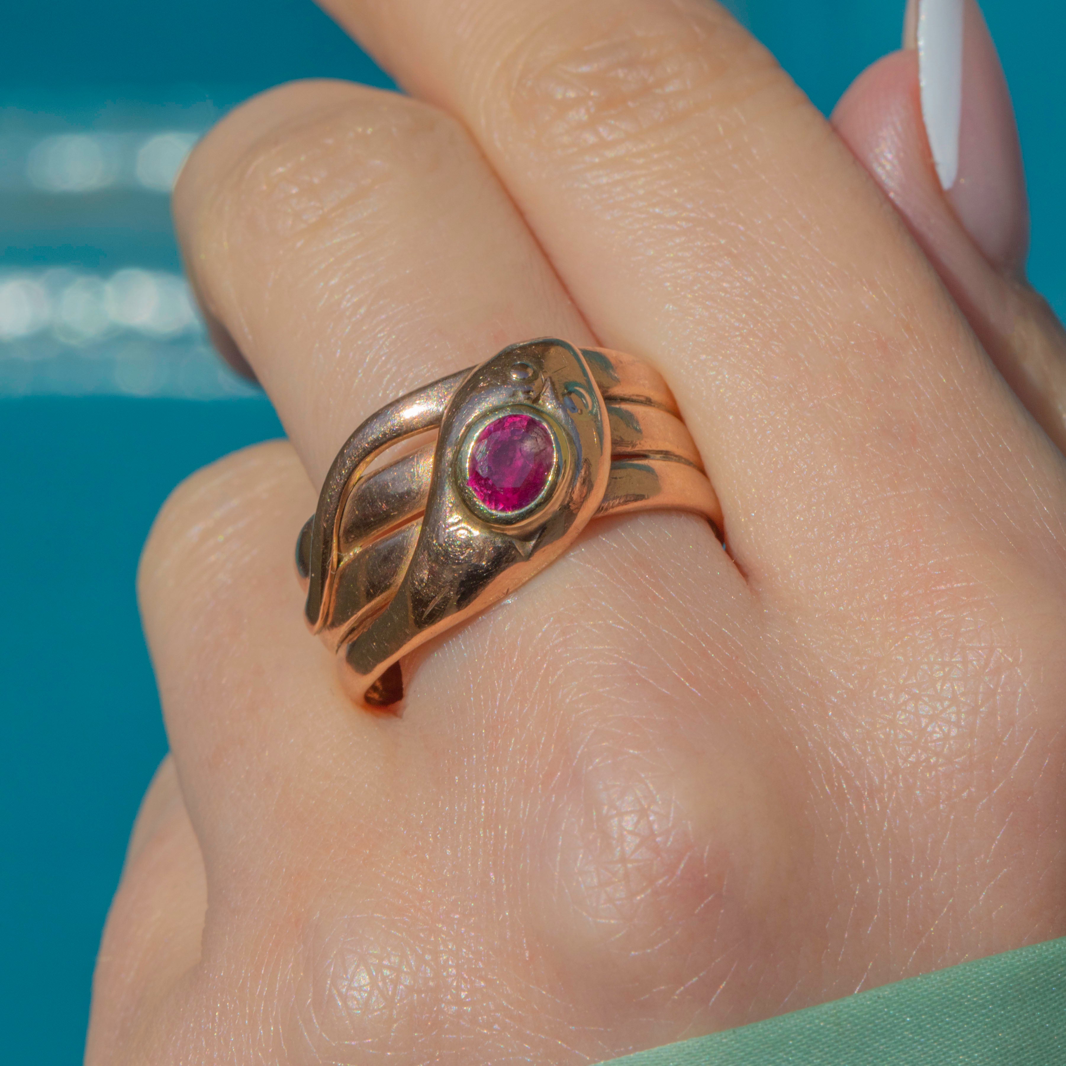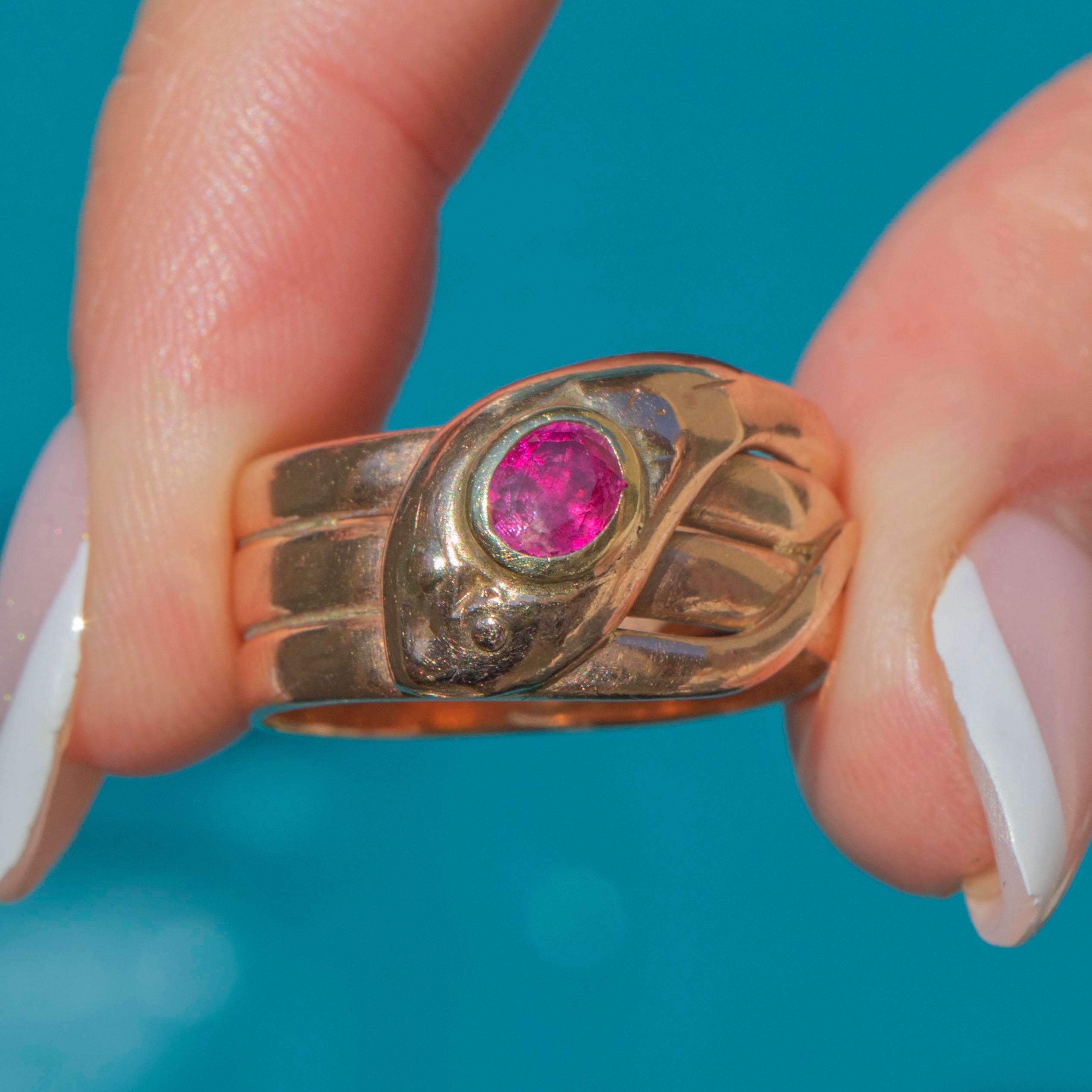 VERY GOOD. This antique 9ct Gold Ruby snake ring is in very good condition. The Ruby is vibrant with no visible surface wear to note. There is a small nick to the edge of the bezel setting, but the Ruby remains secure.  The Gold is bright and buttery and the snake head is defined, there is some minor age-related wear inside the band, however, the hallmarks are crisp and clear. The ring does appear to have been resized, but there is only minor evidence of this on the back of the band. The ring has kept its shape well over the years and is smooth, making it a robust and comfortable piece that can be worn and enjoyed for many more years to come!