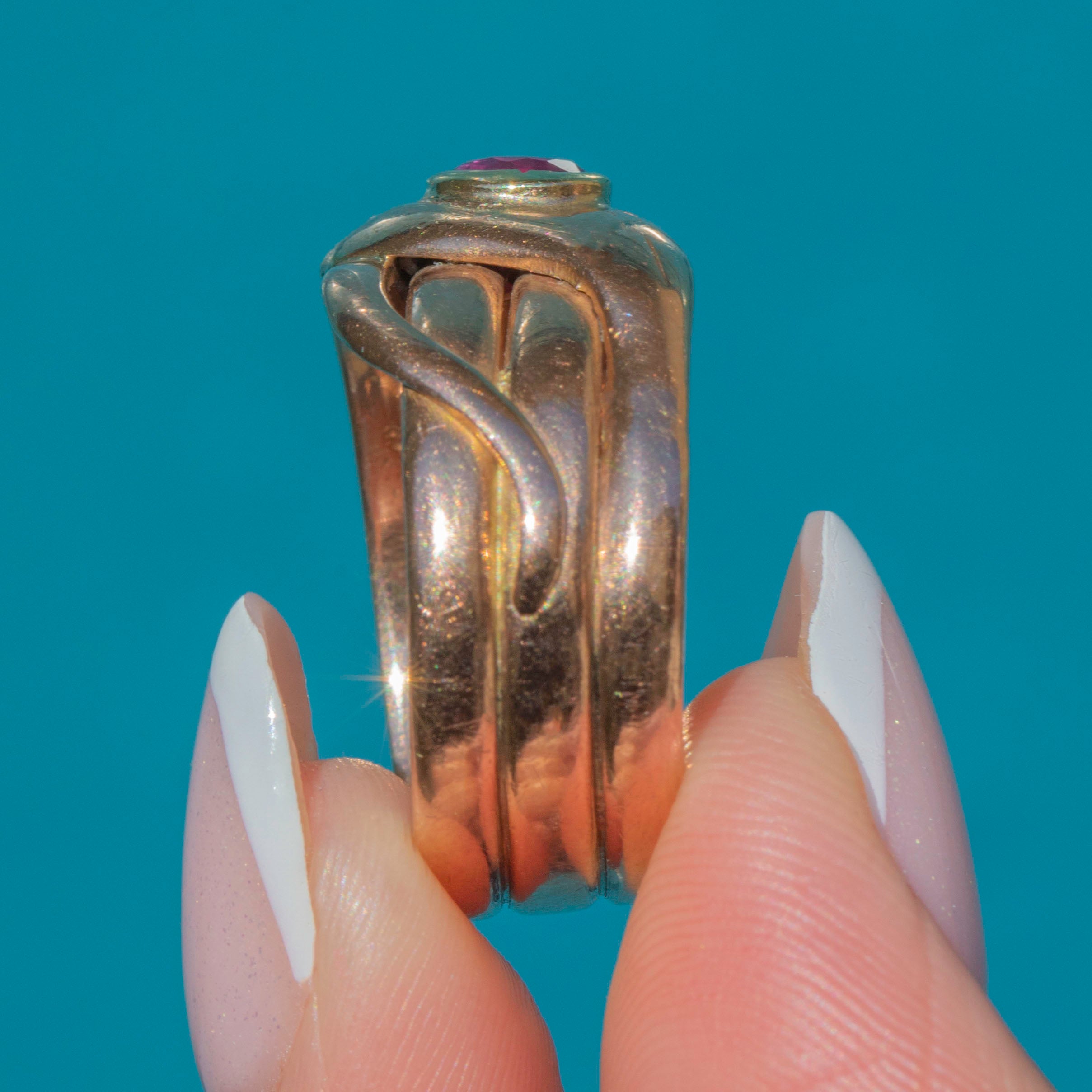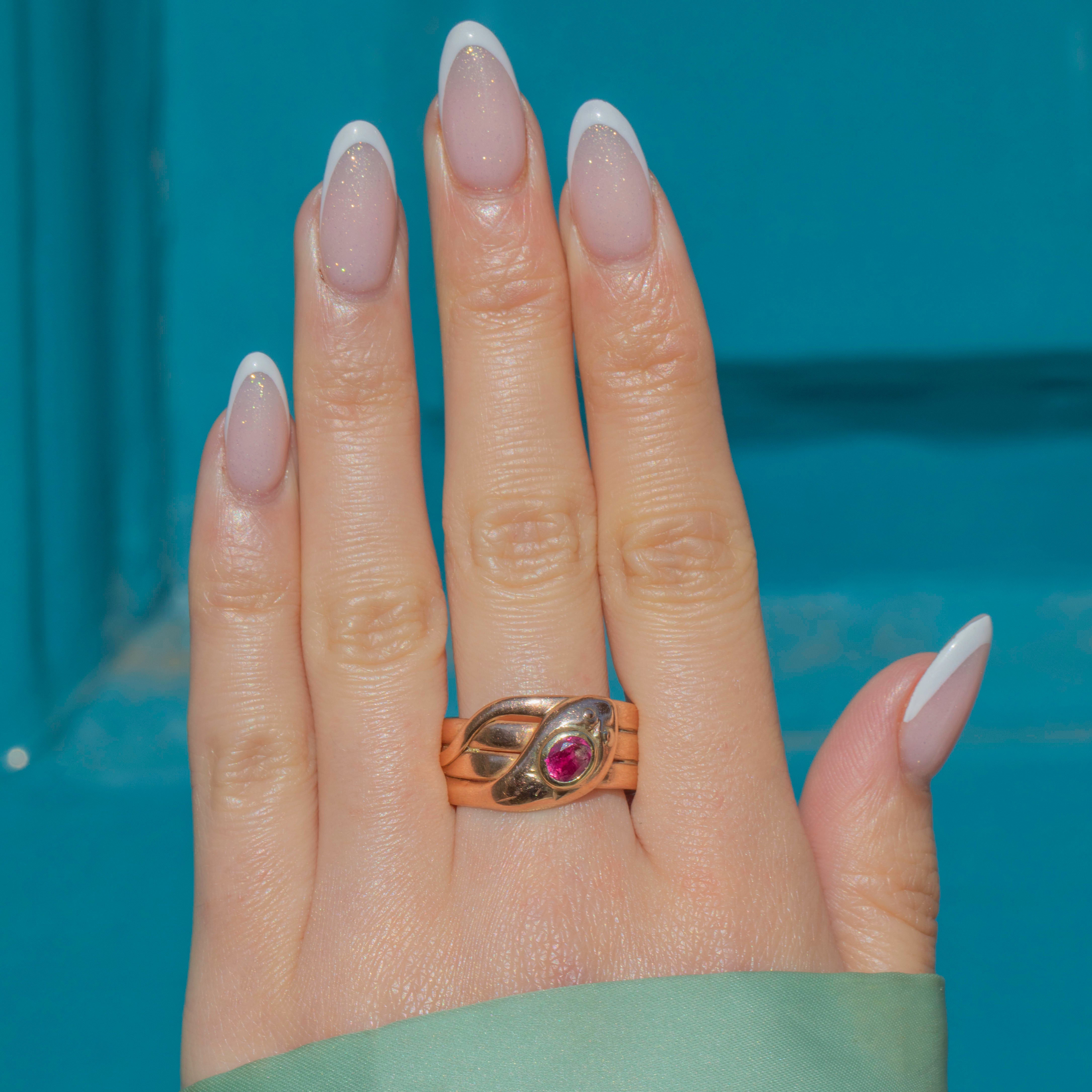 This antique 9ct Gold Ruby snake ring is sure to be top of your wishlist! The ring has been handcrafted from 9ct Gold, and the head of the snake is set with a gorgeous fuchsia-hued 0.55ct Ruby.