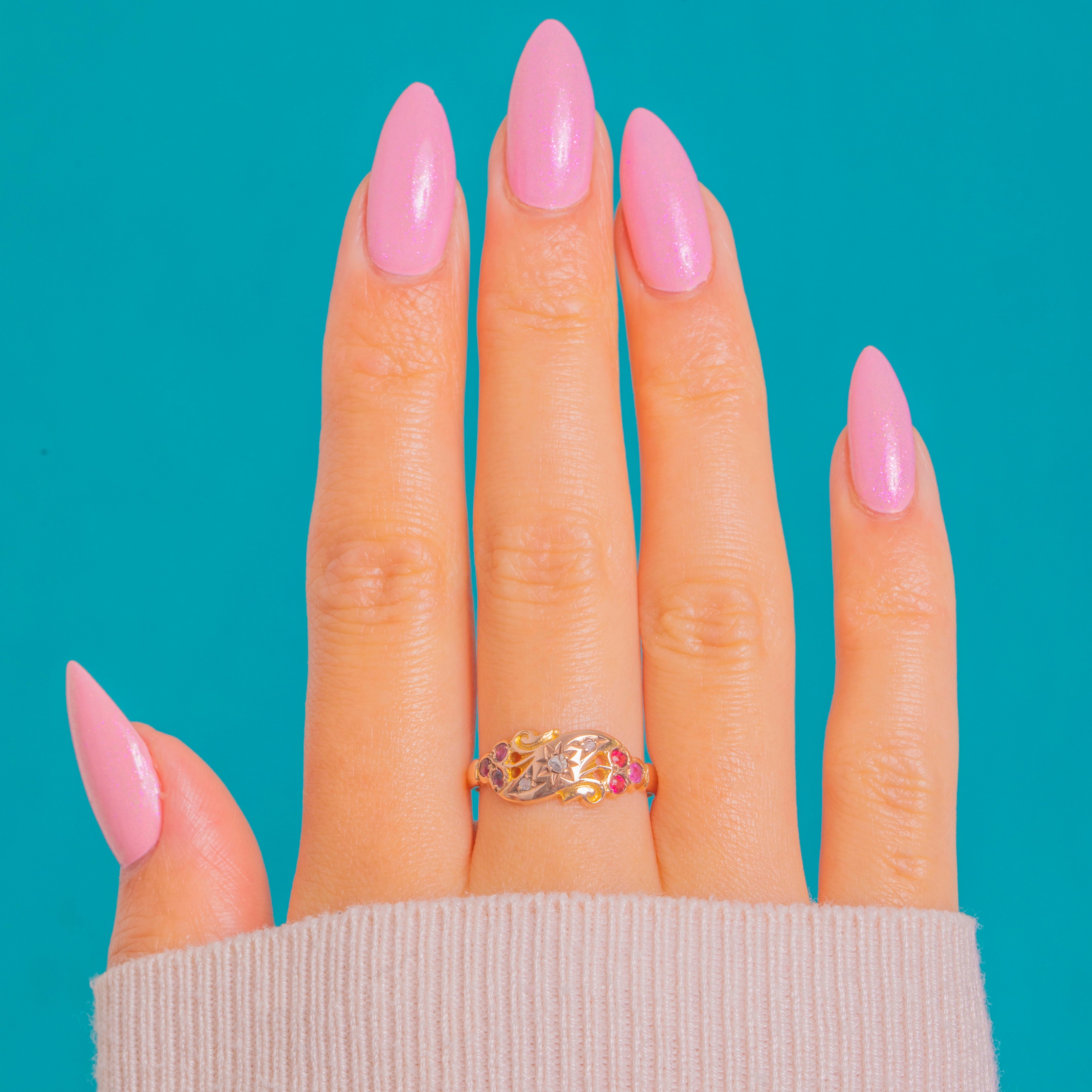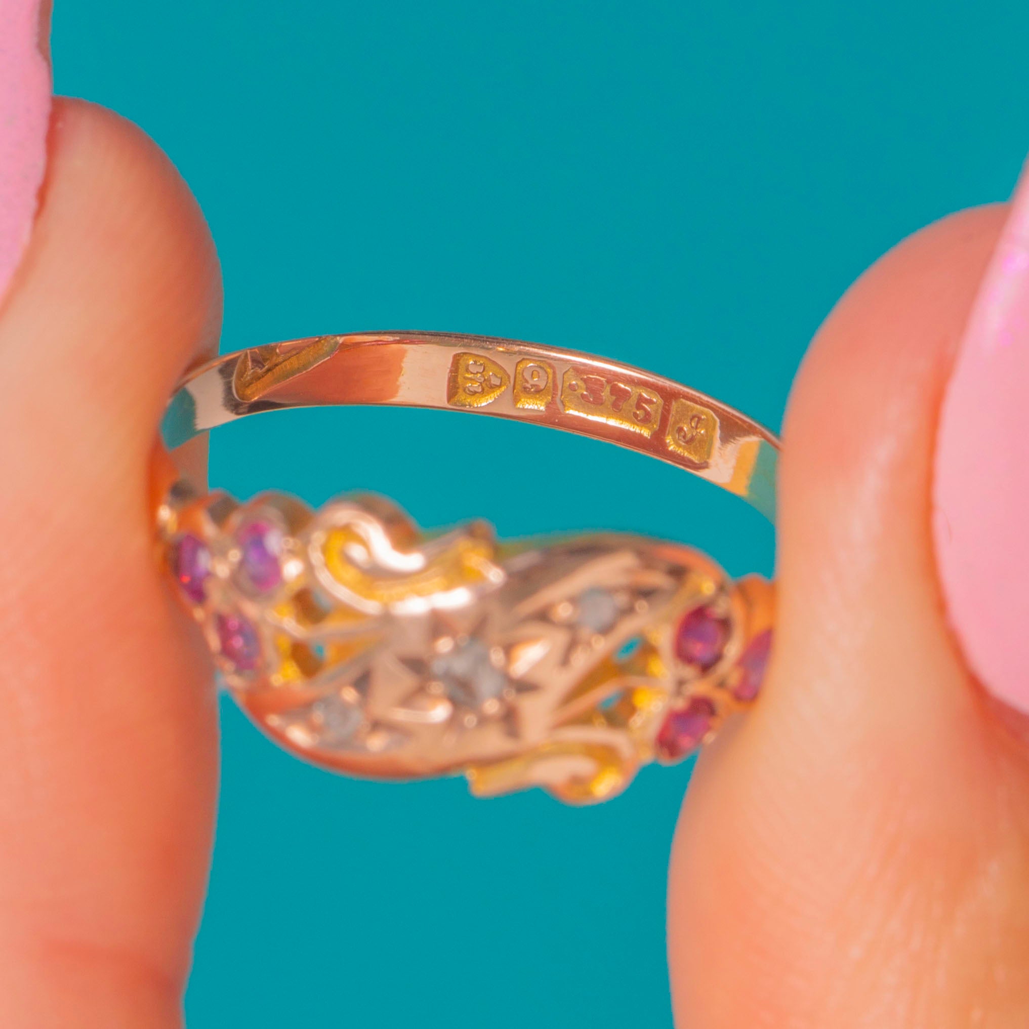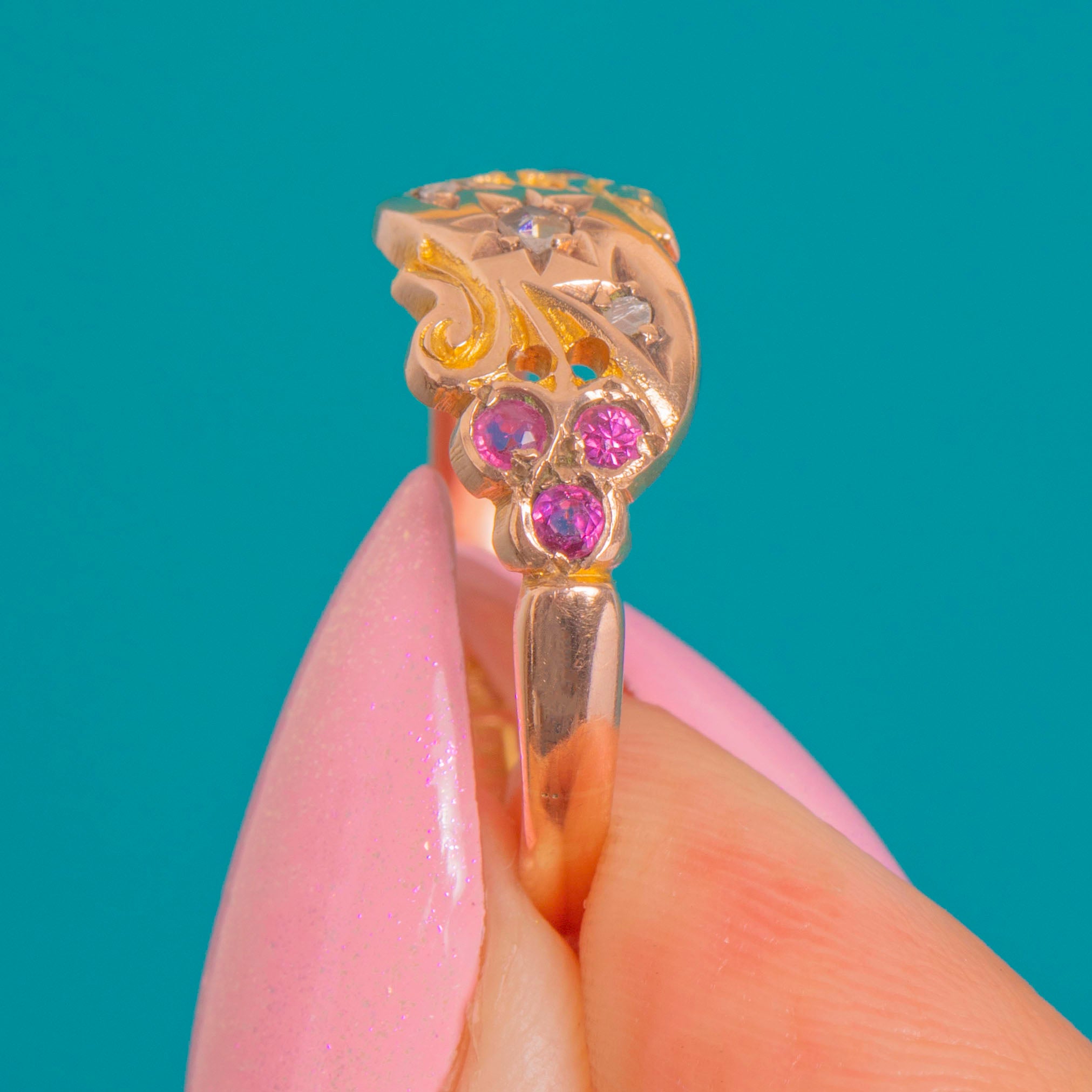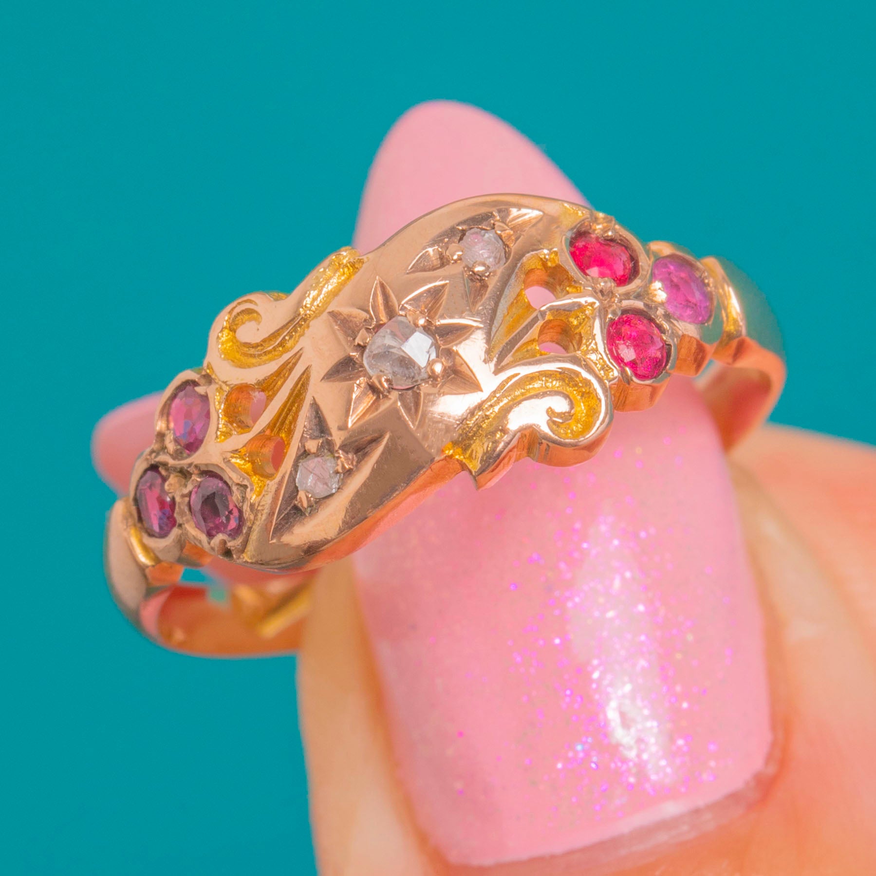 EXCELLENT: The Rose-cut Diamond and Rubies are securely set with no obvious chips, showing only light age-consistent wear under magnification. The Gold shows gentle surface wear with crisp engraving and a well-preserved pierced gallery. A subtle seam near the hallmarks suggests a past resize; it is smooth, stable and unobtrusive in wear.