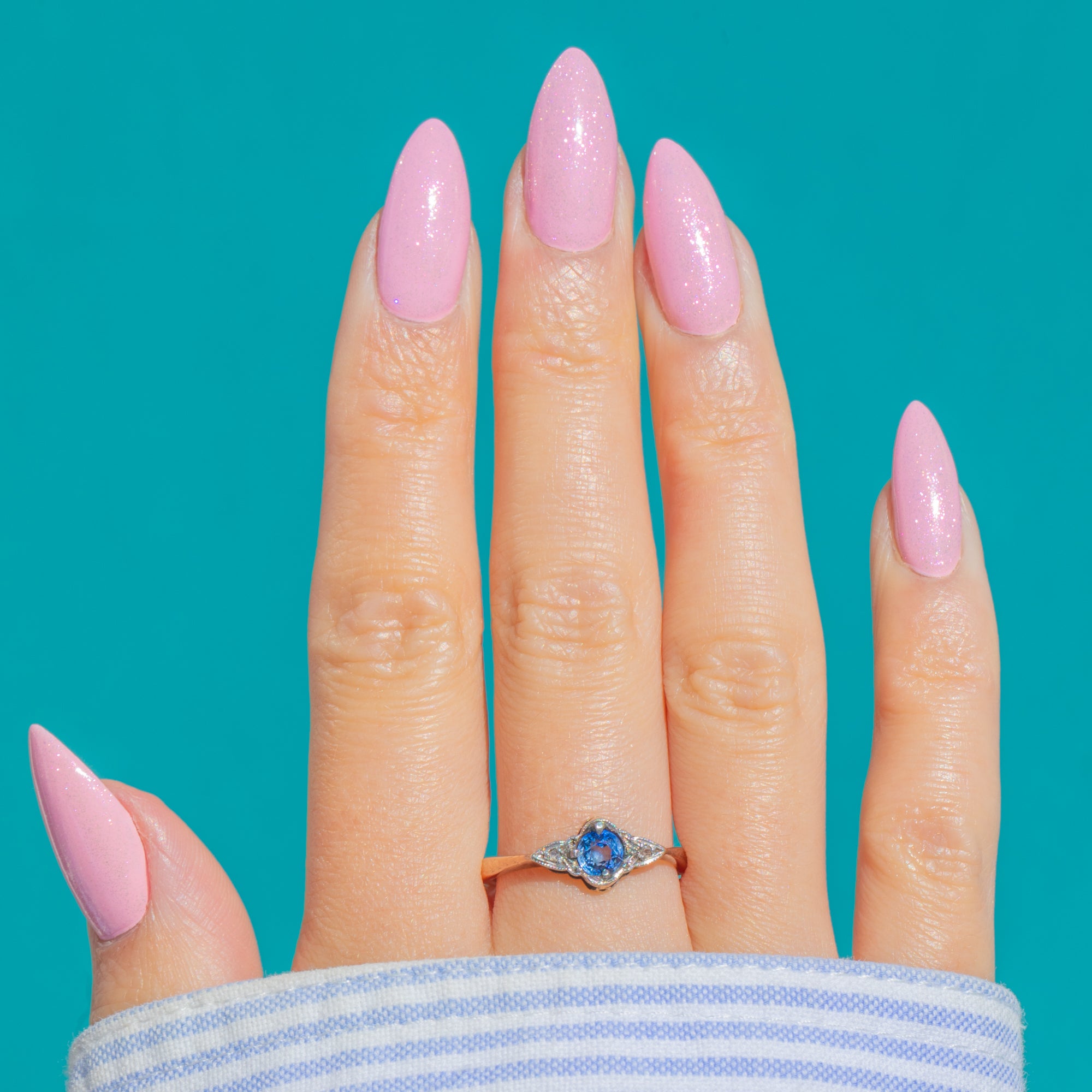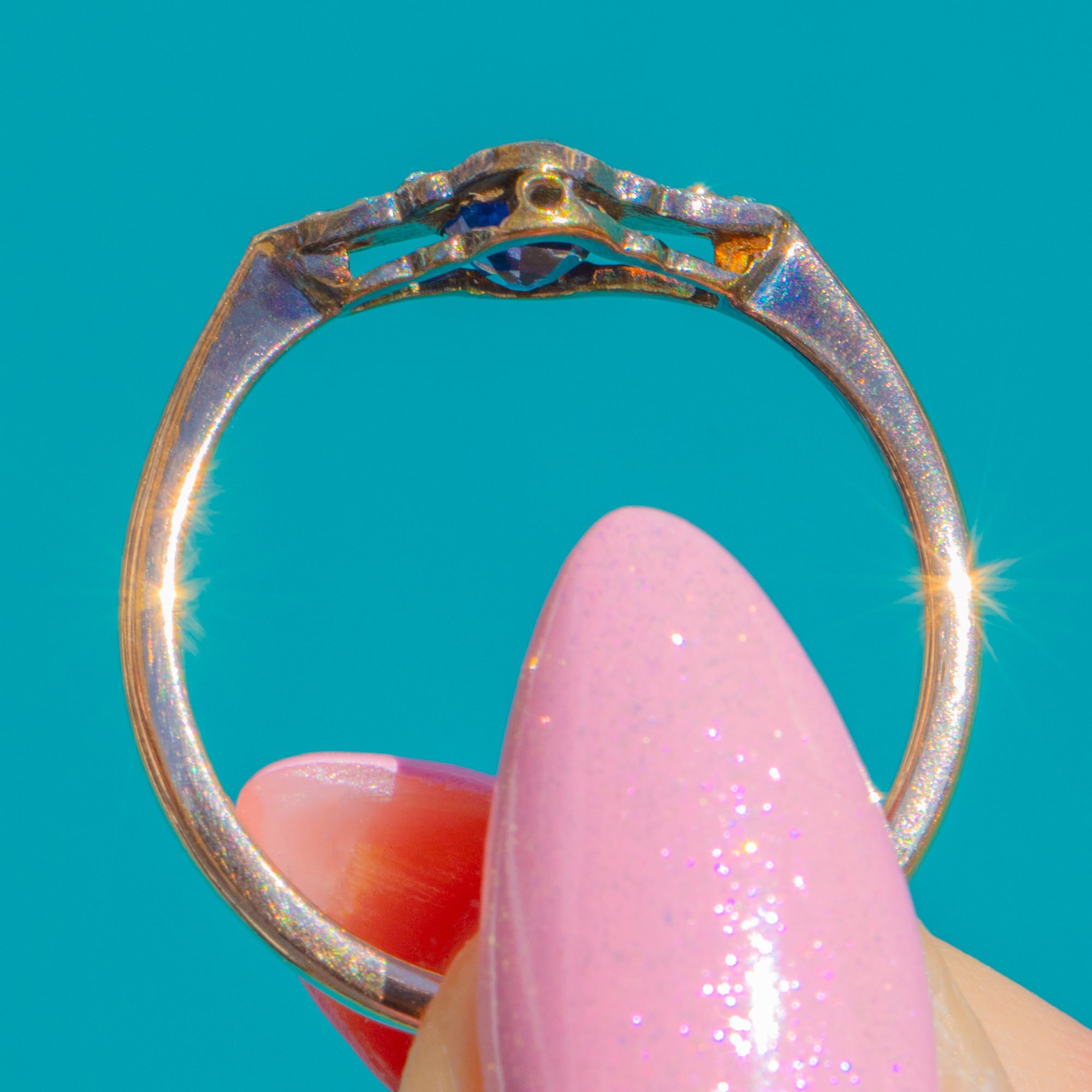 A delicate early 20th-century beauty, this antique ring centres a vivid, cornflower-blue Sapphire framed by a white-toned, milgrained head and flanked by twinkling rose-cut Diamond accents. The low, hand-finished collet and pierced gallery lend wonderful finesse, while the slender warm Gold shank creates an elegant two‑tone look that feels timeless on the hand.