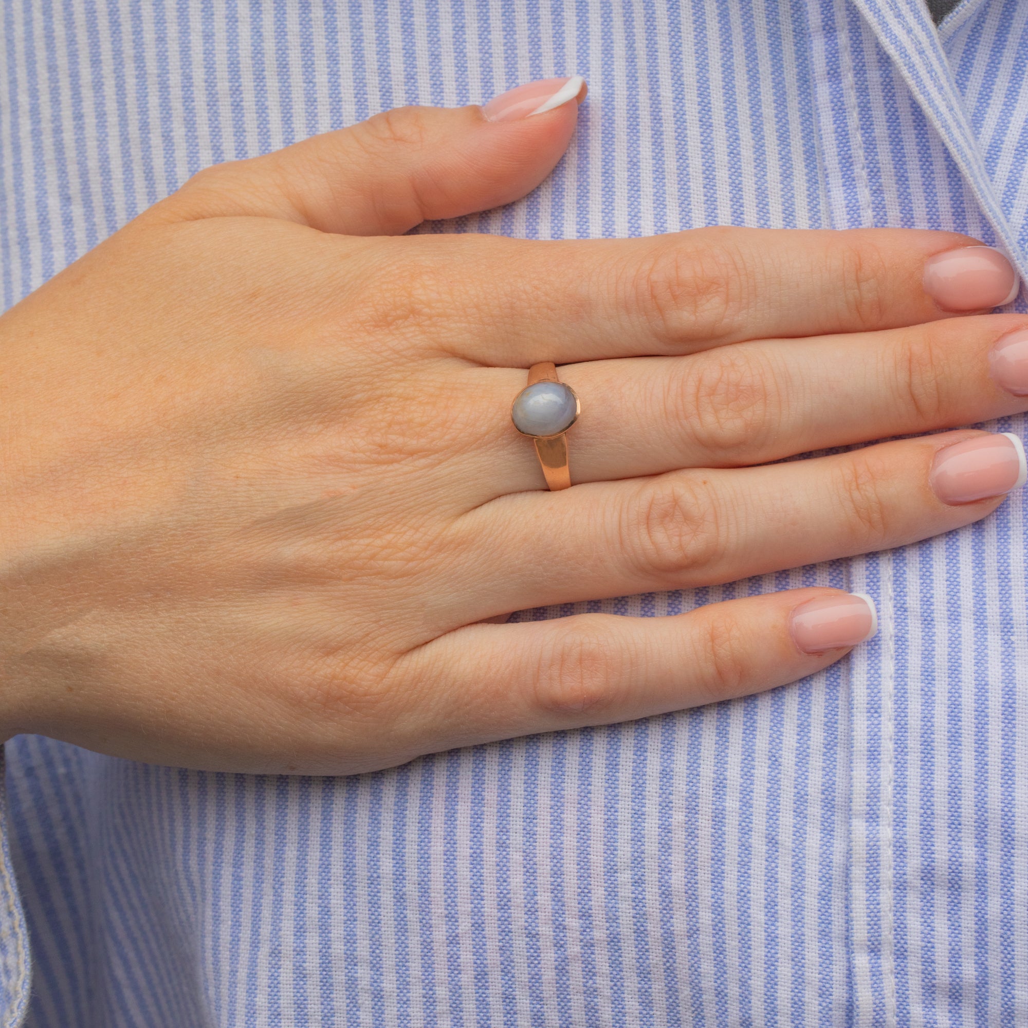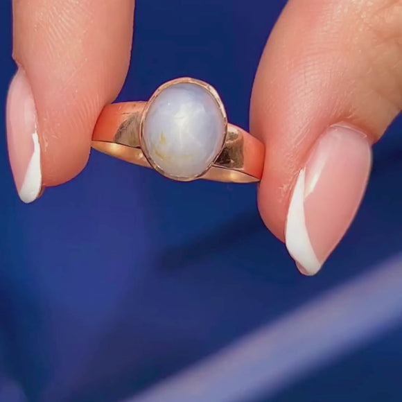 Add some celestial charm to your repertoire with this antique 9ct Gold star Sapphire ring! Homing a cloudy lilac 3.45ct Sapphire cabochon, as the light glides over her smooth surface a six point star reflects off of her surface, a testement to the wonders of mother nature.
