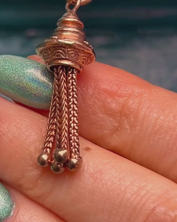 This impressive antique 9ct Gold tassel pendant is a must-have for your collection. Adorned with ornate engravings and rope detailing that flows around the dome, she is bursting with Victorian charm.