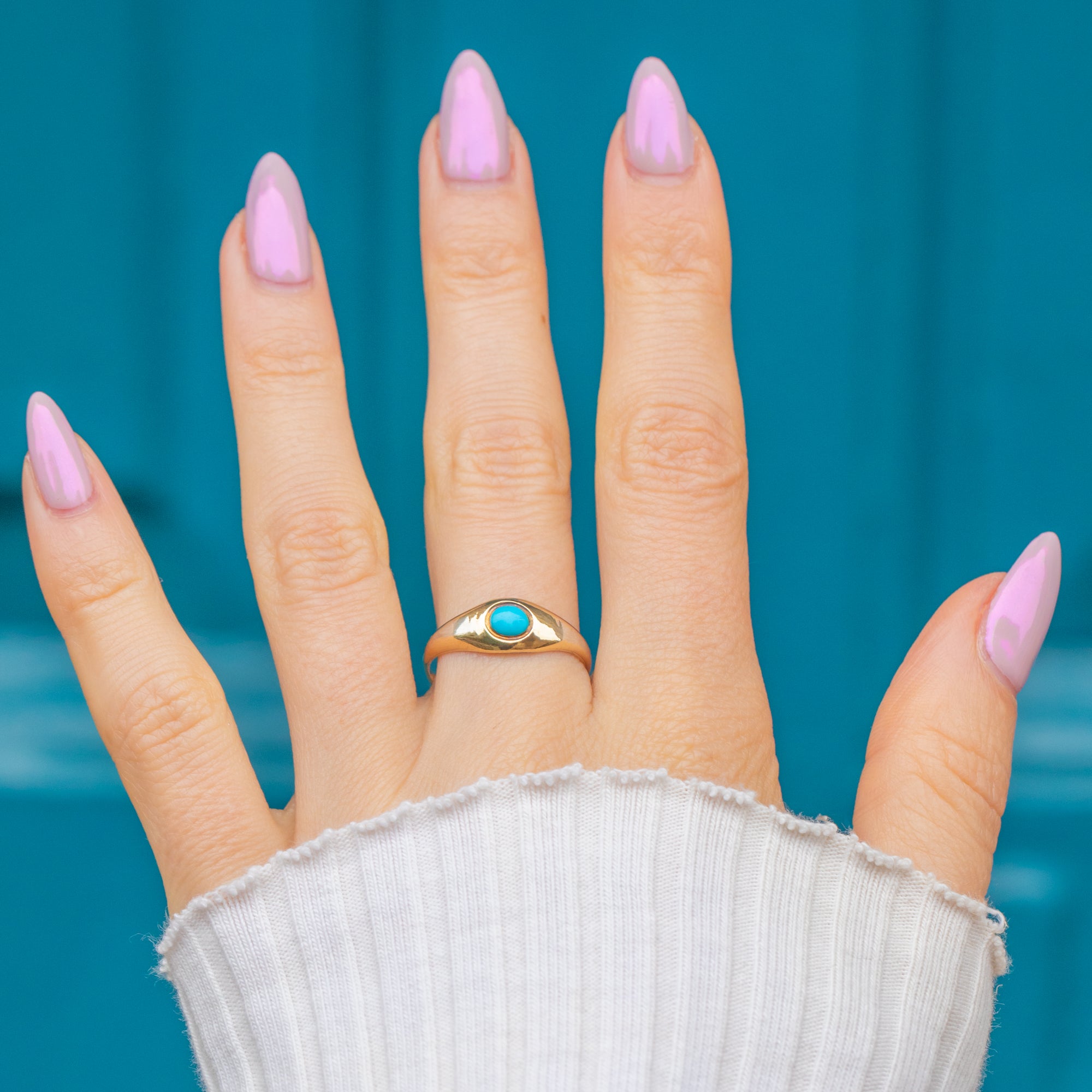 A charming antique 9ct Gold Turquoise solitaire ring featuring a single Turquoise cabochon set flush within a smooth 9ct Gold setting. The simple yet elegant design allows the vivid blue of the Turquoise to take centre stage, a lovely example of the understated beauty of early 19th-century jewellery.