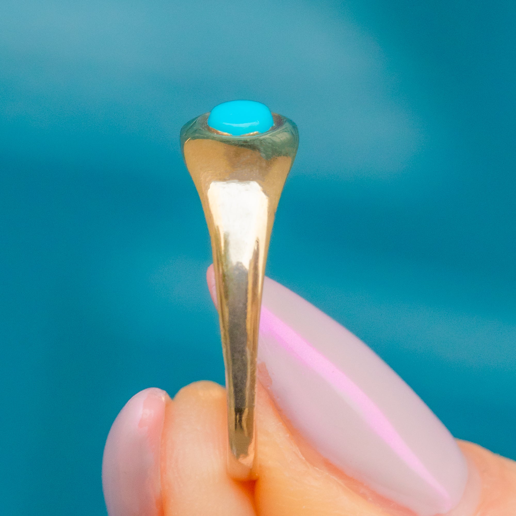 VERY GOOD: The Turquoise is securely set and retains its vibrant blue hue. Some of the original shoulder detailing has worn smooth over time, likely once engraved, but the Gold remains strong and comfortable to wear. A beautiful and authentic early Victorian ring with antique charm.