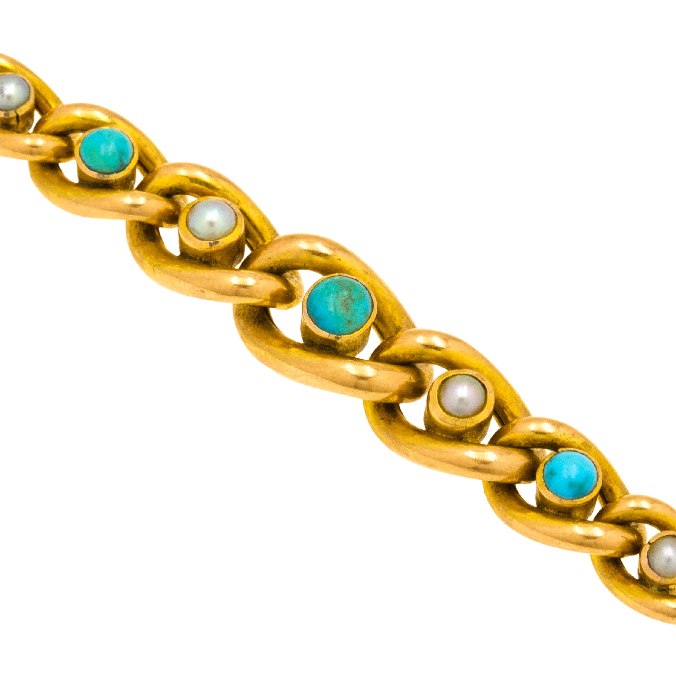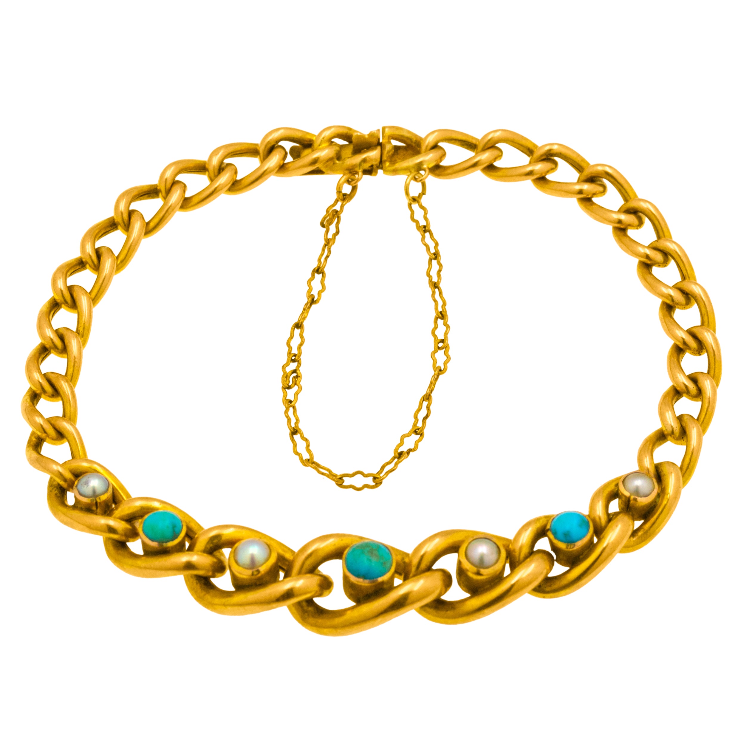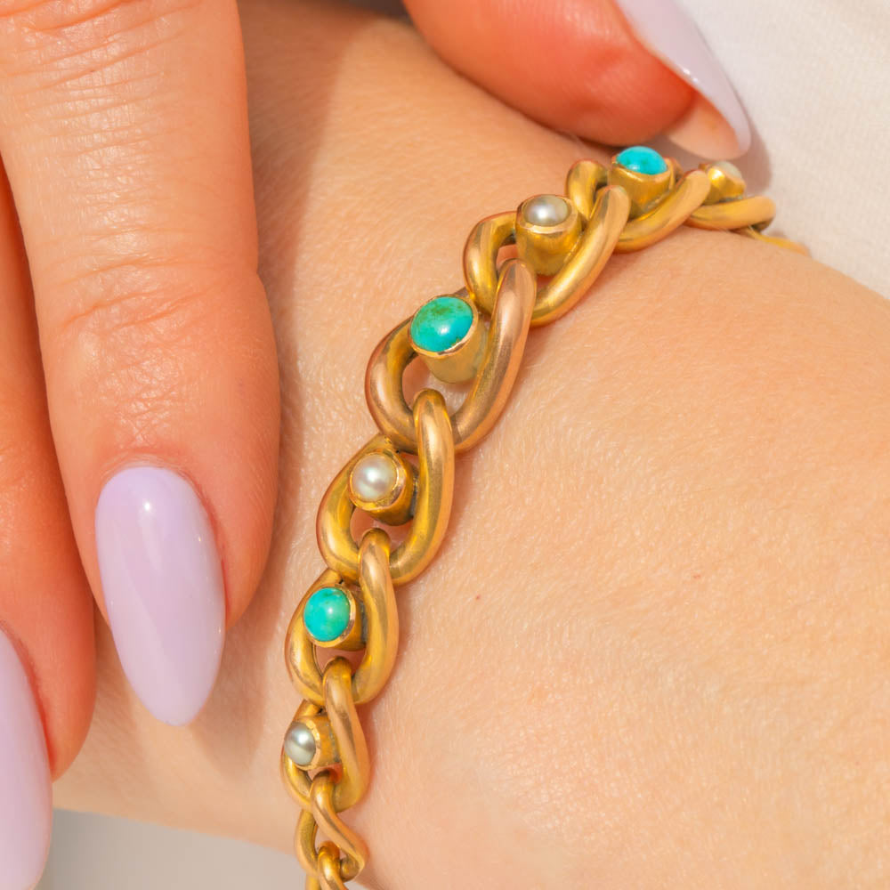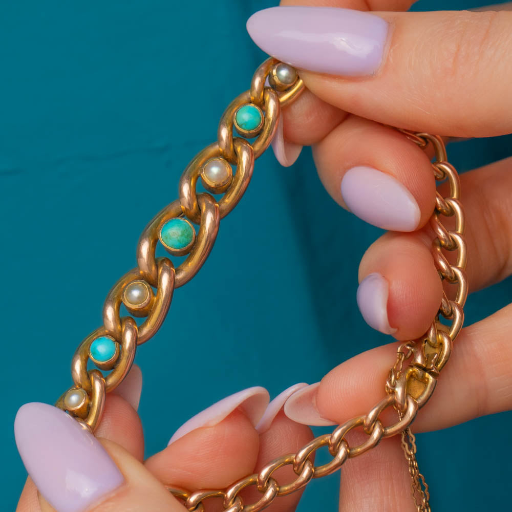 EXCELLENT. This antique 9ct Gold Turquoise Pearl curb link bracelet is in excellent condition. The 9ct Gold is in lovely shape throughout, all the gemstones are securely set and smooth to the touch, free from any damage to note. The bracelet is complete with a safety chain allowing you to wear her with utmost confidence!
