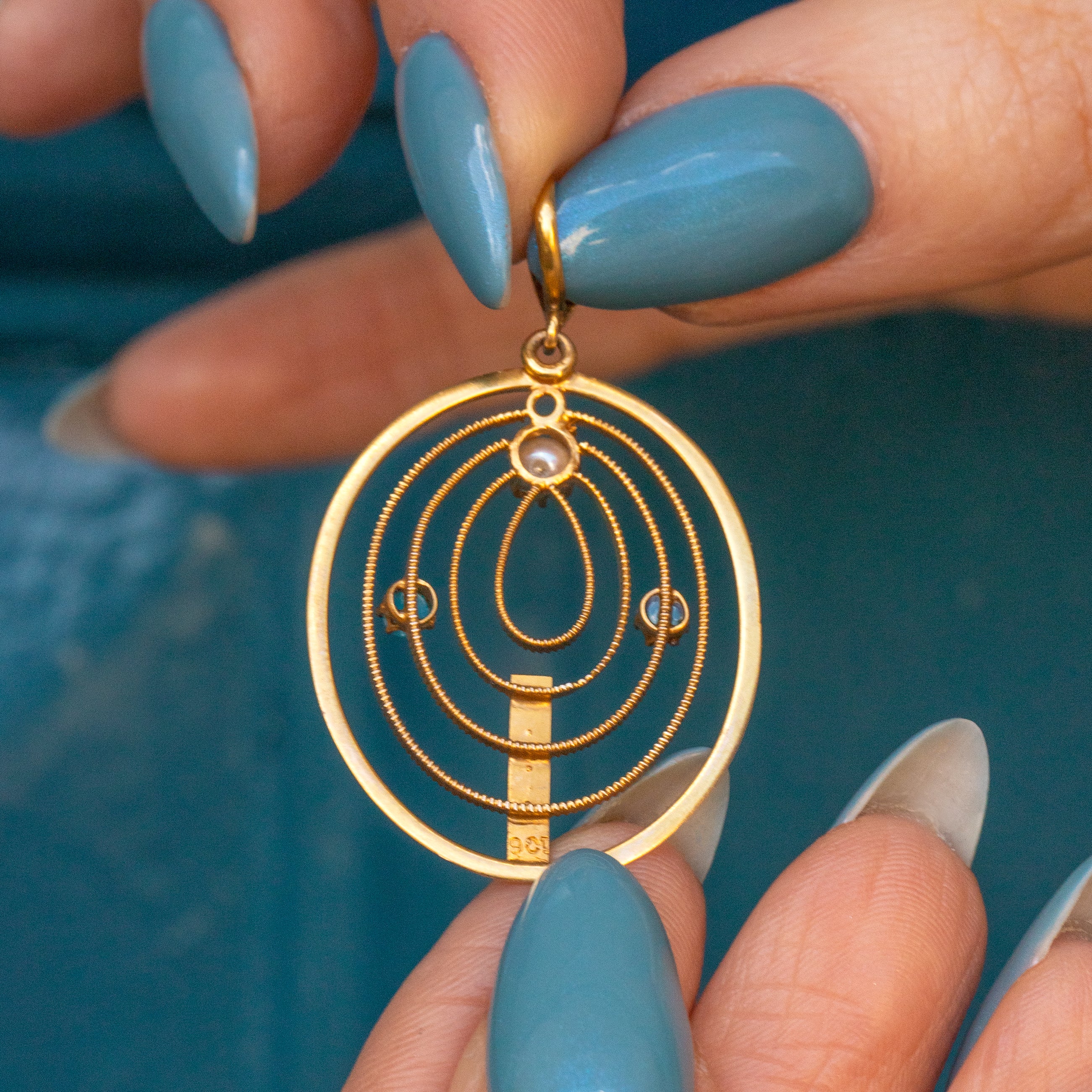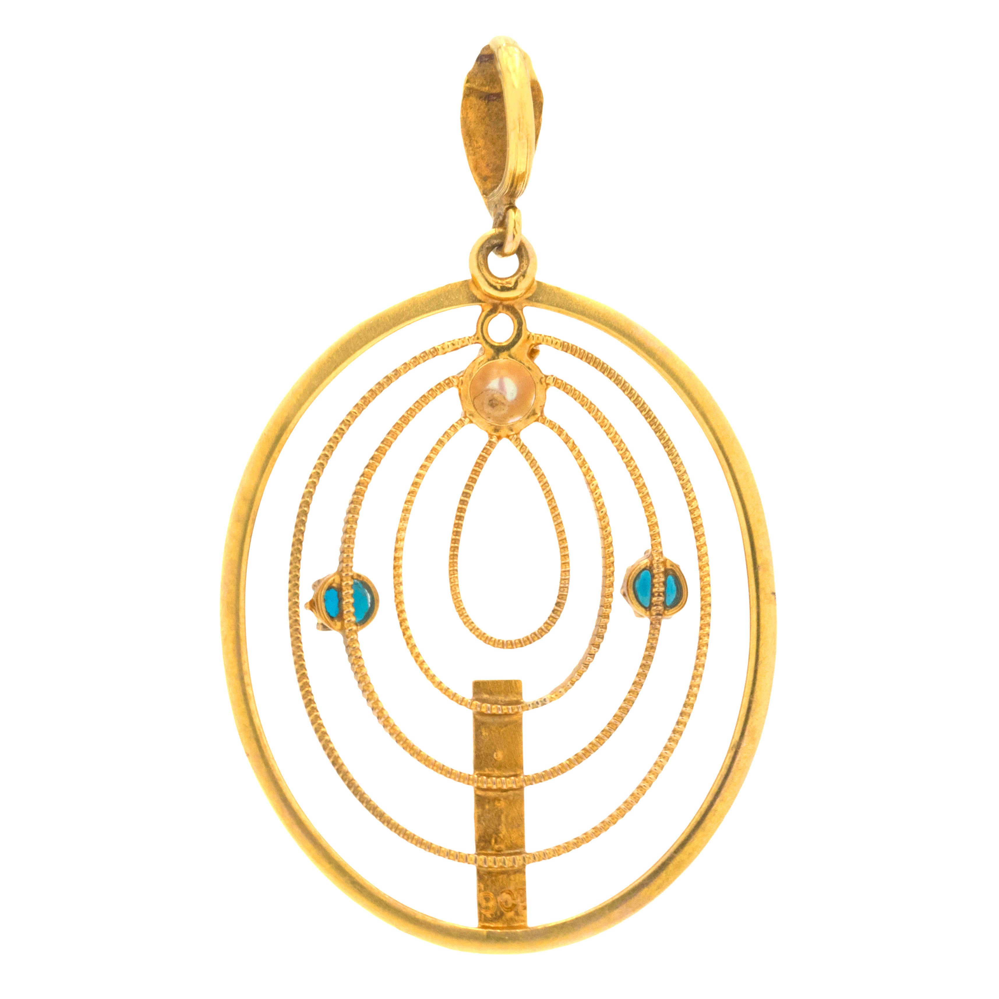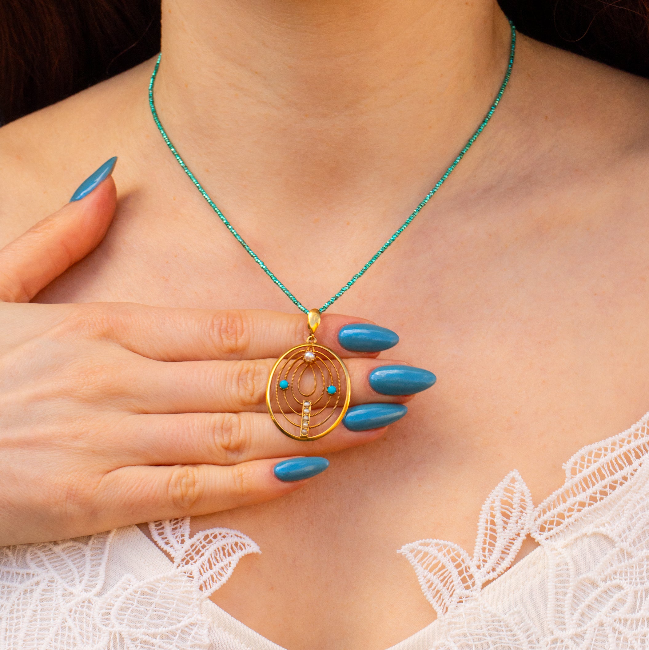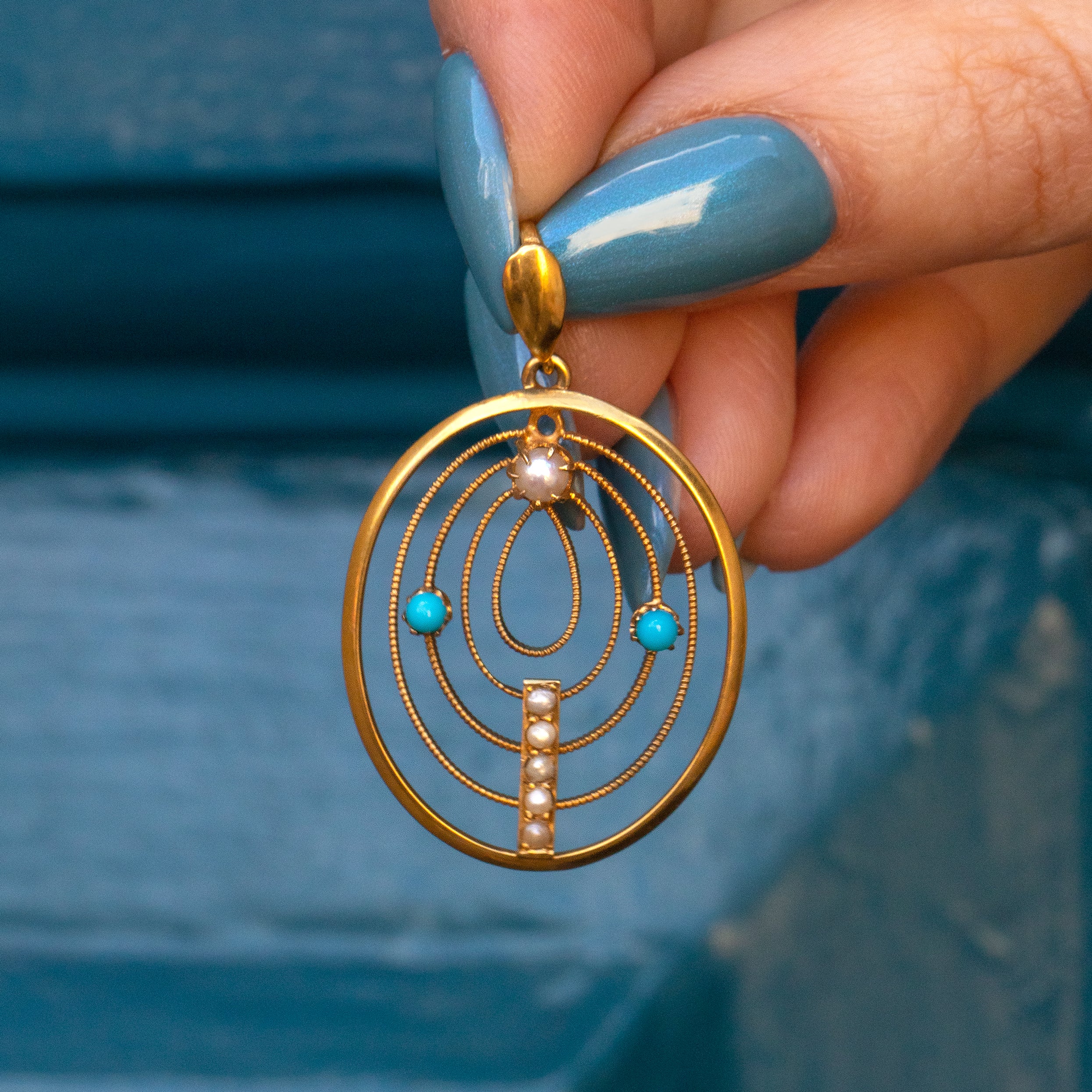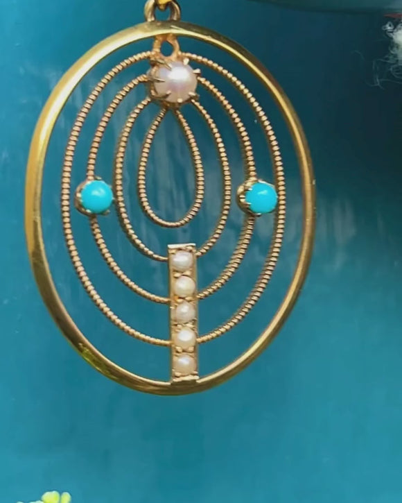 This sublime antique 9ct Gold Turquoise Pearl pendant is an eye-catching piece, displaying cerulean blue Turquoise gems alongside luminous Pearls!