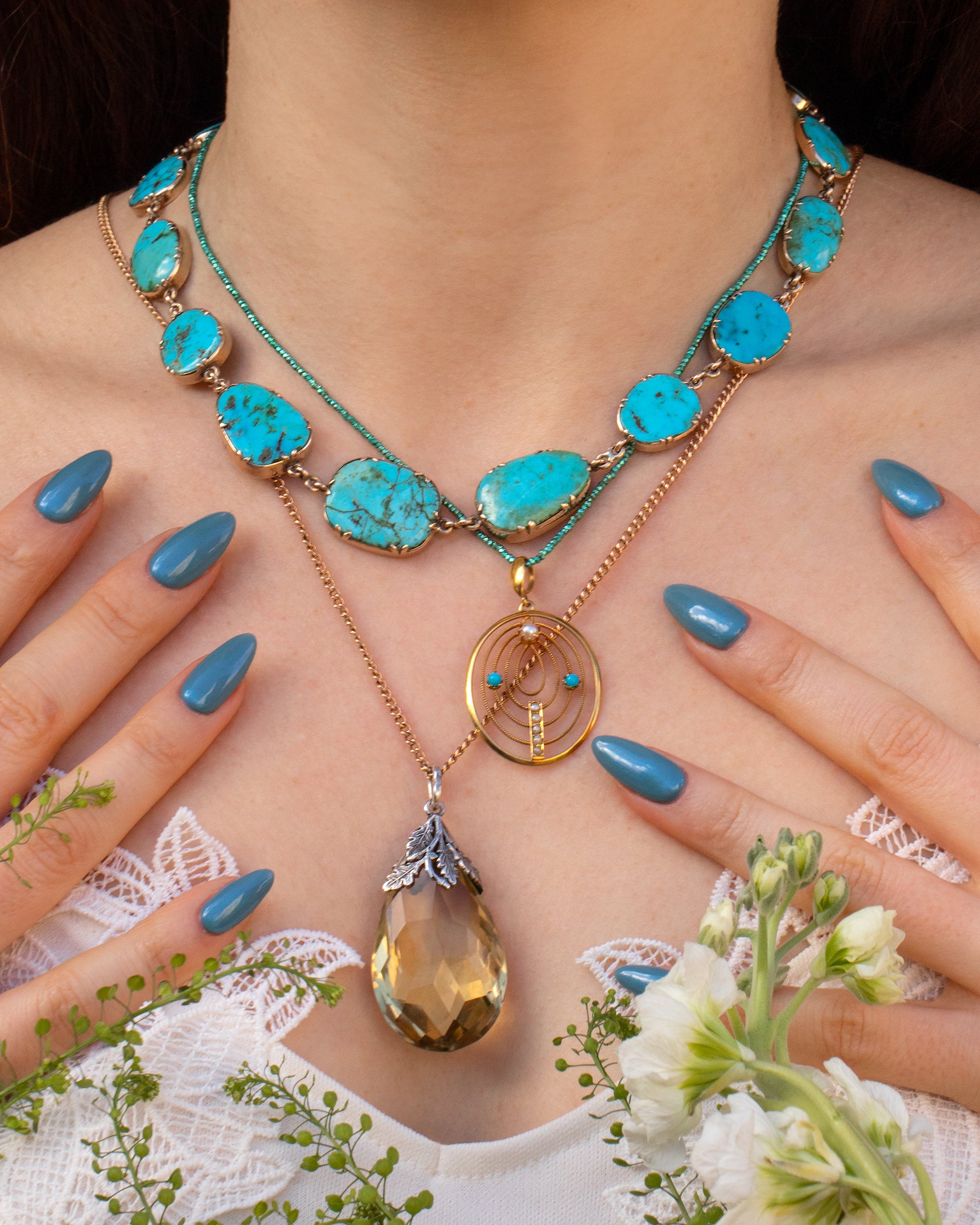 The 9ct Gold that links the whole pendant together has a buttery yellow hue that is utterly inviting and makes the most elegant backdrop for the divine Pearls and Turquoise gemstones. Simply suspend this striking antique Gold pendant from your favourite chain to inject a touch of antique charm into any outfit!
