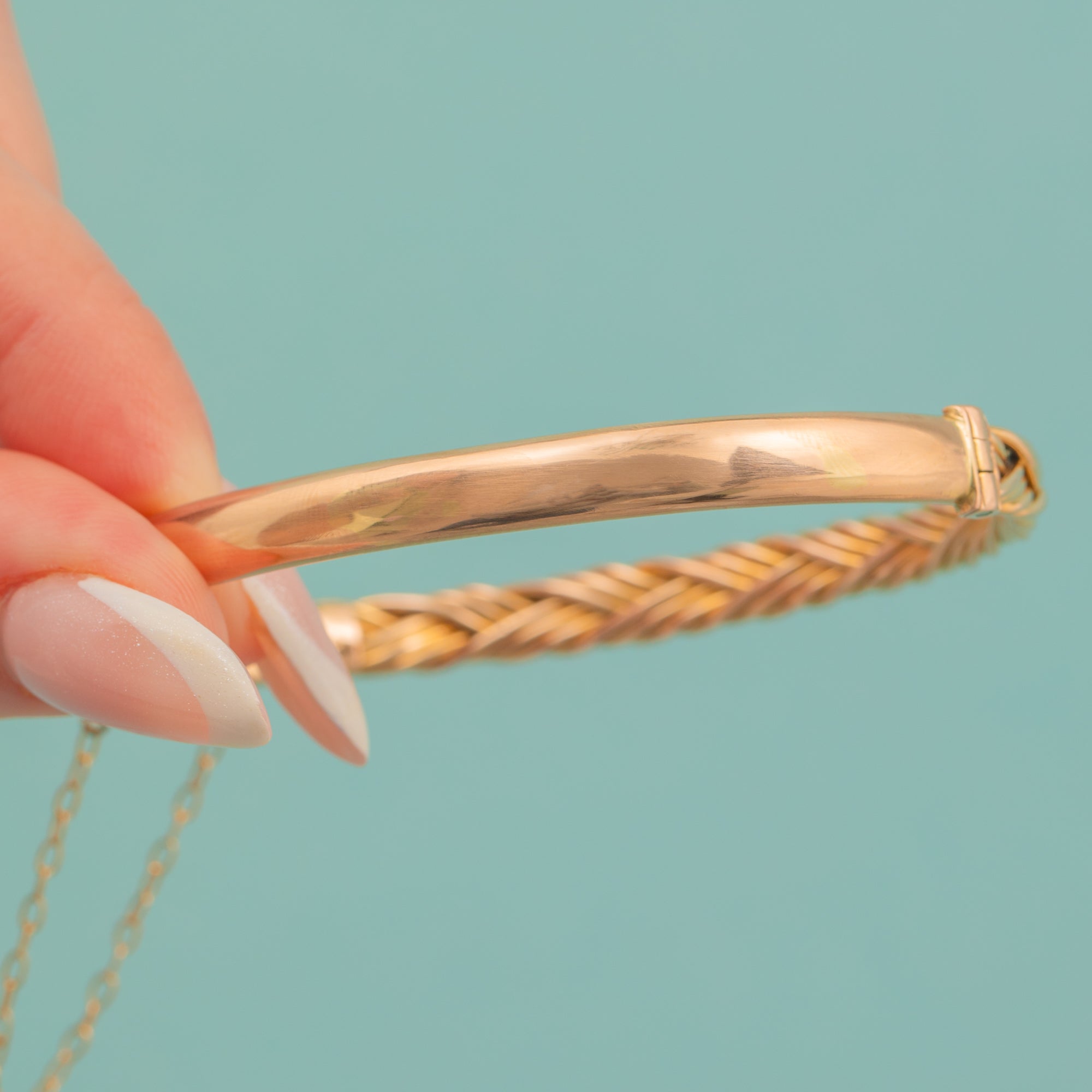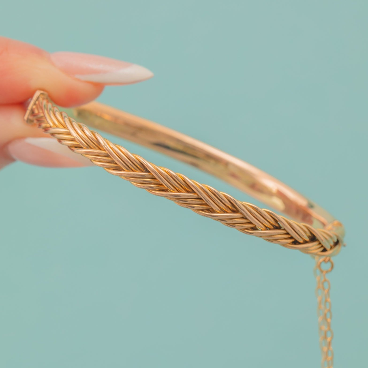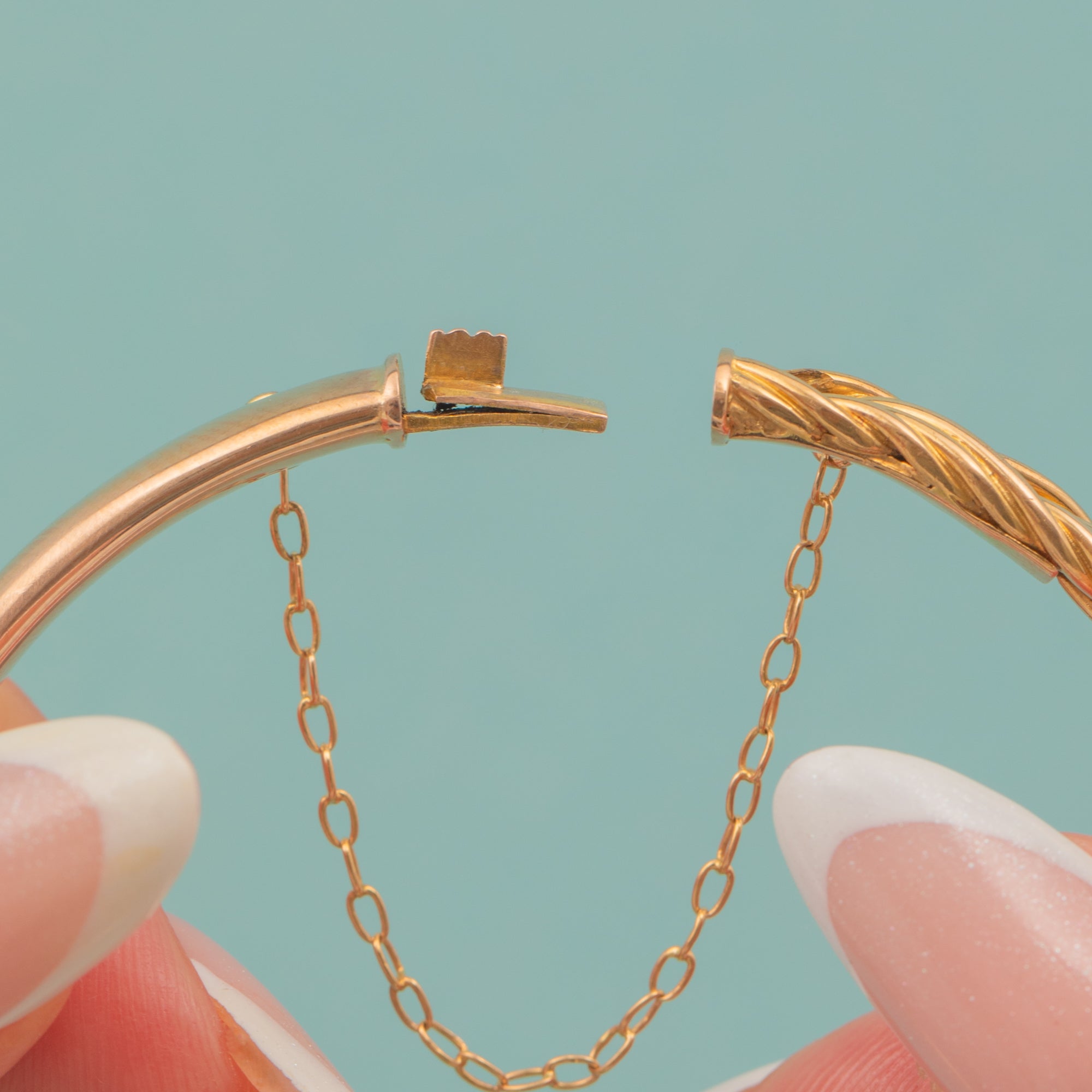 Complete with a safety chain, this antique Gold bangle can be worn with confidence all year round!