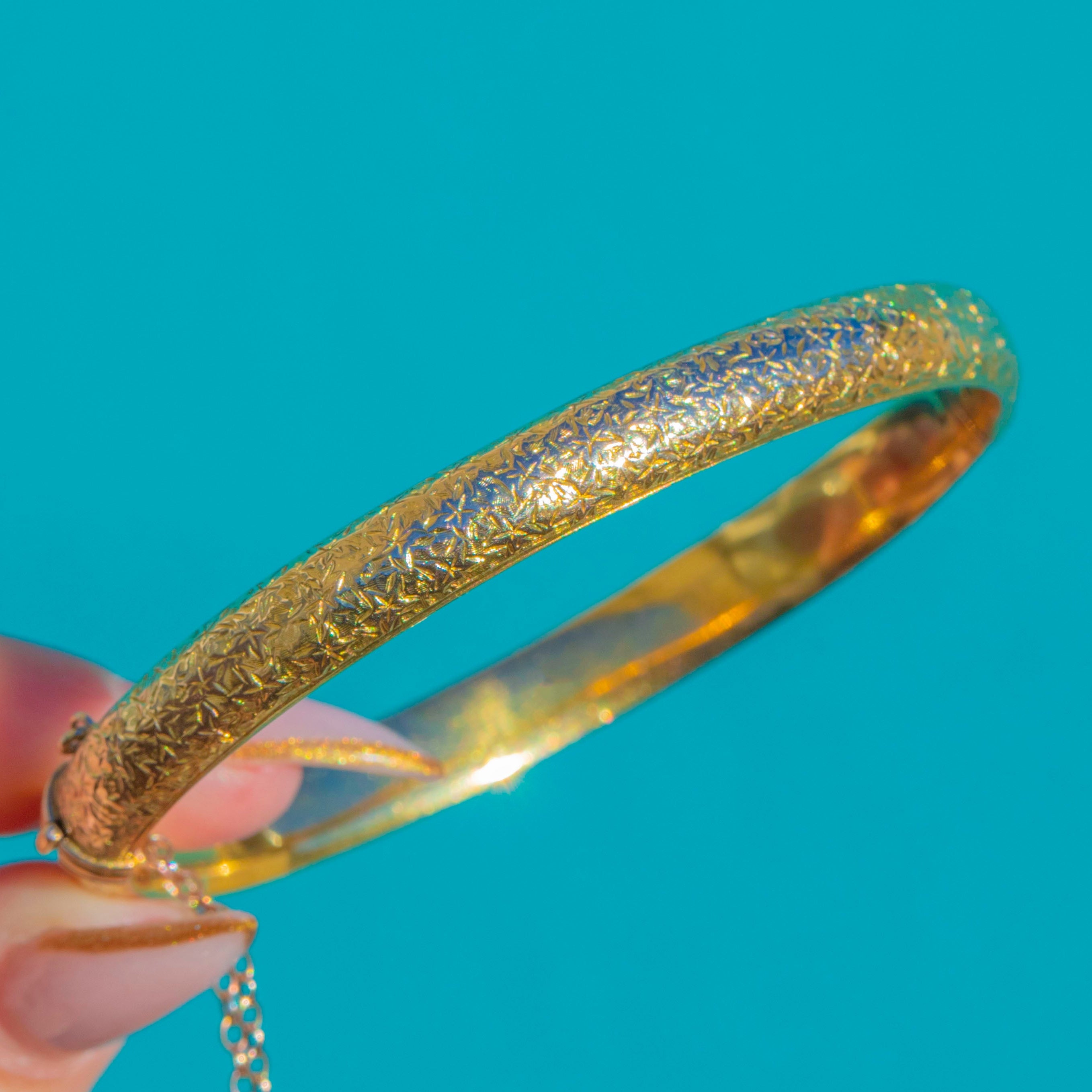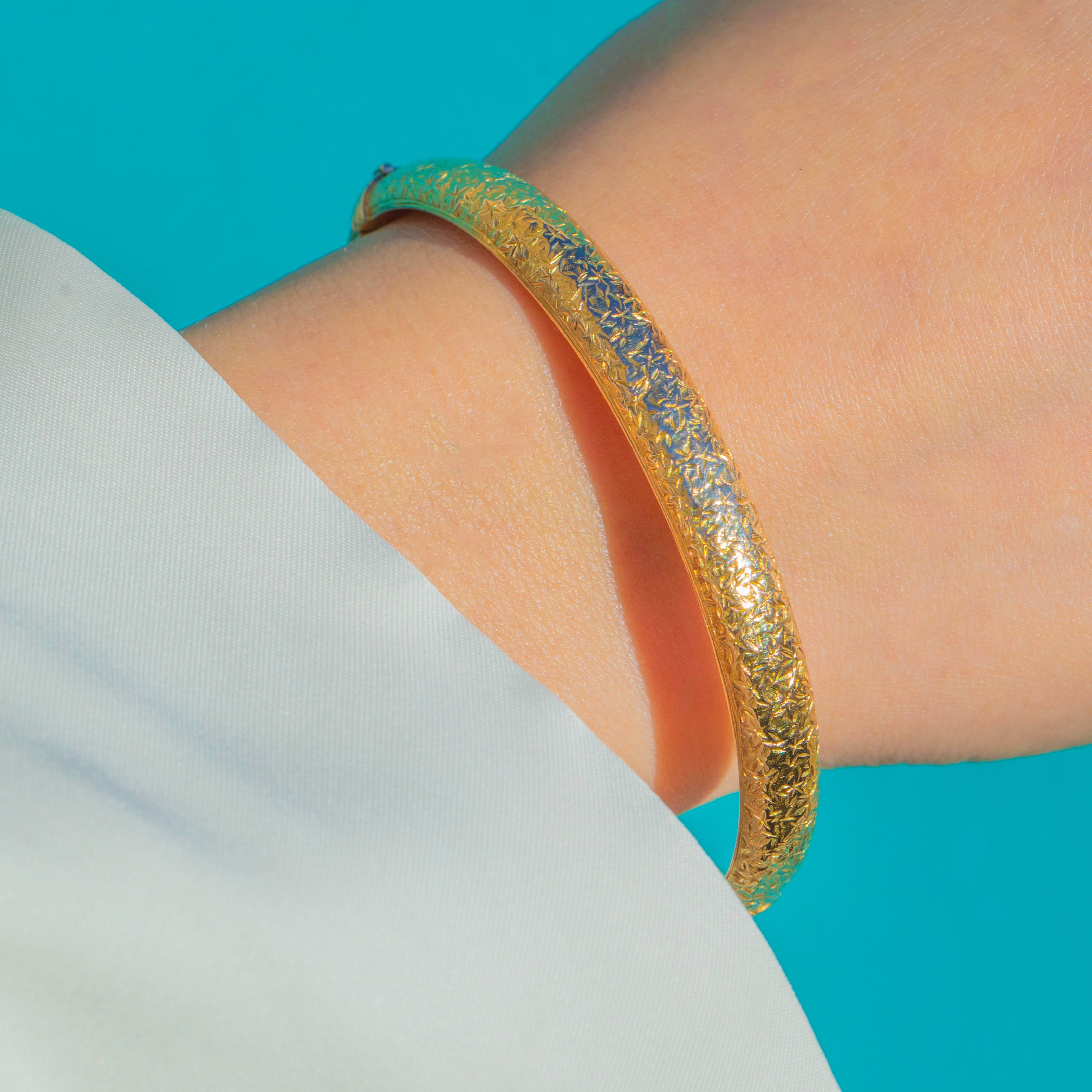 VERY GOOD: Engraving is crisp with light surface wear in keeping with age. Gold shows a soft antique patina. Clasp closes securely. A well-preserved early 20th-century bangle.