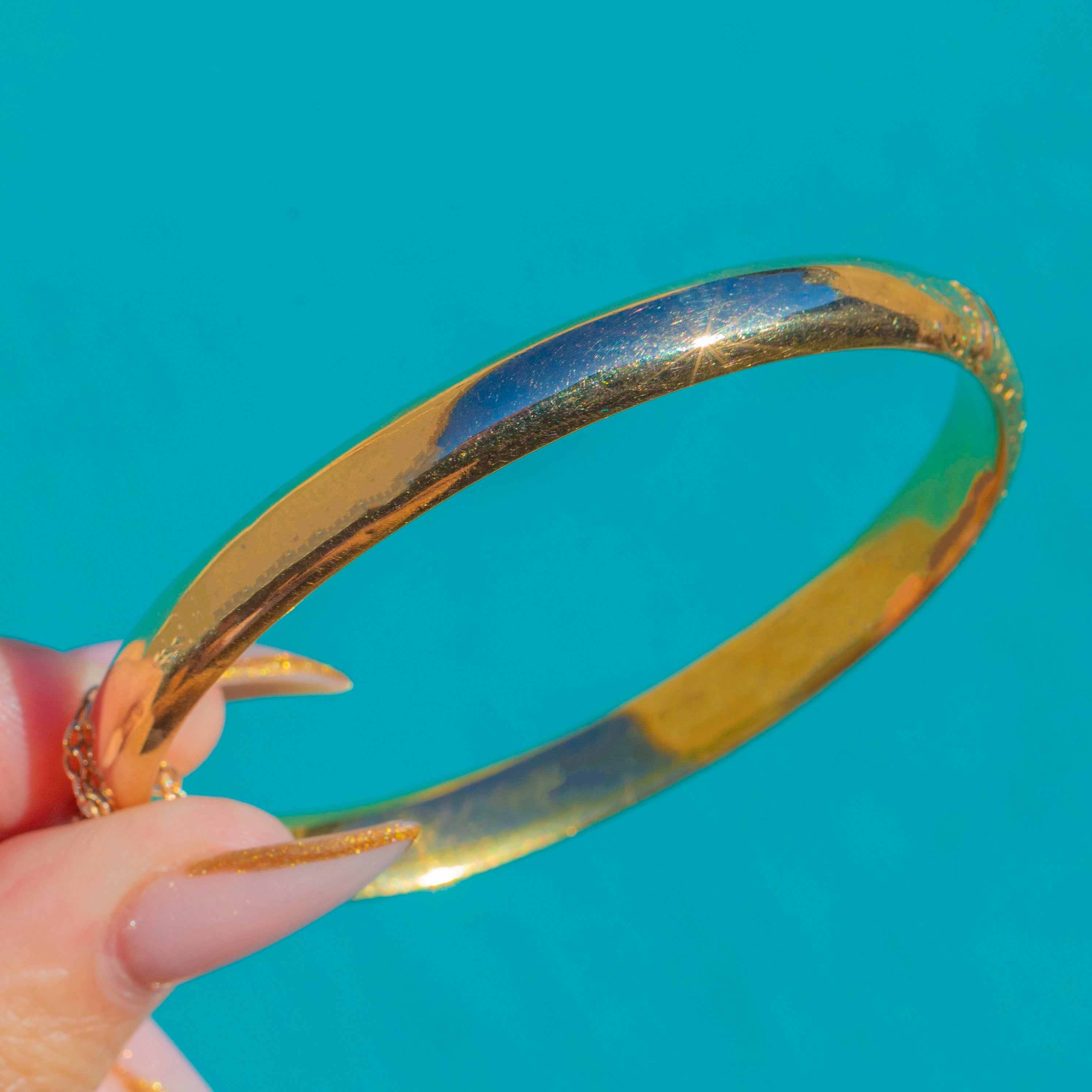 This beautiful Antique 9ct Gold bangle is richly engraved with flowing leaf motifs, giving it a romantic, organic feel typical of early 20th-century design. Crafted in buttery Yellow Gold, it has a smooth rounded profile and a lovely gentle patina that only true antique Gold develops.