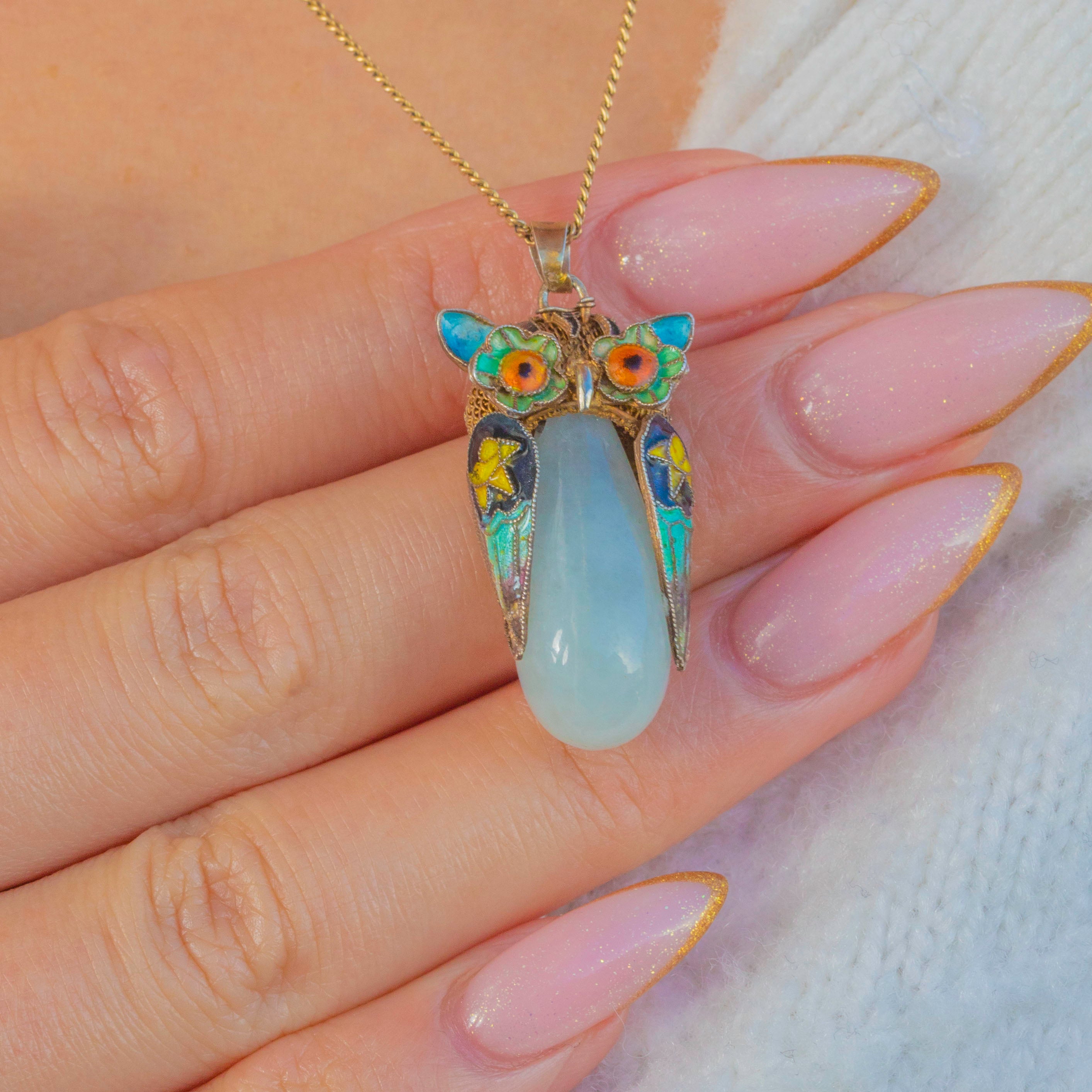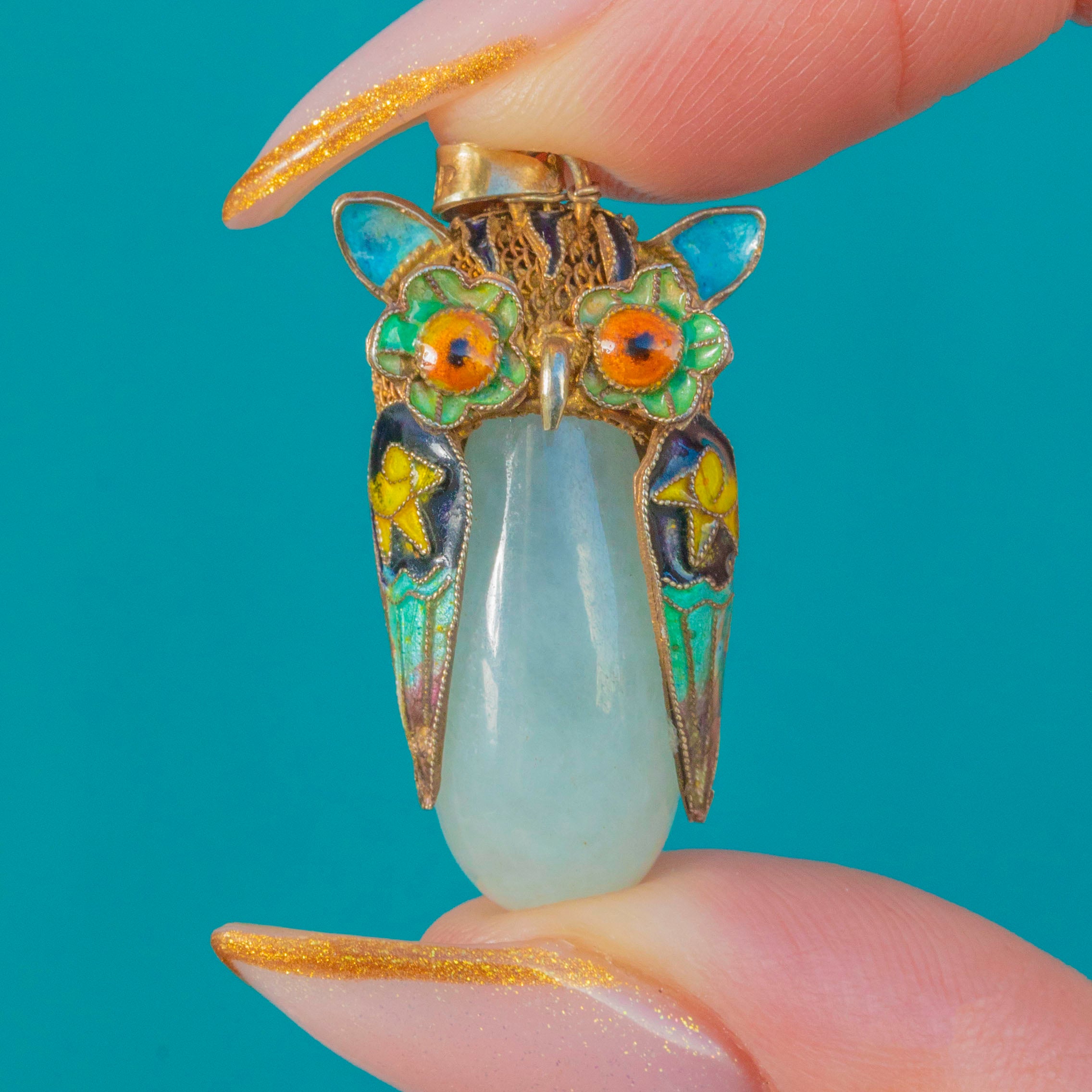 Antique Chinese Jade & Cloisonné Enamel Owl Pendant