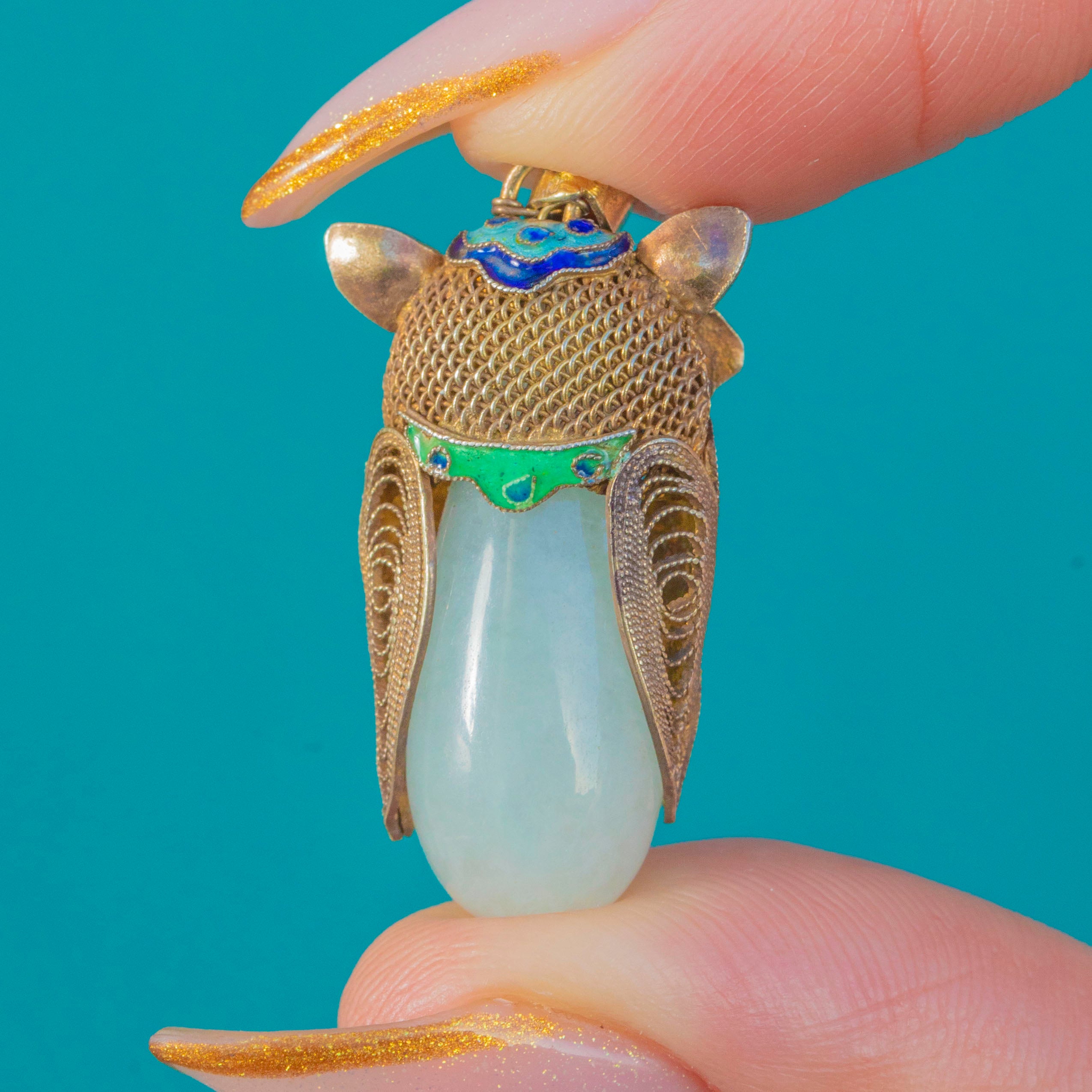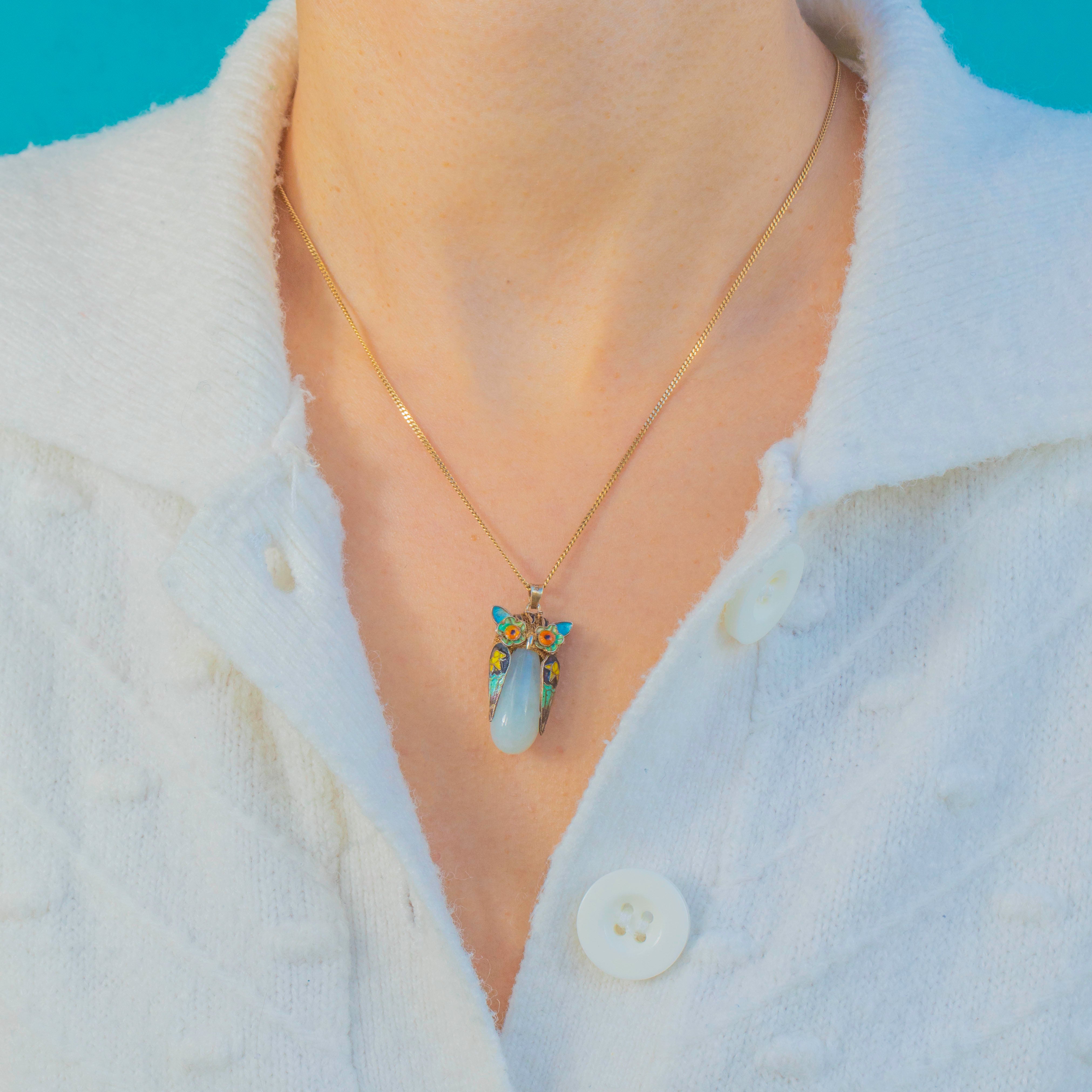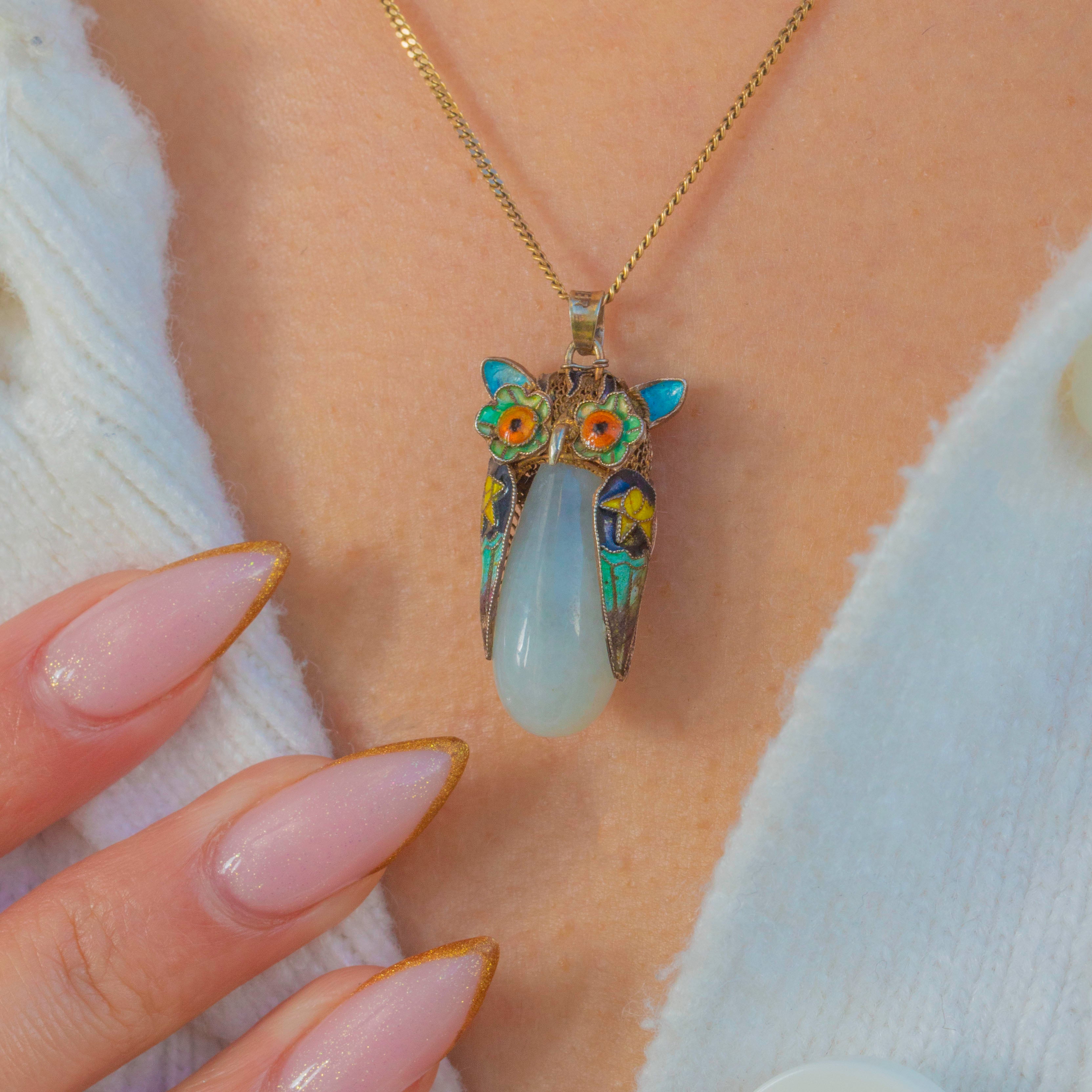 This enchanting antique Chinese owl pendant is a beautiful example of Chinese Export jewellery from the turn of the 20th century. The plump Jadeite Jade drop forms the owl’s body, crowned by finely detailed wings and ears picked out in colourful Cloisonné Enamel.