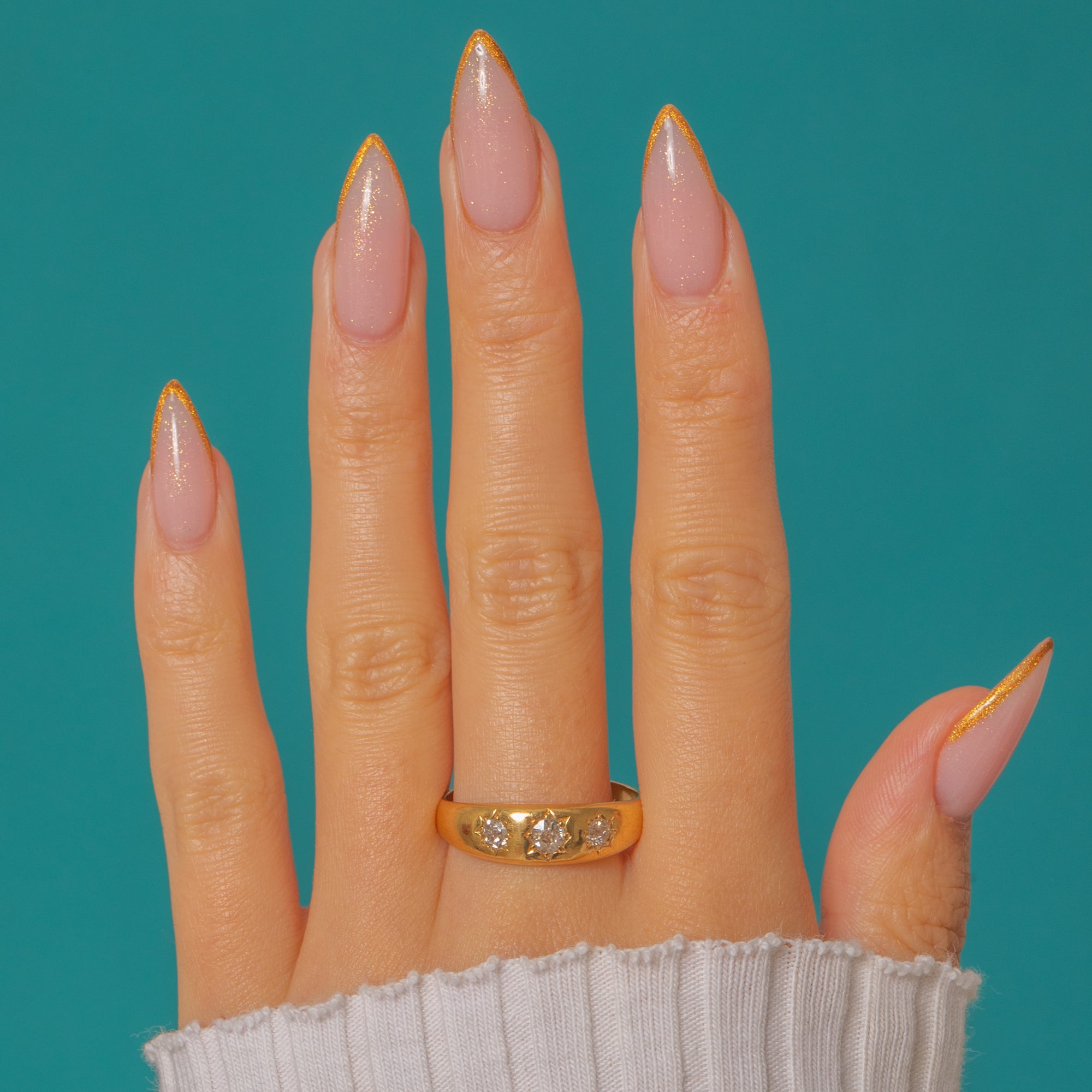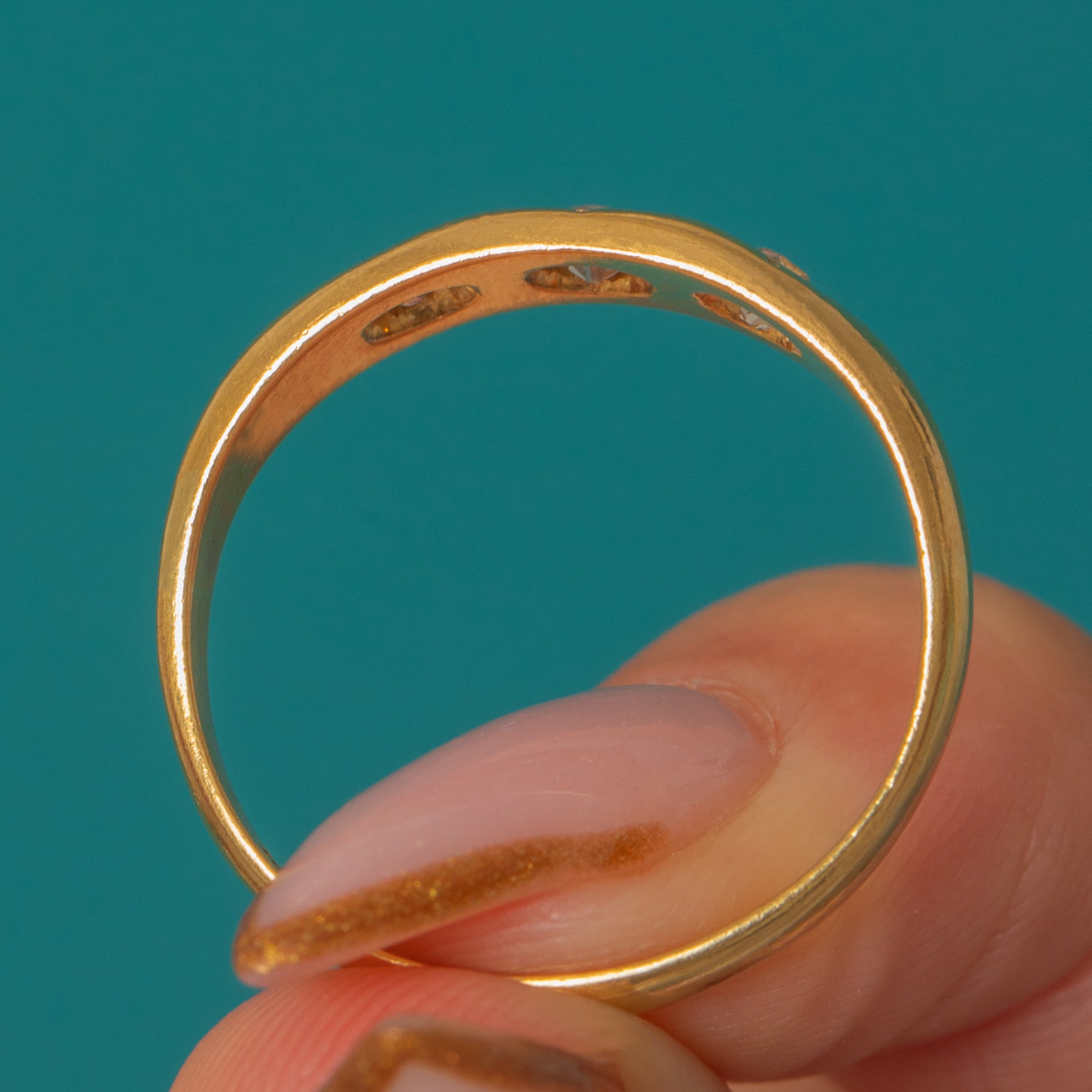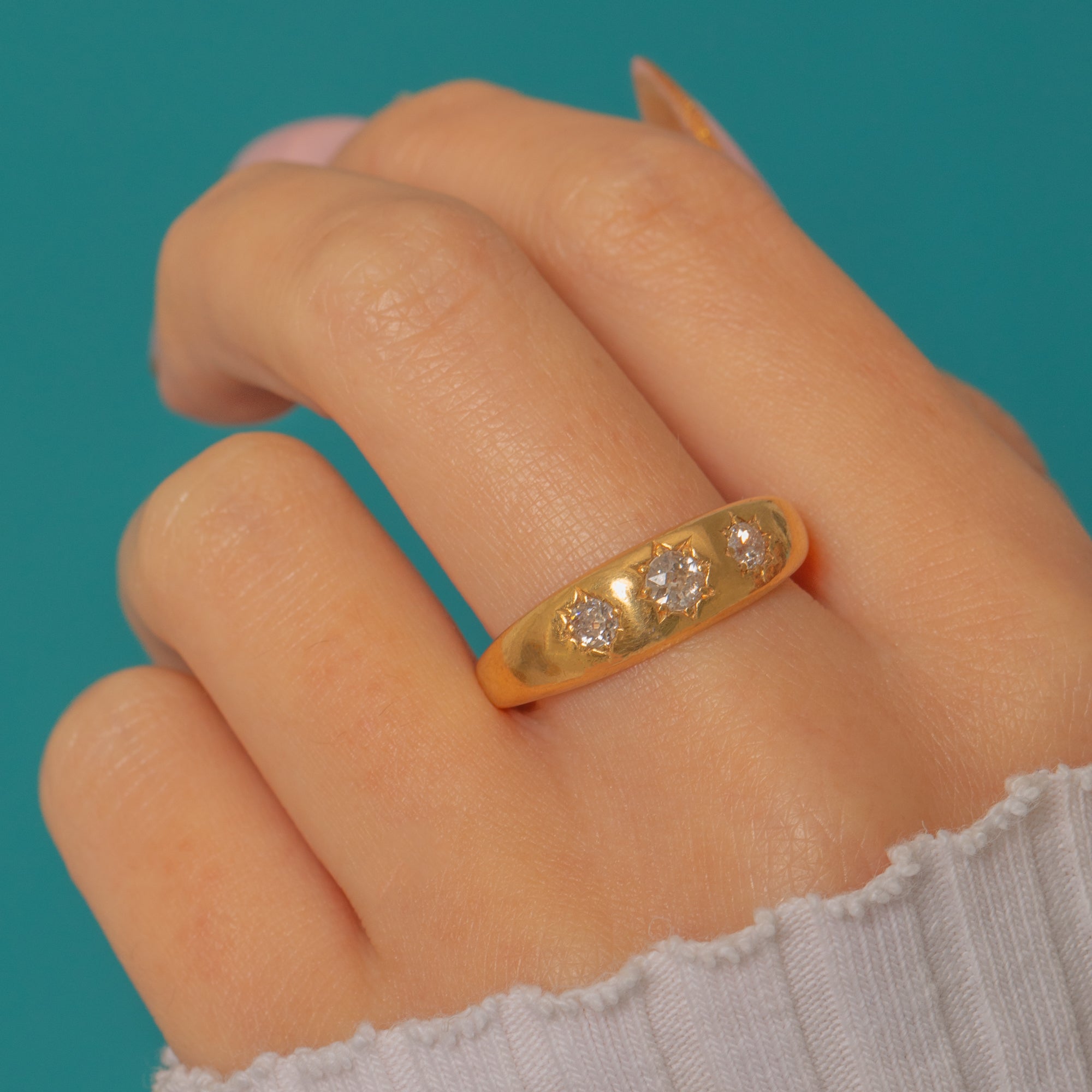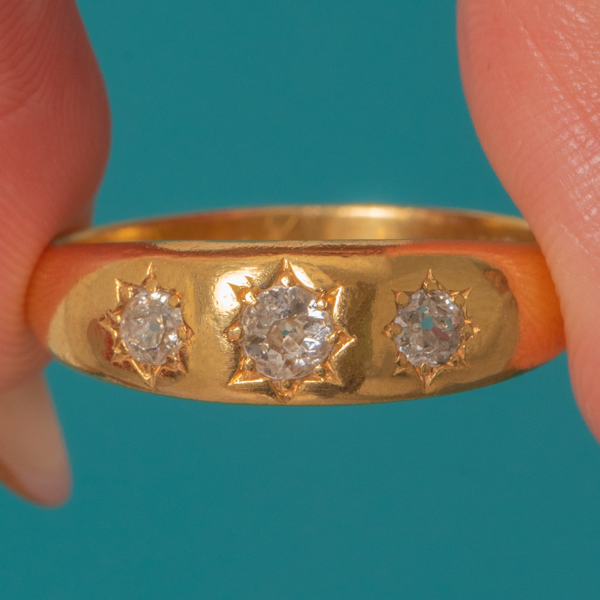 This striking antique gypsy ring is a gorgeous example of early 20th-century design, set with three sparkling antique Diamonds in star-shaped settings.