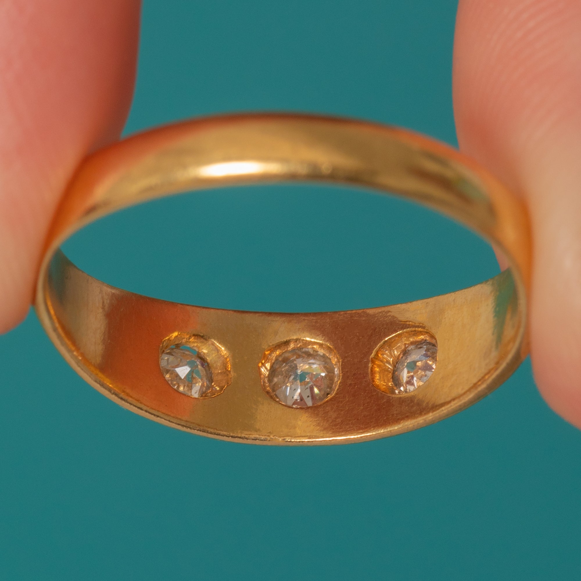 Crafted in solid 18ct Gold, its bold domed band glows with a rich, buttery tone and feels beautifully weighty on the hand. The central Diamond catches the light perfectly, flanked by two smaller stones in a balanced, timeless arrangement.