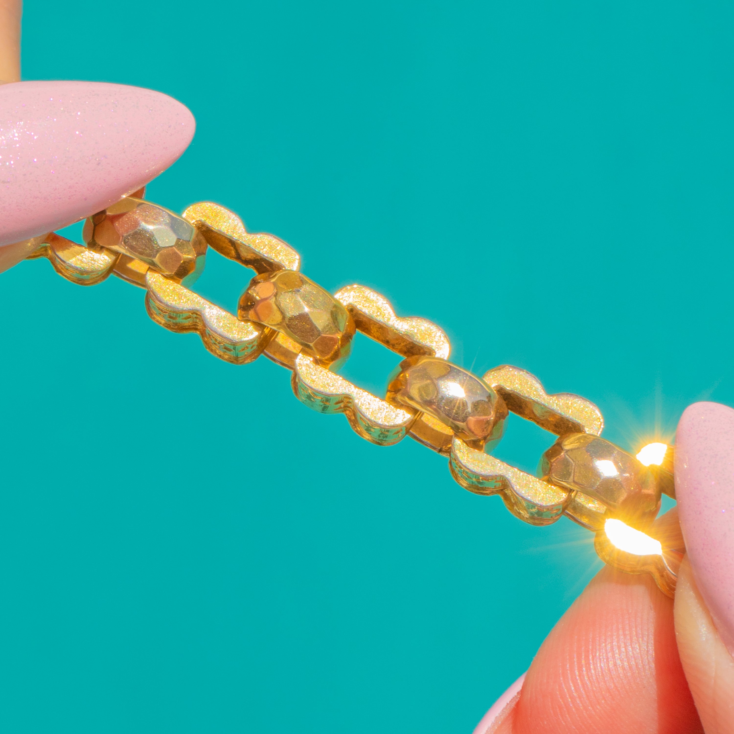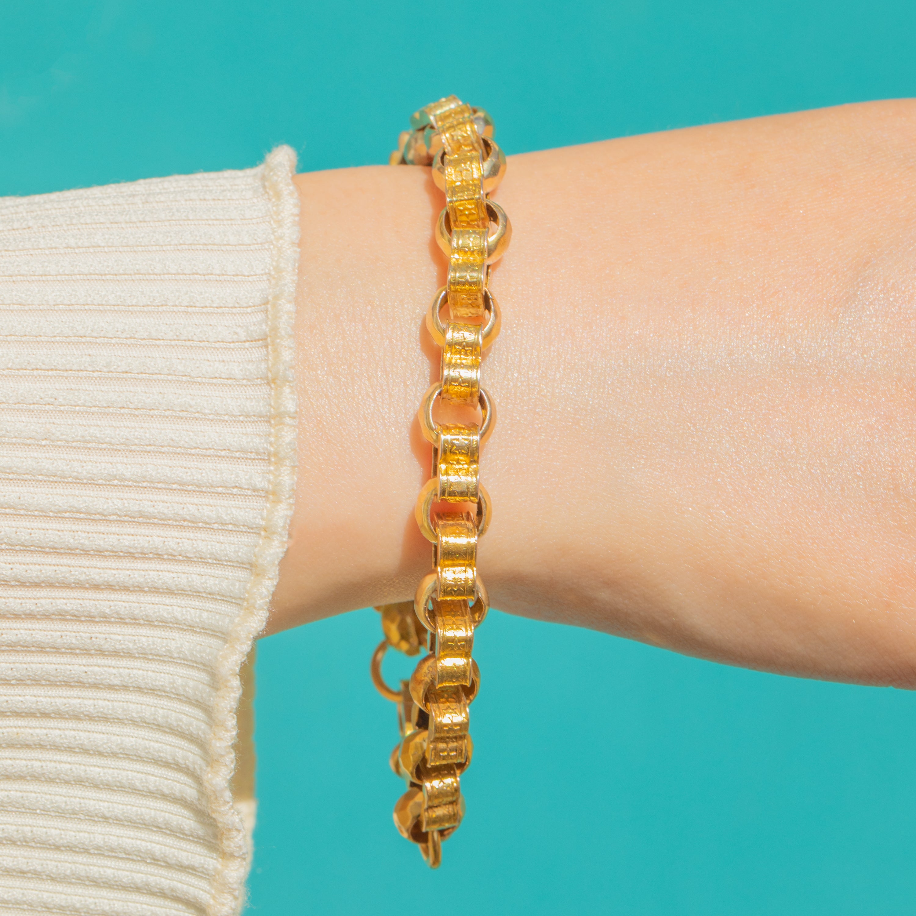 Chunky, sculptural and unmistakably Victorian, this 9ct Gold fancy bracelet is a timeless statement piece. Richly patterned star motif links alternate with chunky, faceted round links, flowing with beautiful articulation and closing with a classic dog clip, delivering that coveted antique silhouette with a satisfyingly substantial feel.