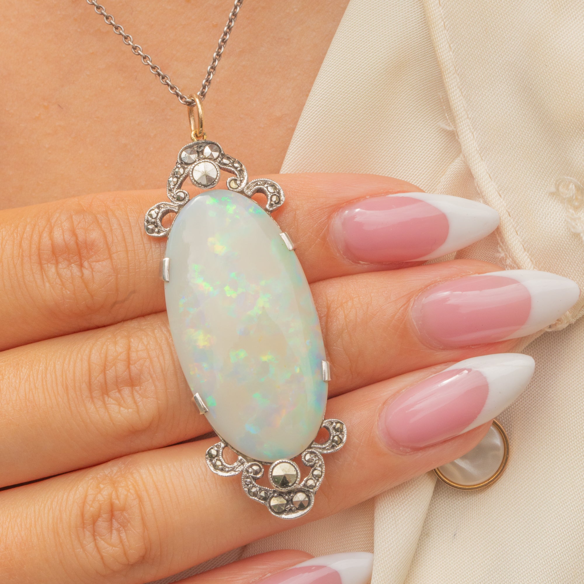 An exquisite Edwardian pendant featuring a stunning 15.40ct solid Opal, set in classic Silver.
