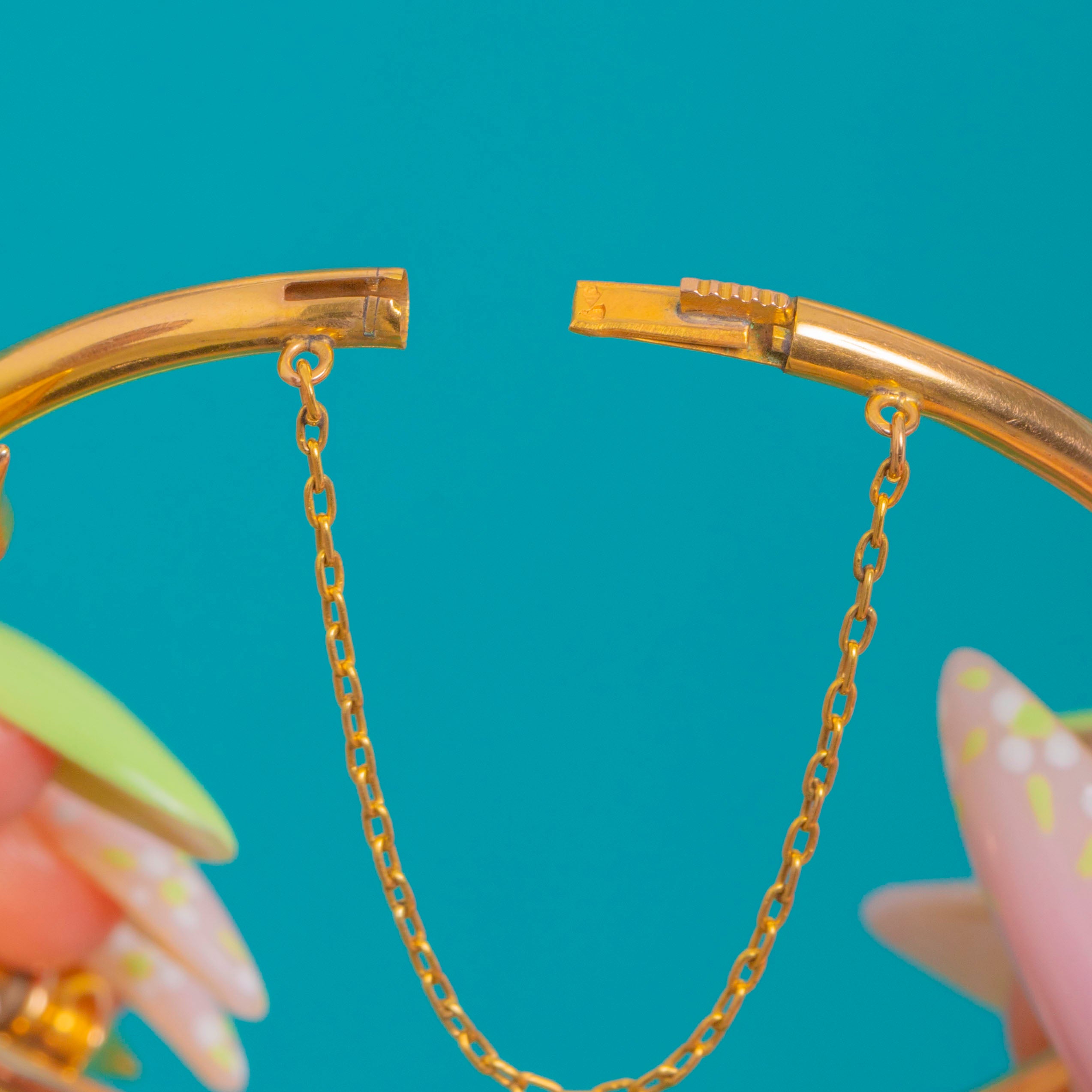 A dreamy Antique French Victorian bangle crafted in rich 18ct Gold and set with glowing Perpignan Garnets. At the centre, three pear-cut Garnet “petals” form a charming shamrock, kissed with a tiny Seed Pearl at the heart. The graceful twin-wire silhouette flows around the wrist, dotted with round Garnet accents for a refined flicker of light, and secures with a hinge and safety chain for ease and confidence.