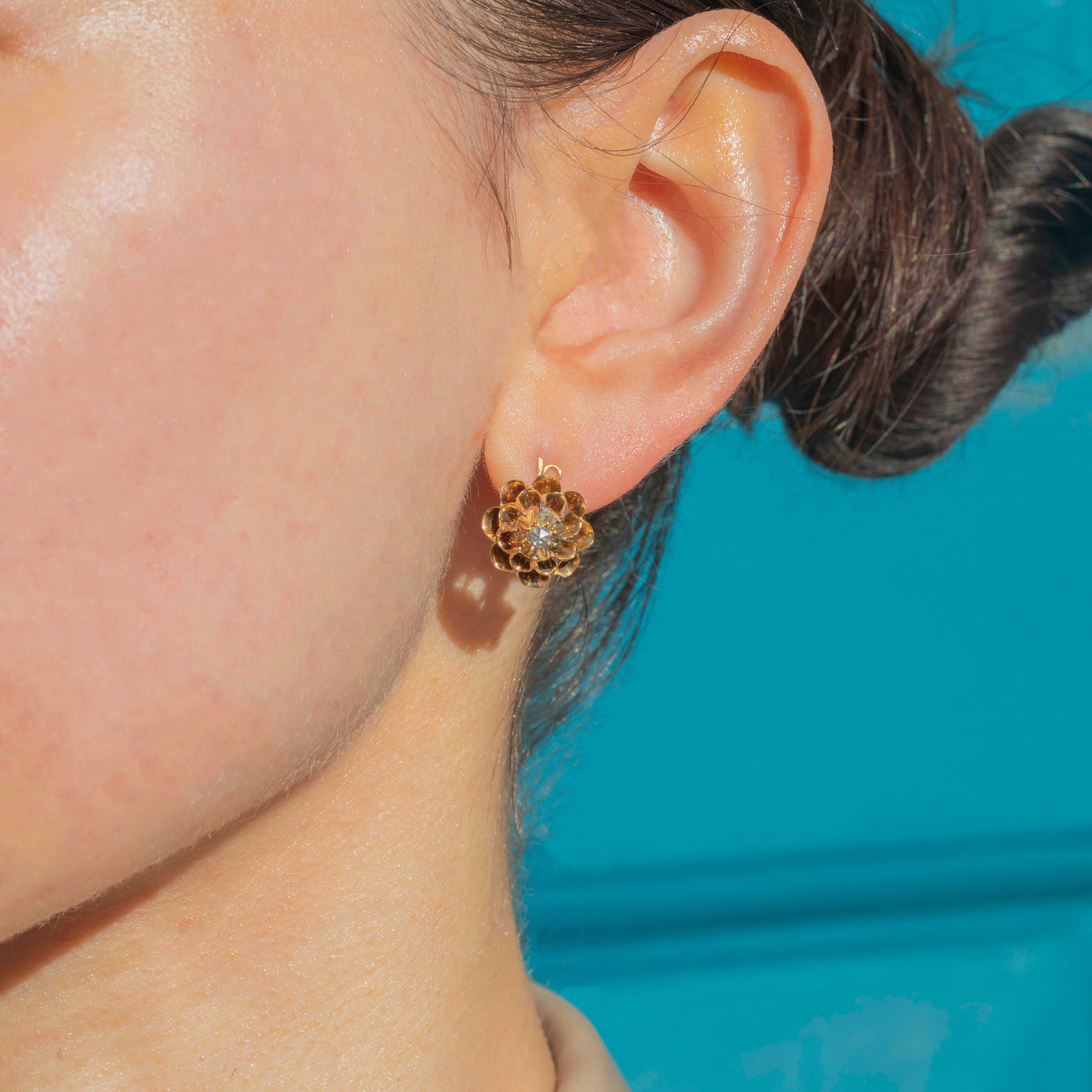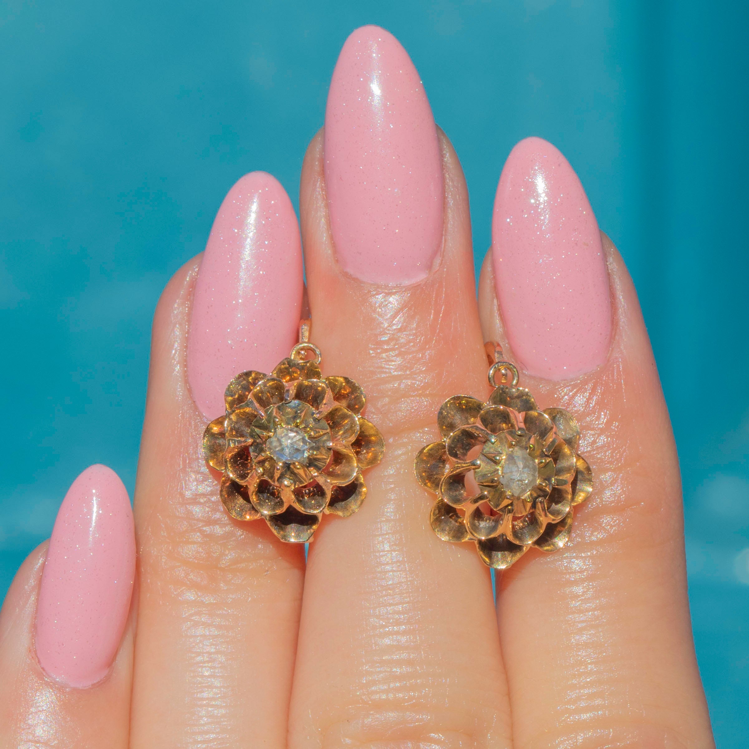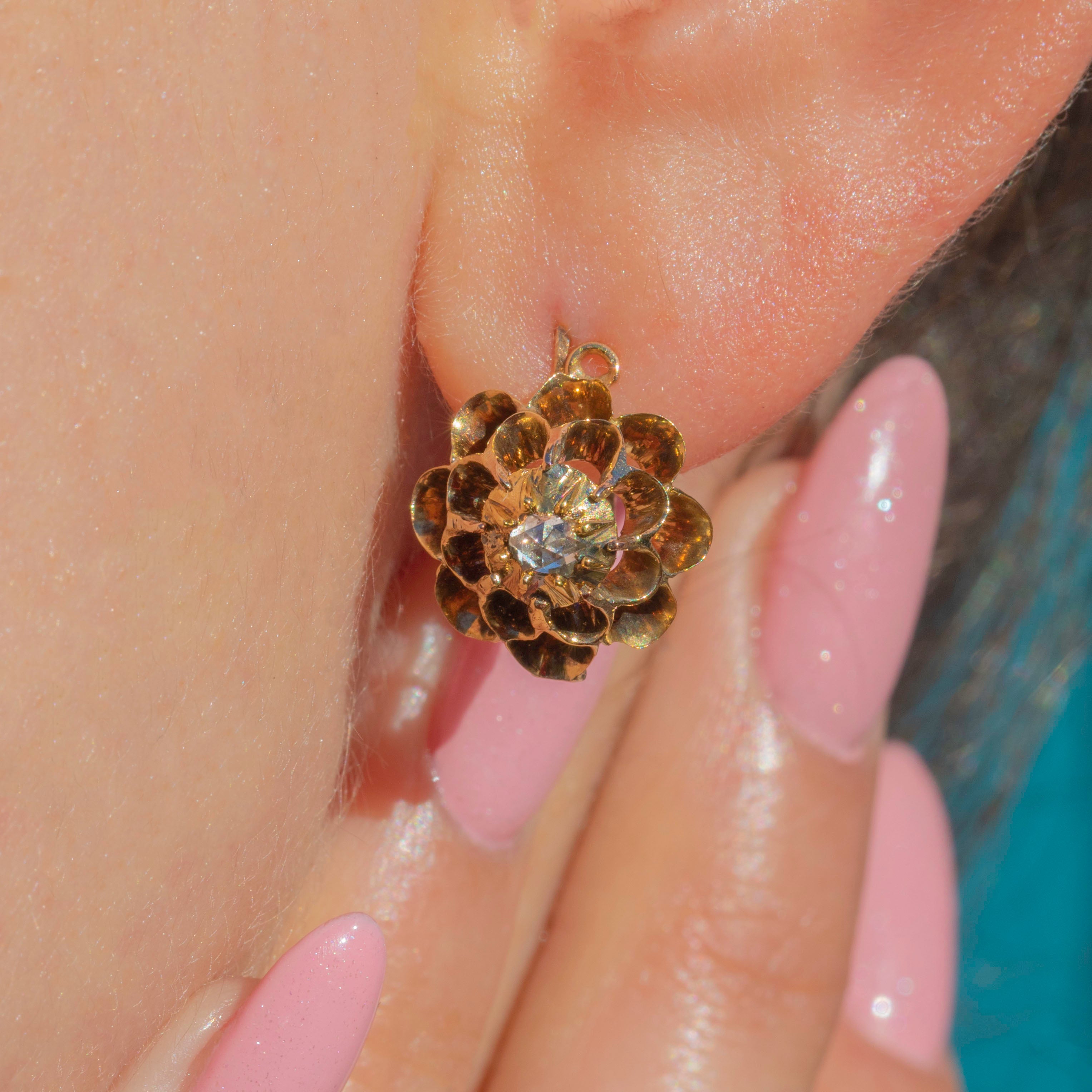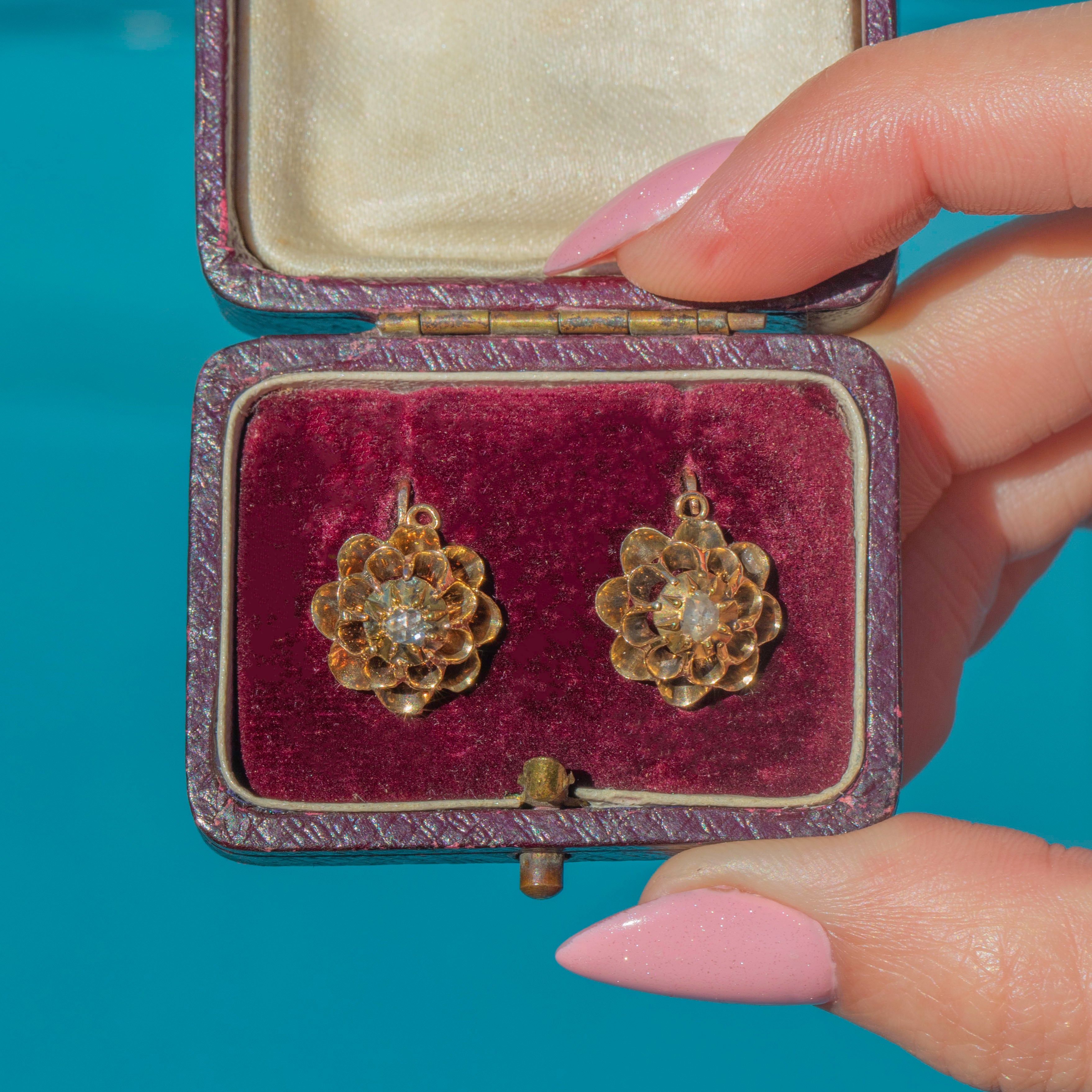 This pair of antique French 18ct Gold Rose-Cut Diamond lever-back earrings are full of life. At the centre of each feminine and floral pair lies a characterful antique rose-cut Diamond, complete with peppery undertones and exquisite facets that sparkle beautifully!