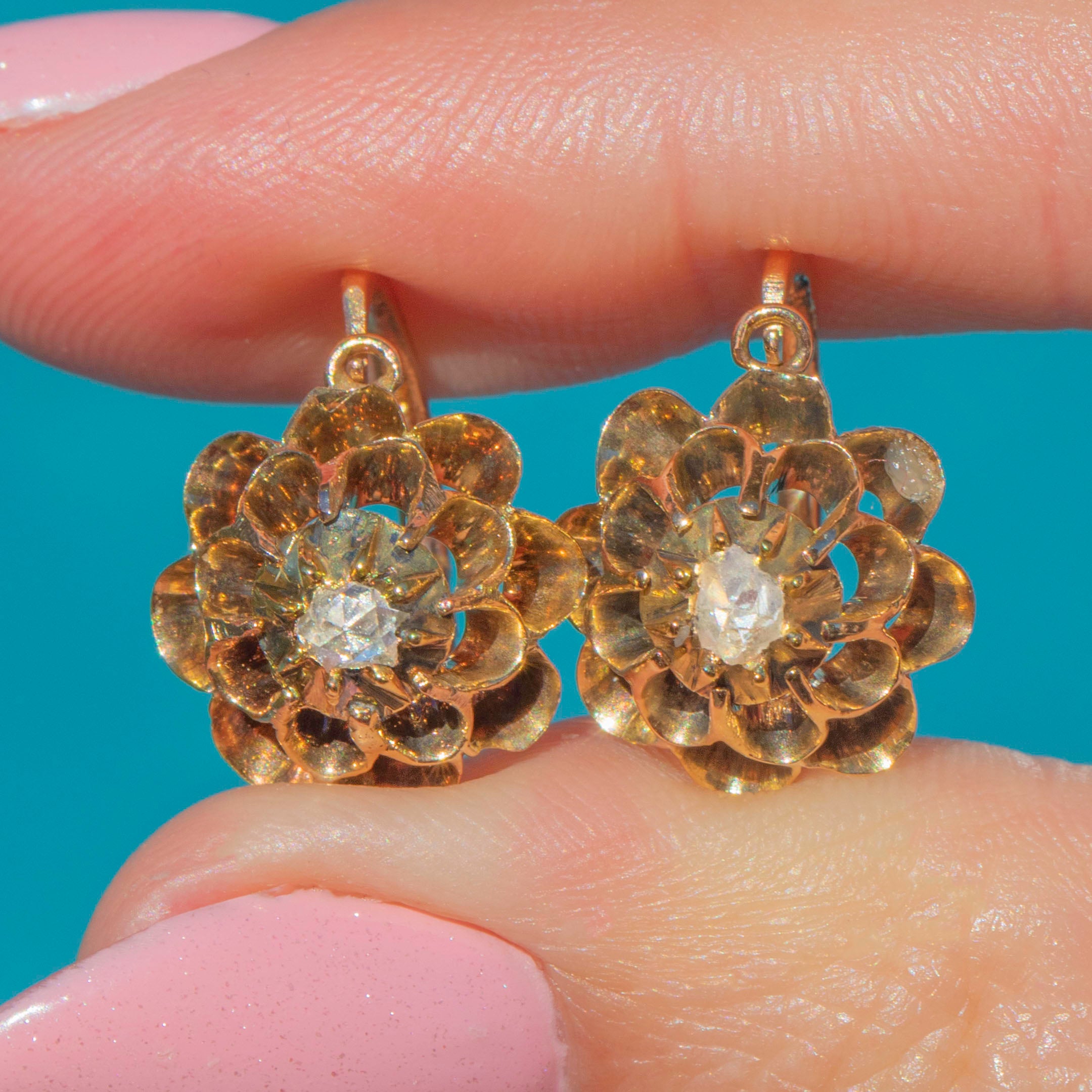 VERY GOOD: These antique French 18ct Gold rose-cut Diamond lever-back earrings are in very good condition. The Gold is brightly saturated with only mild wear at the front of the earrings. The Diamonds are secure in their settings and sparkle wonderfully! These earrings have robust lever backs that allow you to wear them confidently.