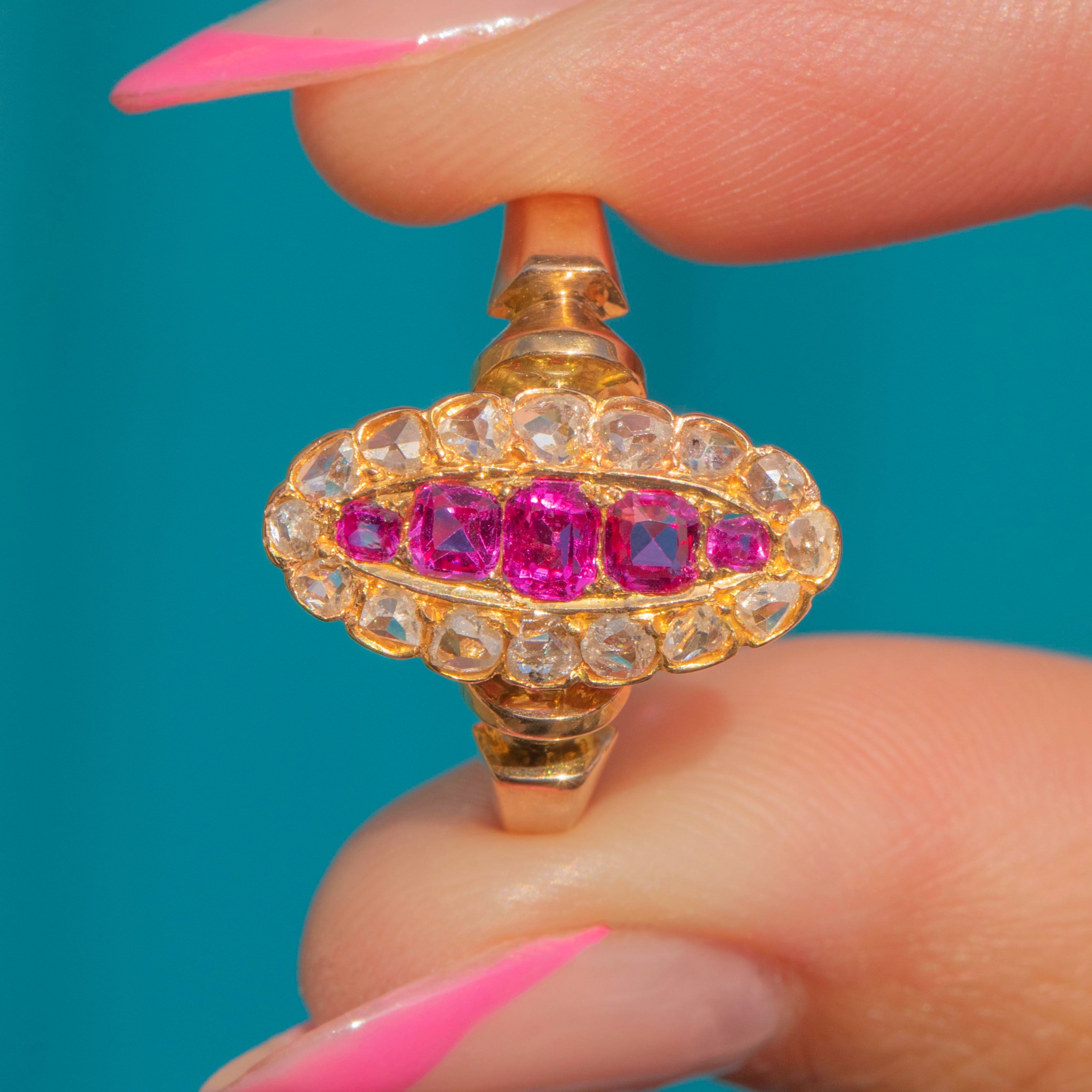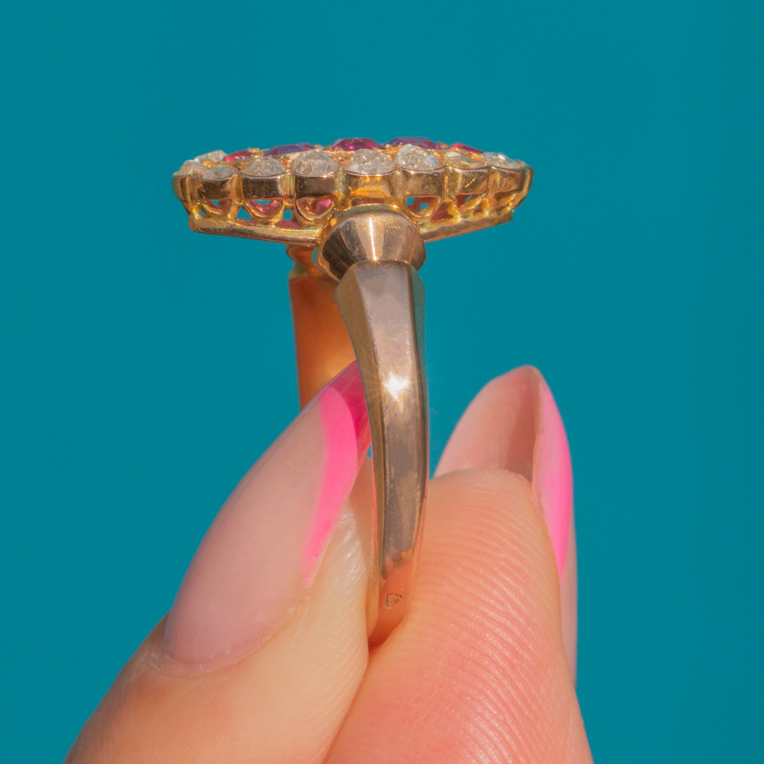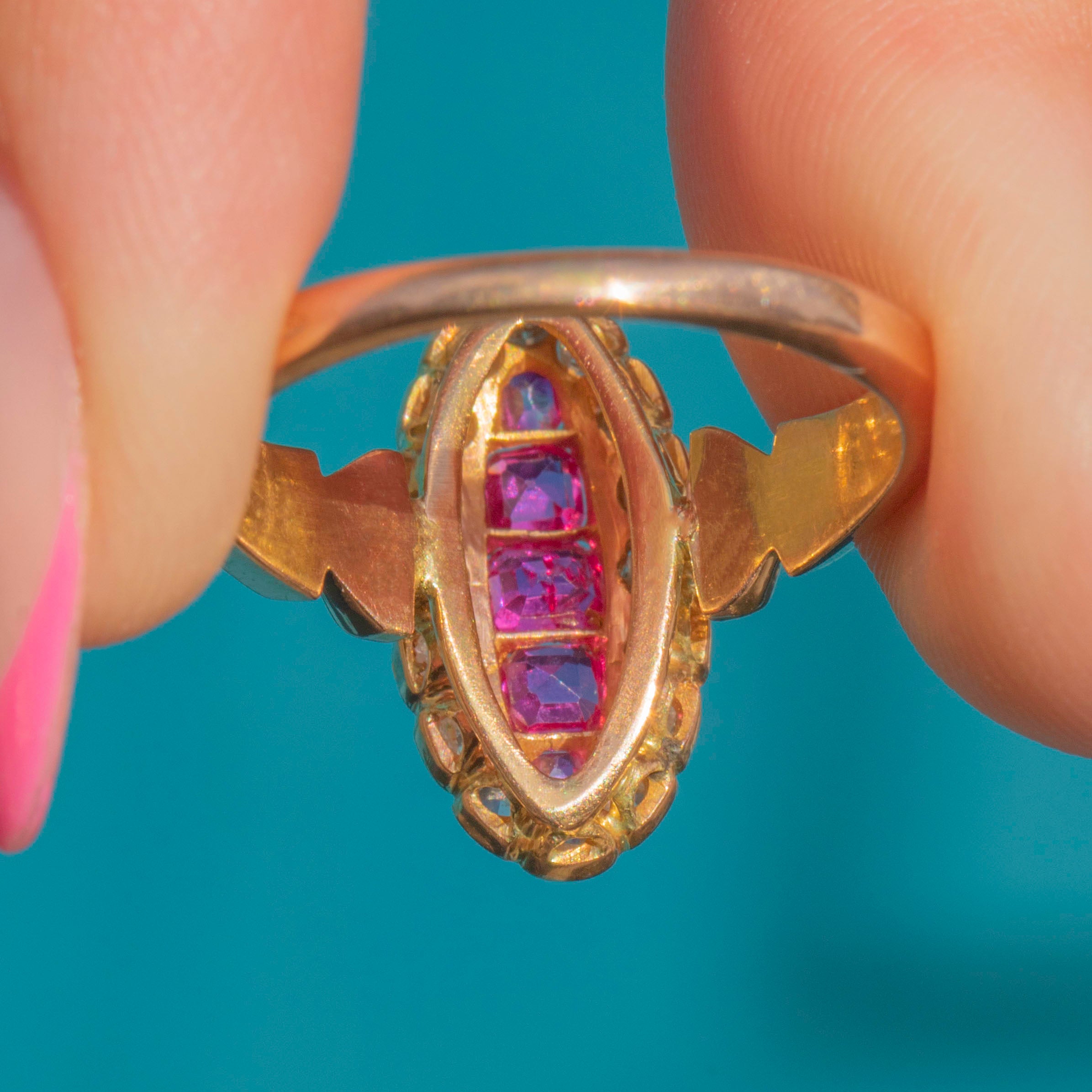 EXCELLENT: This antique French 18ct Gold Diamond Ruby navette cluster ring is in excellent condition. The gemstones are gorgeous with only mild wear and sit securely within her settings, and her 18ct Gold band is robust. With little signs of wear despite her age, she will make a spectacular addition to your collection!