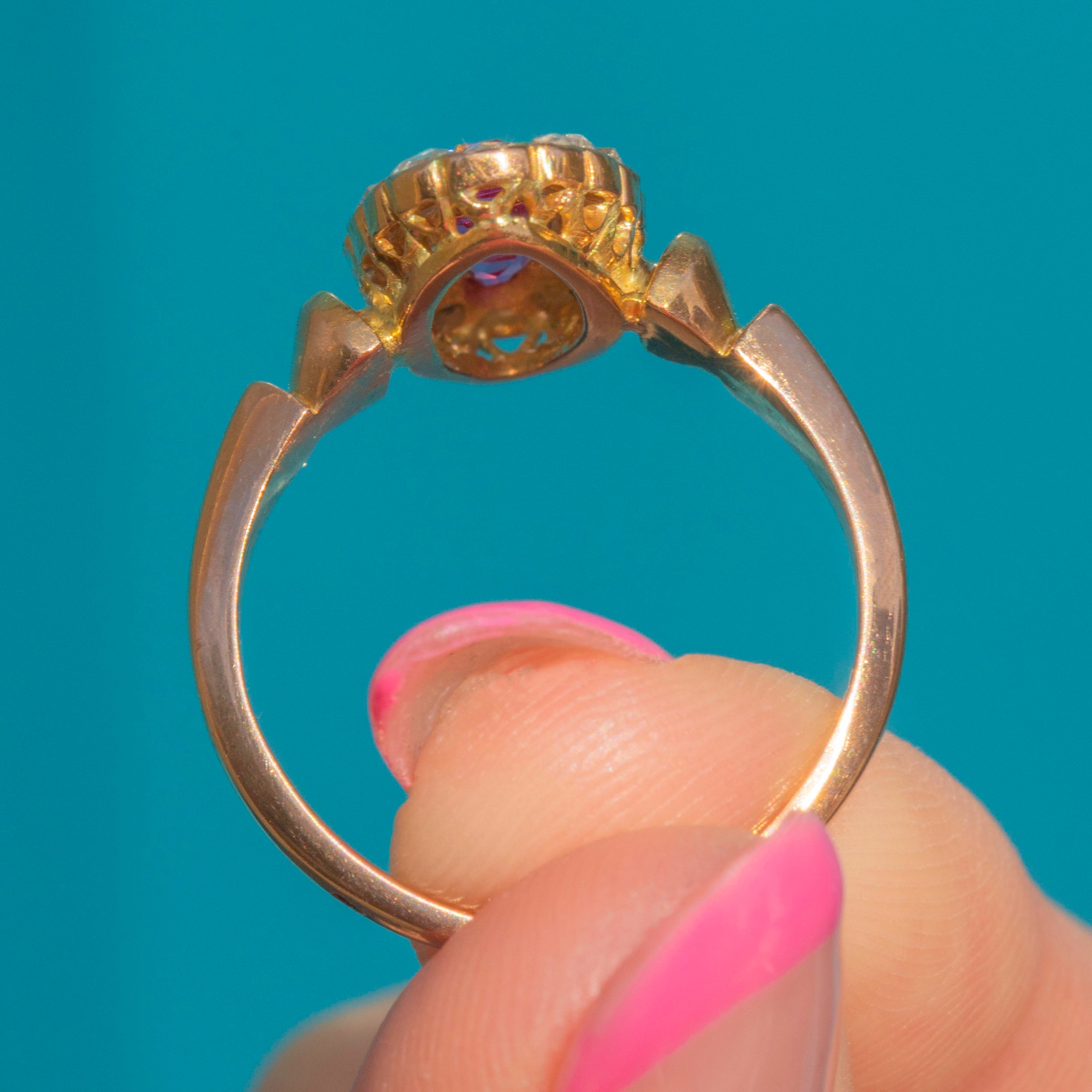 This Victorian cluster ring showcases a dazzling halo of twinkling Diamonds, each expertly cut to catch the light and create a scintillating, ethereal glow. Nestled at the heart of the design is a captivating line of richly saturated Rubies, their deep fuchsia tones adding a bold and seductive contrast.